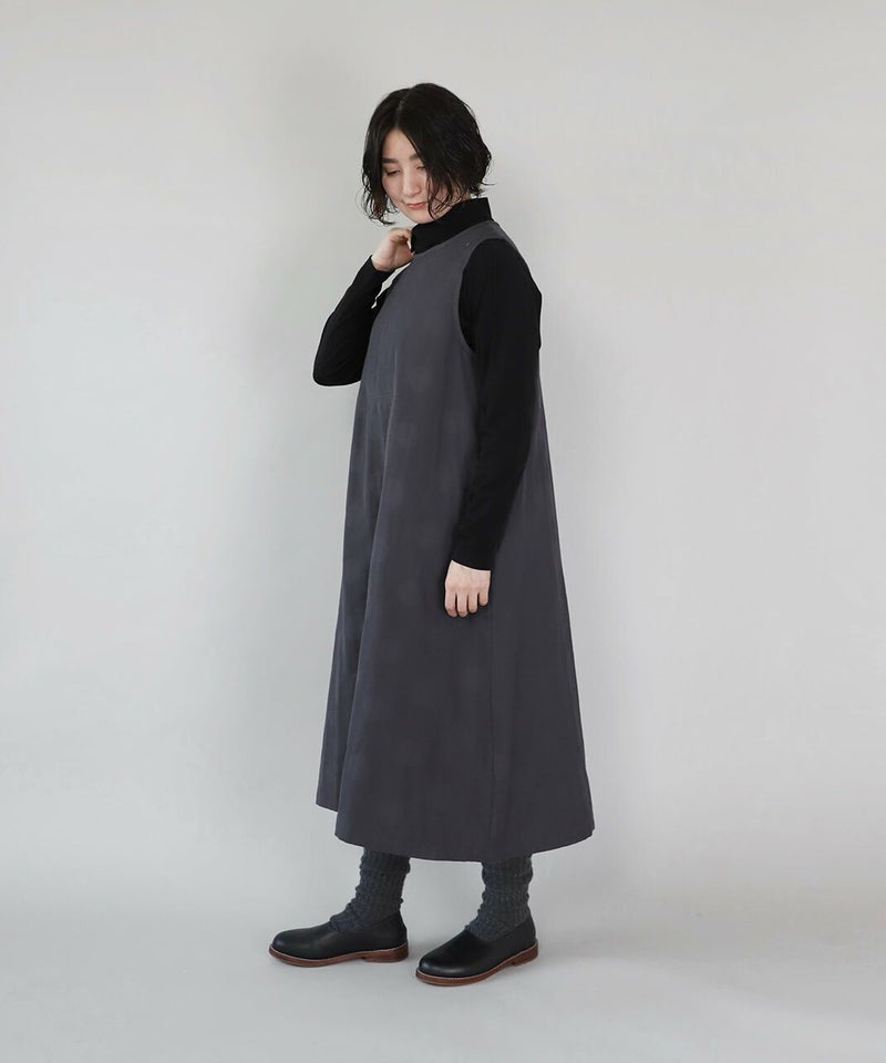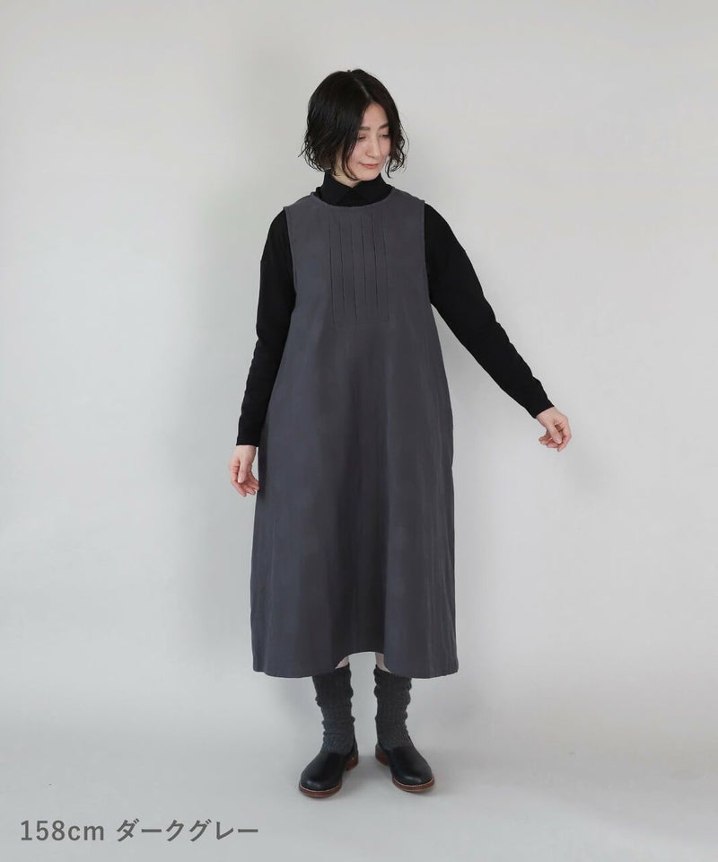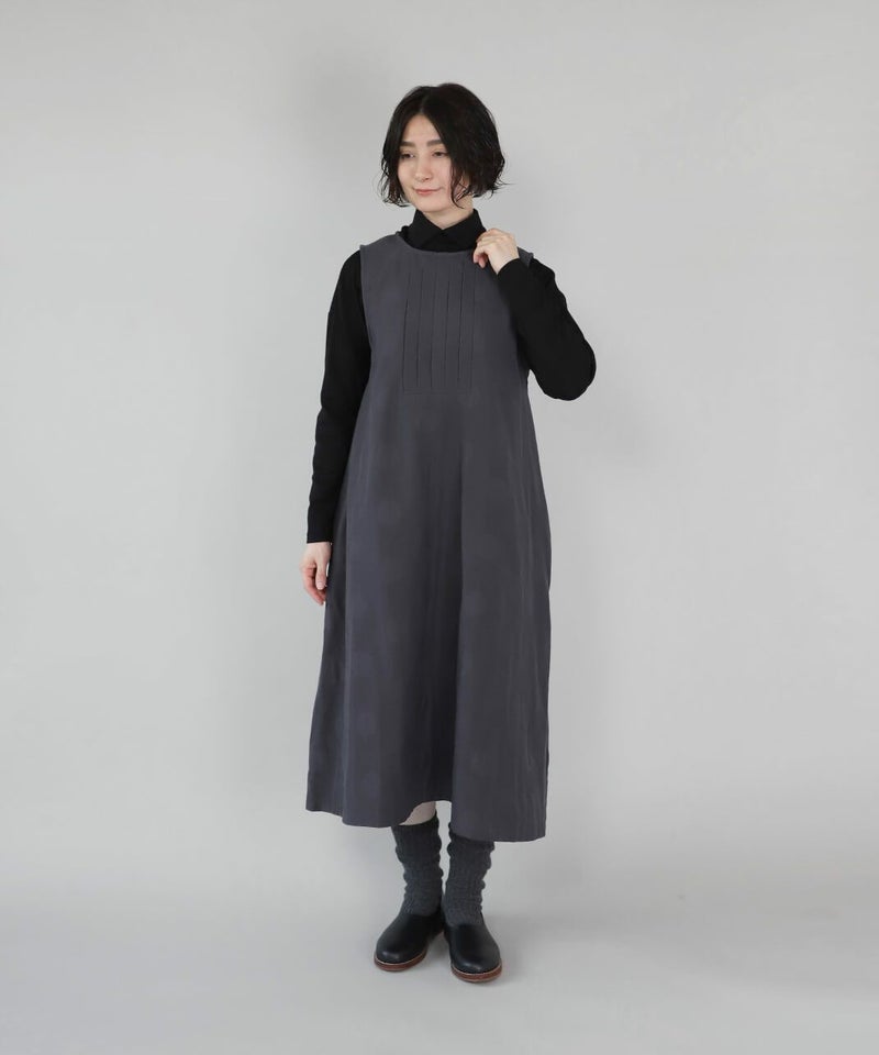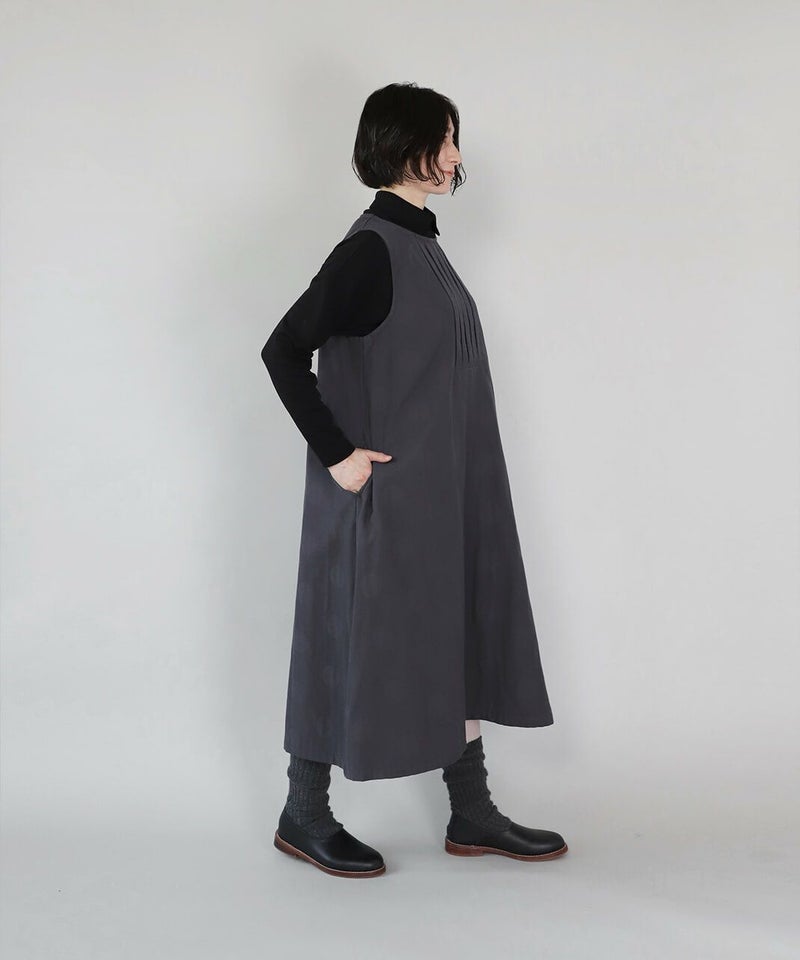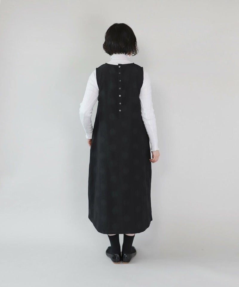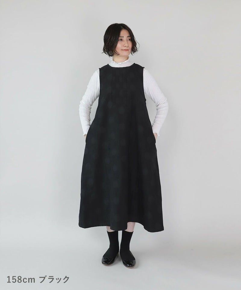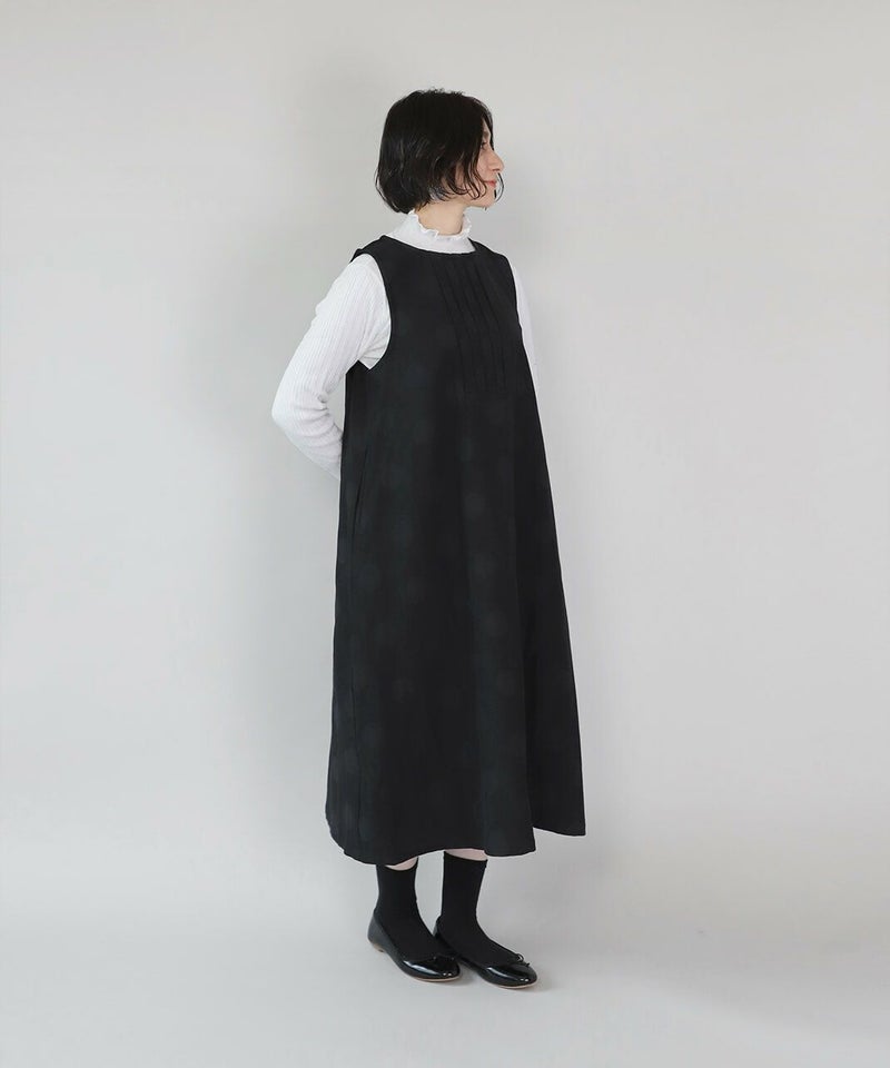 コットンとポリエステルをミックスし、やわらかくさらりと仕立てた二重織り生地を使用したワンピースです。胸元のタック切替えとジャガードドット柄がコーディネートのアクセントになります。ノースリーブデザインは合わせるインナーによって季節を問わず楽しめます。ゆったりとしたフレアシルエットで着心地も快適です。