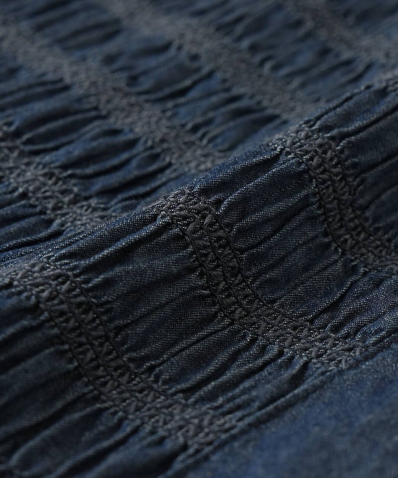 繊細なギャザーに刺繍を施したスモッキング刺繍が、立体感とほどよい華やかさをプラスし、シンプルながらも着映えするデザインに。