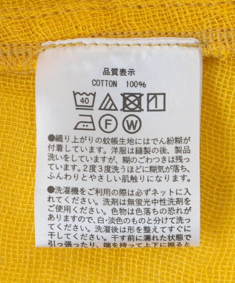 洗うと収縮しますが、何回も洗ううちにふんわりとした風合いが出て馴染んでいきます。蚊帳生地独特の風合いをお楽しみください。