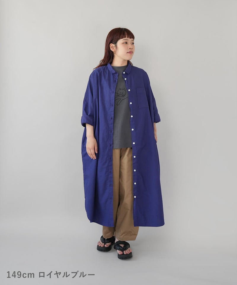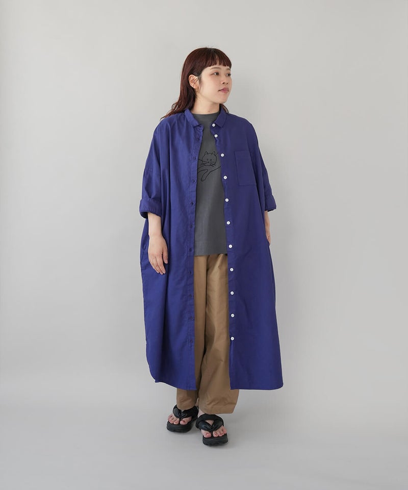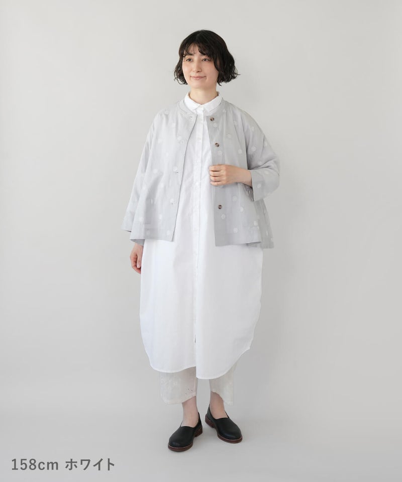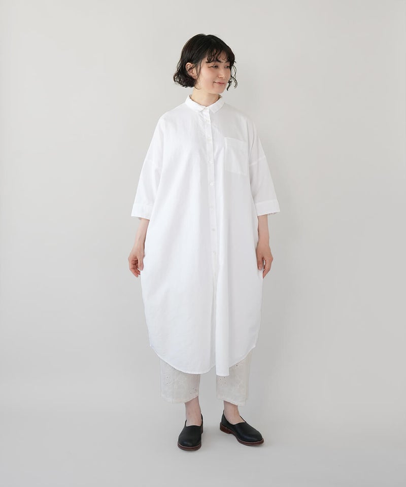 首元はベーシックなレギュラー襟で、きちんと感を残しながらも、肩はドロップショルダーでゆったりとした着心地です。身幅にもほどよくゆとりを持たせ、裾に向かってすとんと落ちるボックスシルエットに。