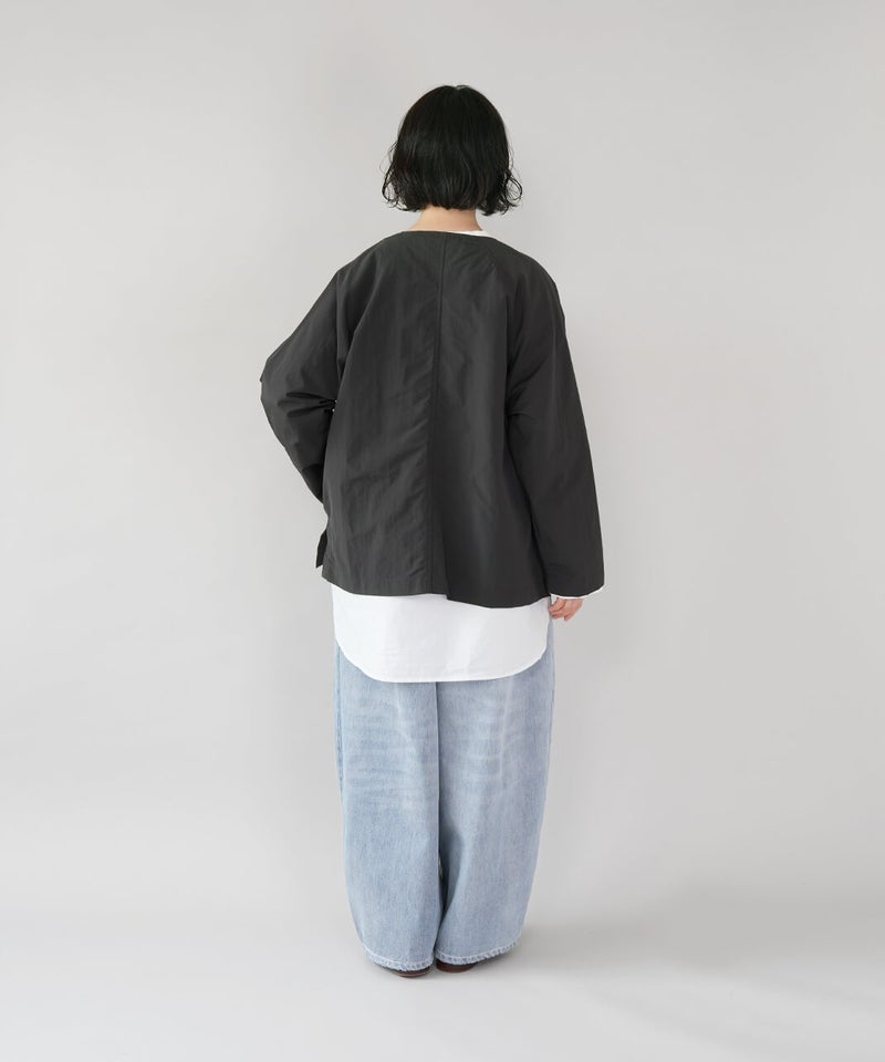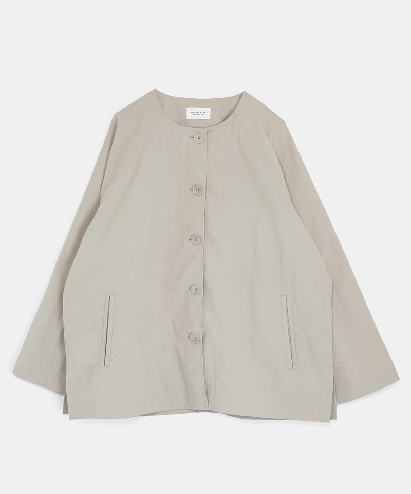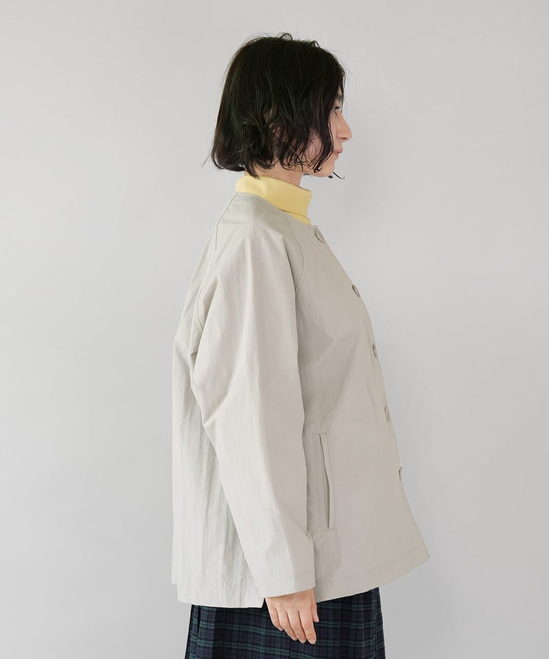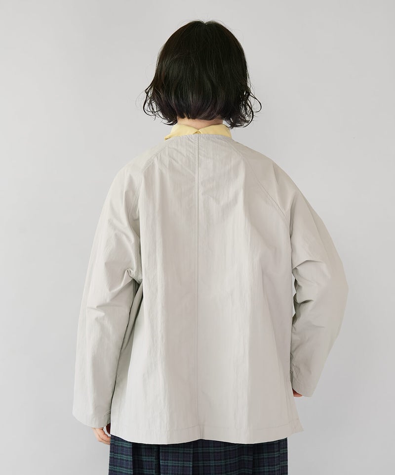 撥水加工が施されたナイロン生地のノーカラージャケットです。