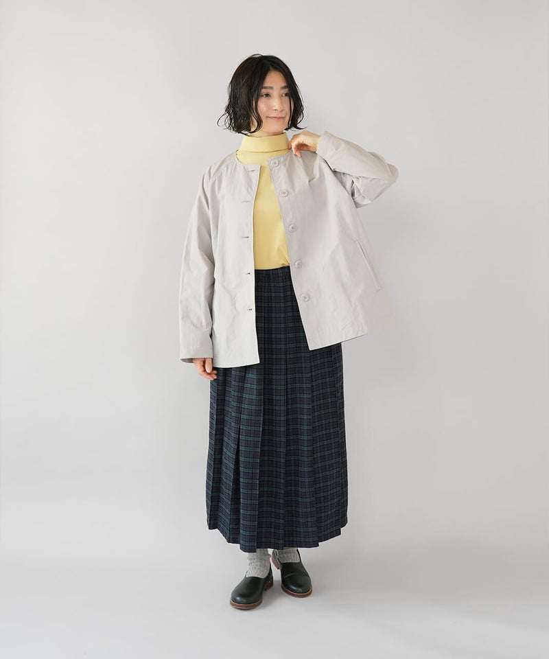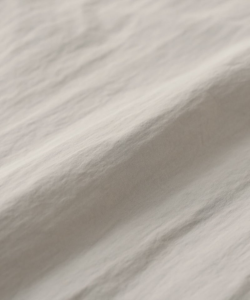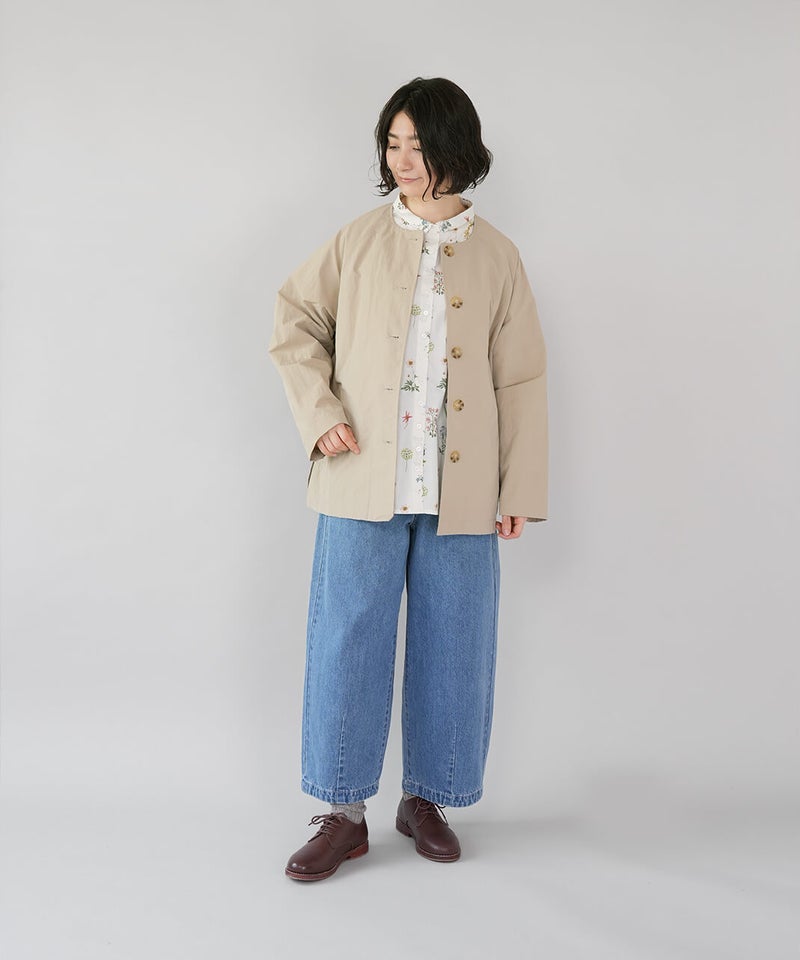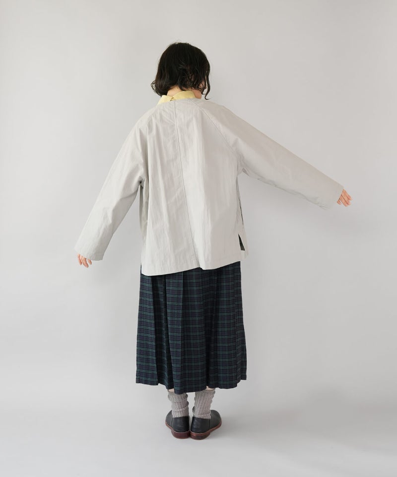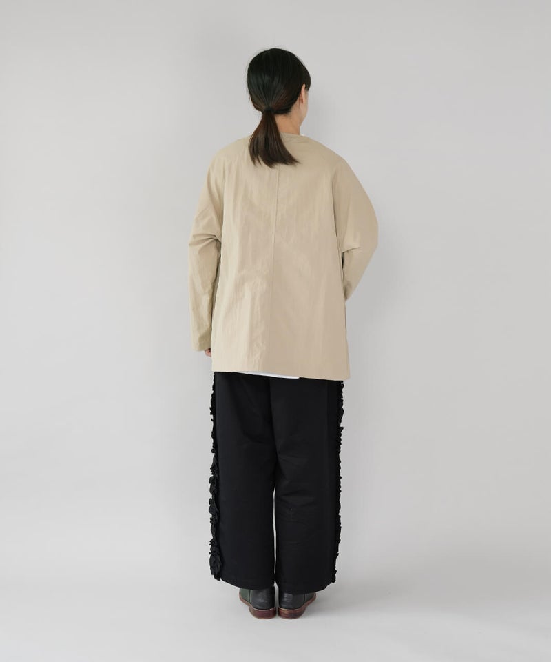 撥水加工が施されたナイロン生地のノーカラージャケットです。