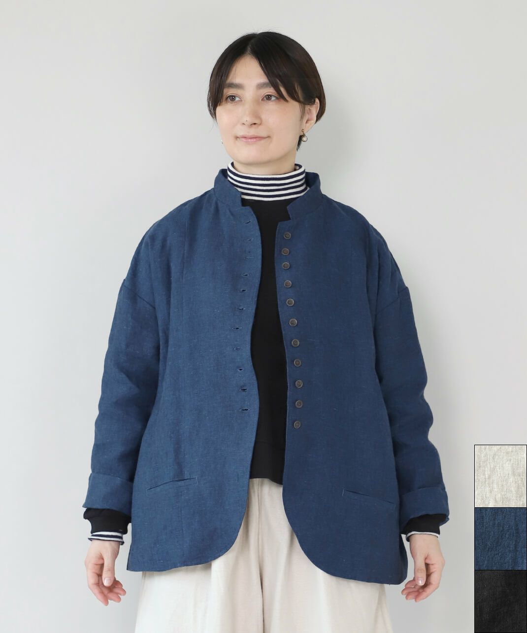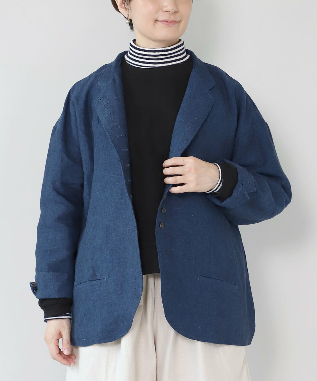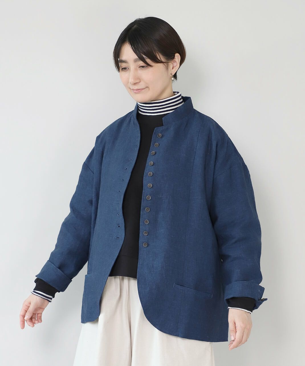 丈夫な9番手リネン生地を使用した多ボタンジャケットです。