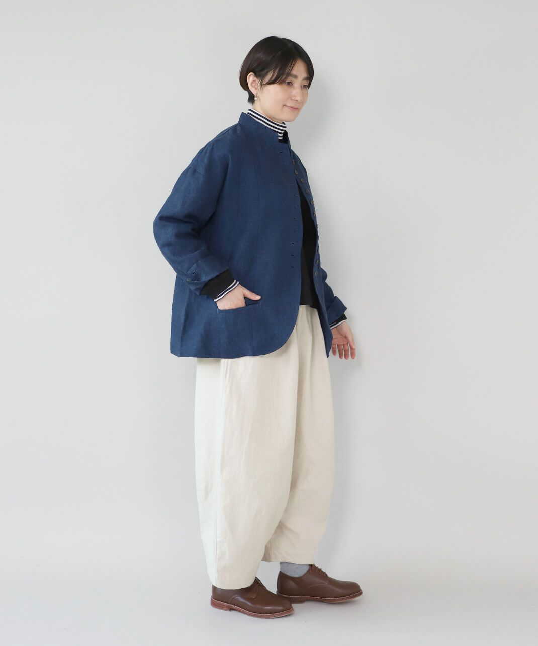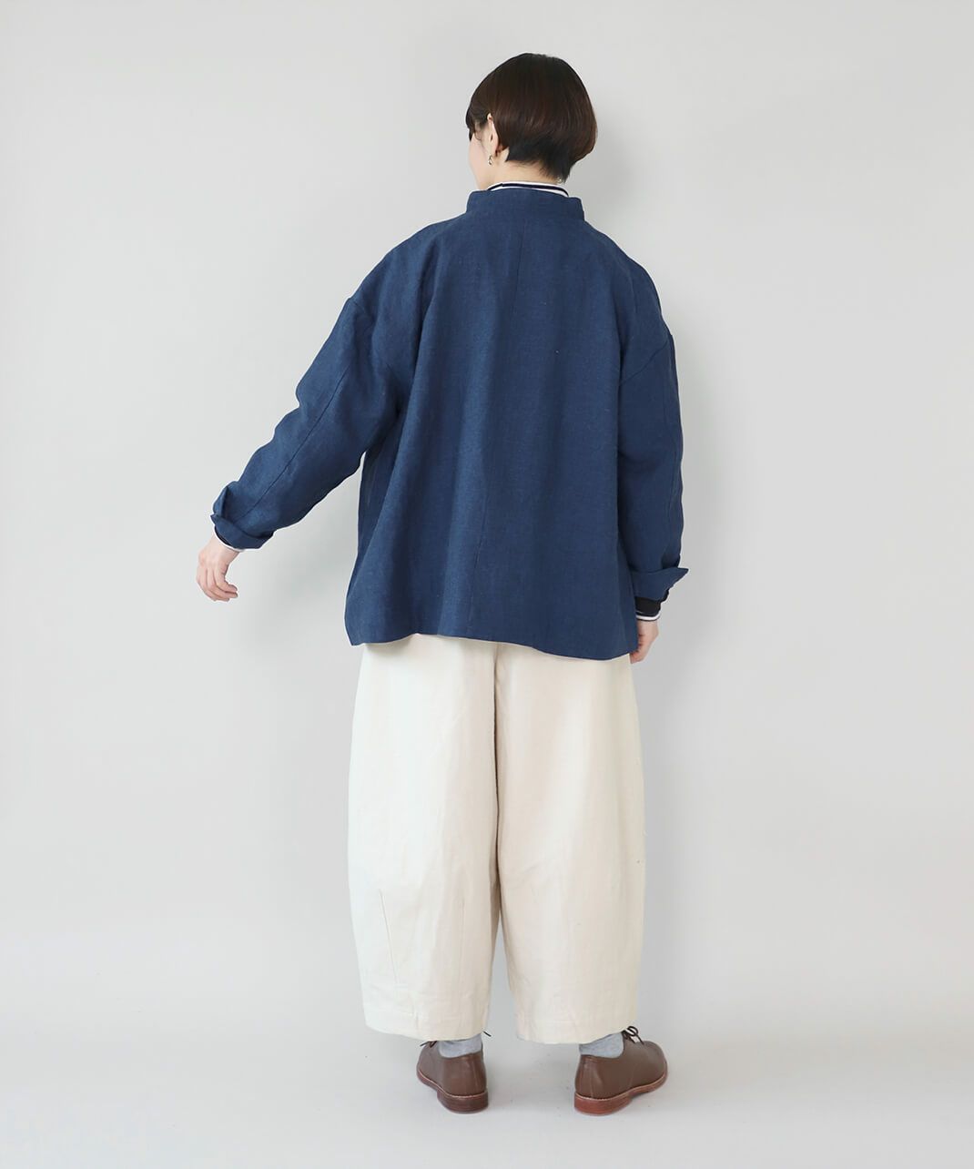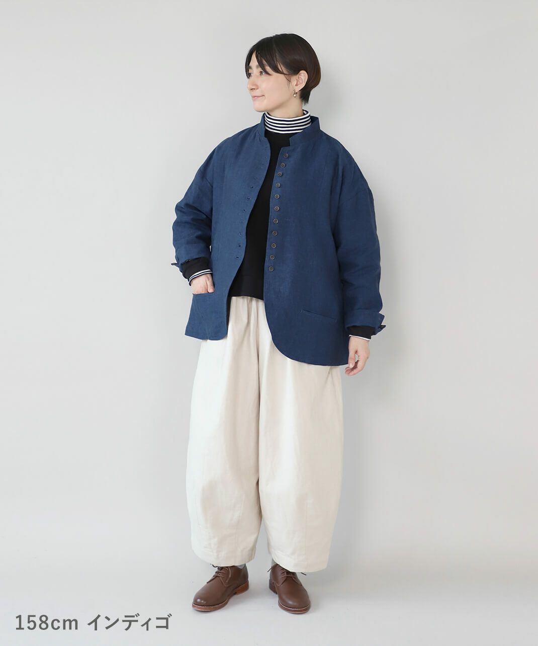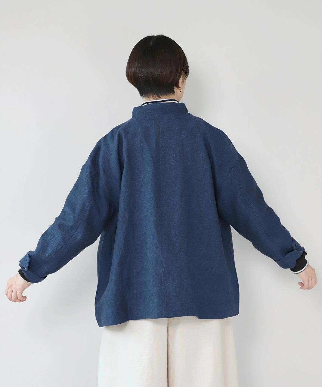 スタンドカラーは首元を引き締め、少しかっちりとした印象を与えます。