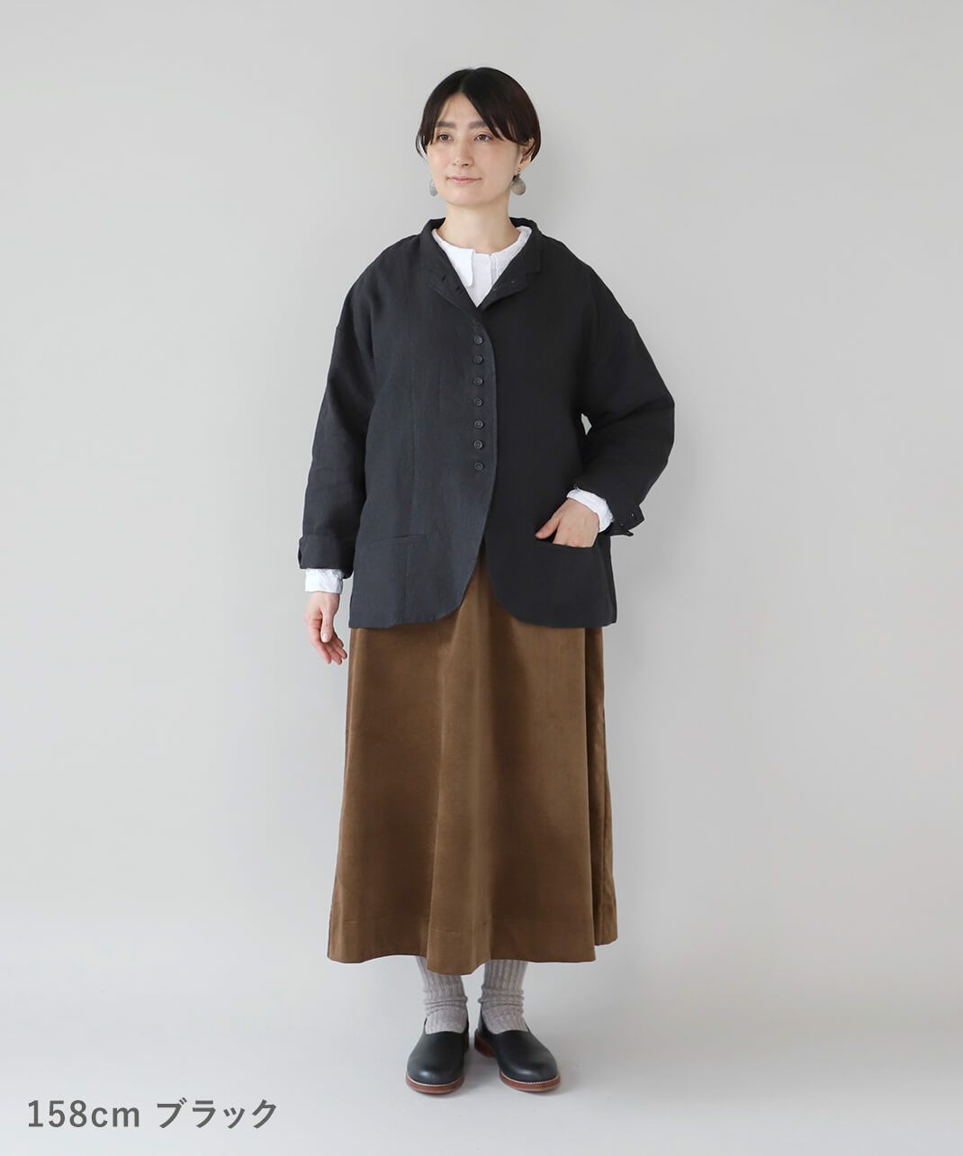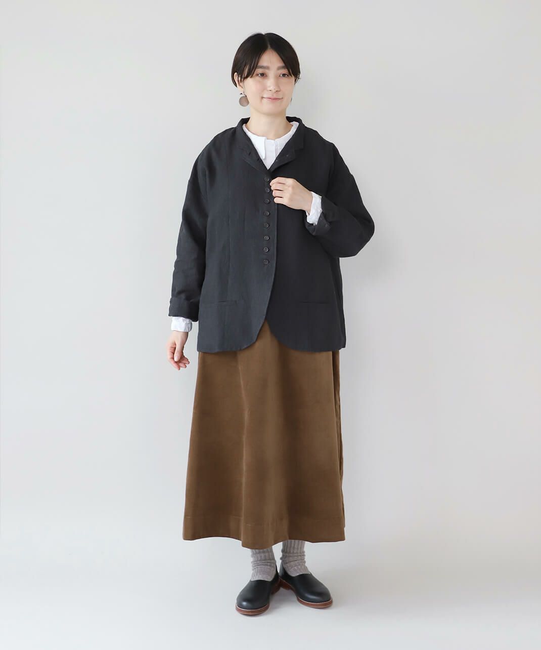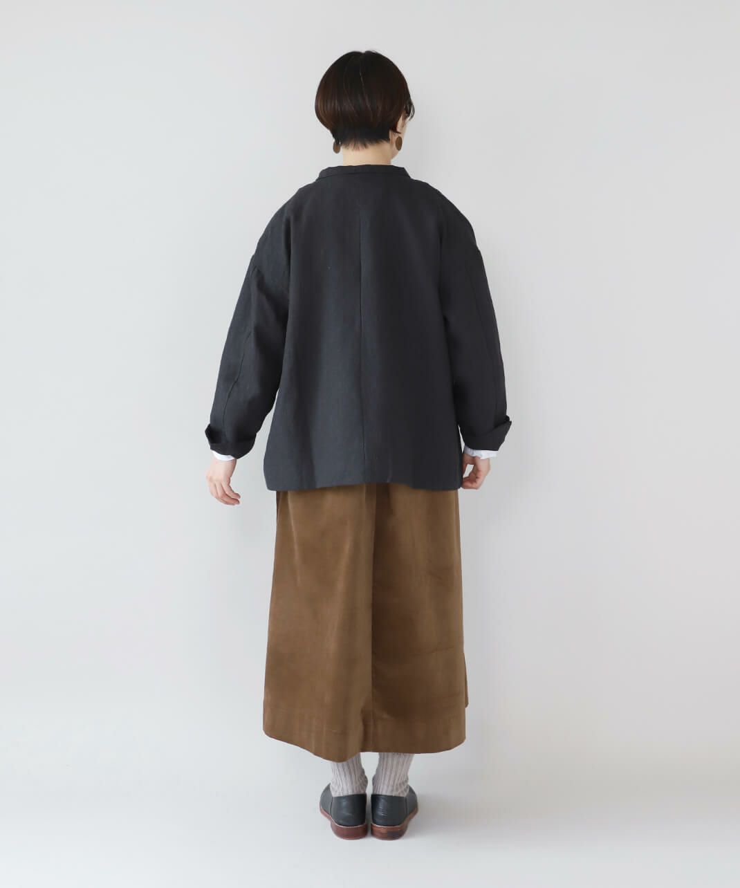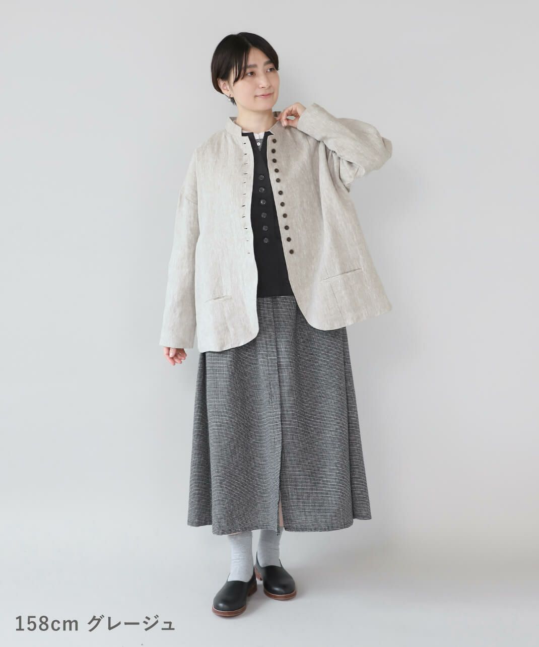 スタンドカラーは首元を引き締め、少しかっちりとした印象を与えます。