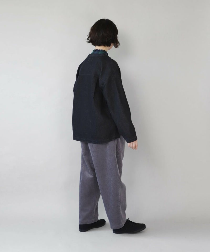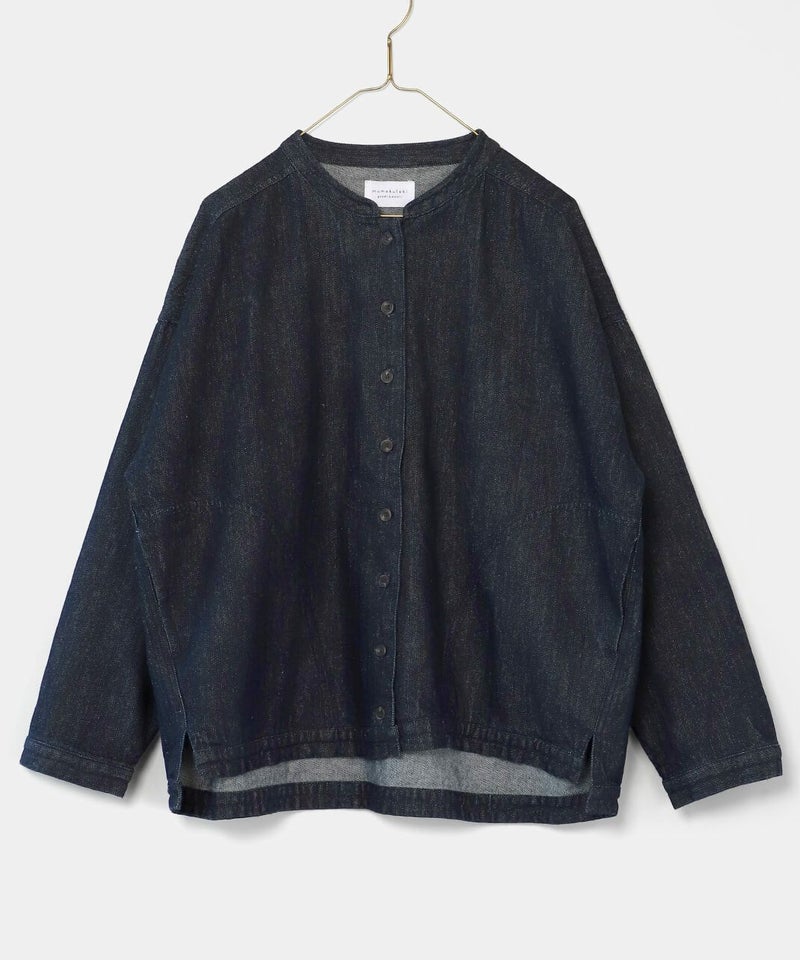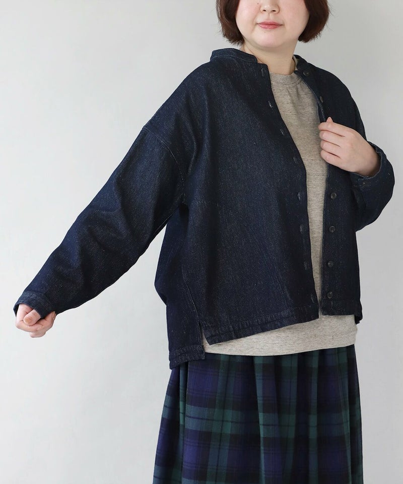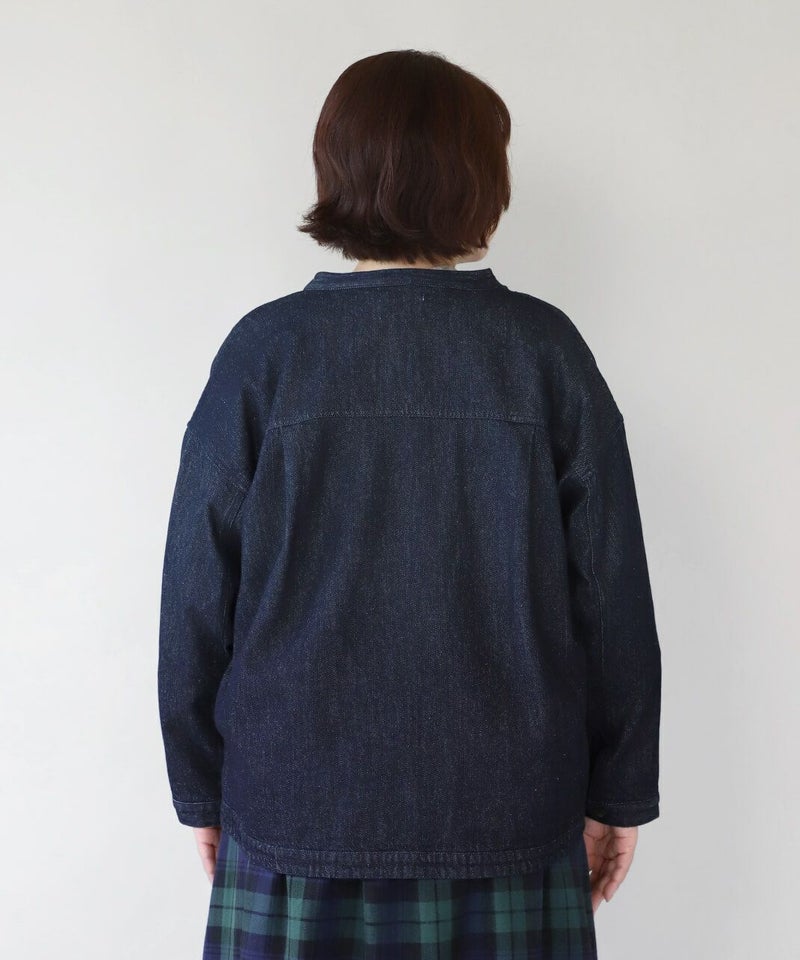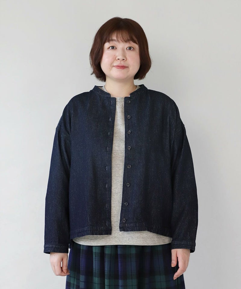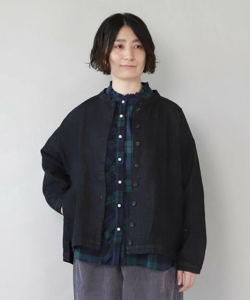 肌触りが良く、吸収性に優れたコットンリネンデニムを使用したジャケットです。 すっきりとしたマオカラーにワイドな身頃とドロップショルダーでゆったりとした着心地。後ろヨークにタックを入れ動きやすく仕上げました。前後差のある裾が気になるラインをカバーしてくれます。幅広いスタイリングに取り入れやすく1枚あると重宝します。 ※染料の特性上、色移りする可能性があります。ご注意下さい。 ※天然素材の為、ネップがある場合がございます。織り傷ではありませんのでご了承ください。