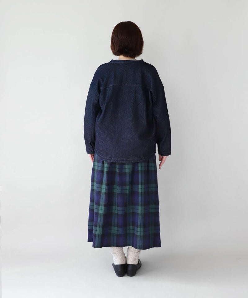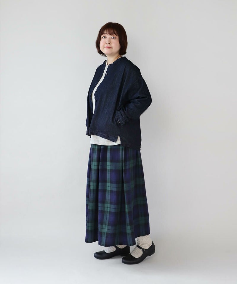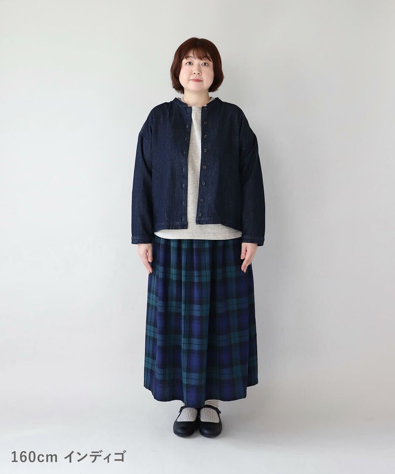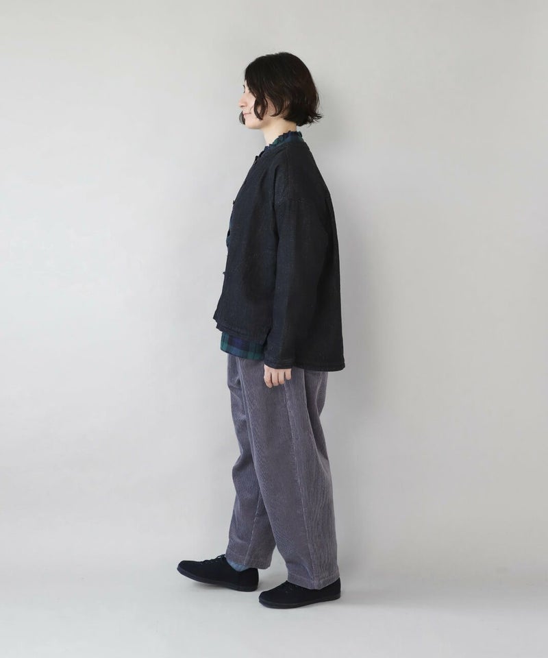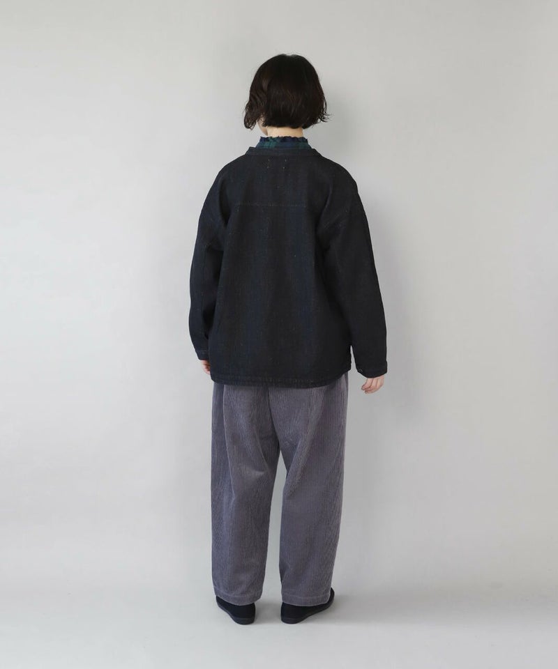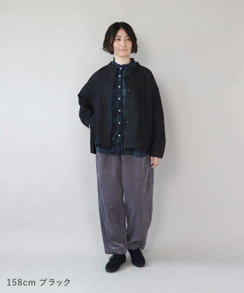 肌触りが良く、吸収性に優れたコットンリネンデニムを使用したジャケットです。 すっきりとしたマオカラーにワイドな身頃とドロップショルダーでゆったりとした着心地。後ろヨークにタックを入れ動きやすく仕上げました。前後差のある裾が気になるラインをカバーしてくれます。幅広いスタイリングに取り入れやすく1枚あると重宝します。 ※染料の特性上、色移りする可能性があります。ご注意下さい。 ※天然素材の為、ネップがある場合がございます。織り傷ではありませんのでご了承ください。