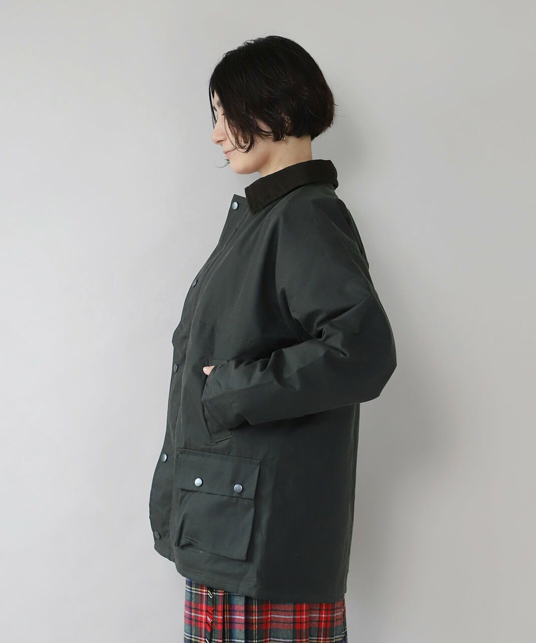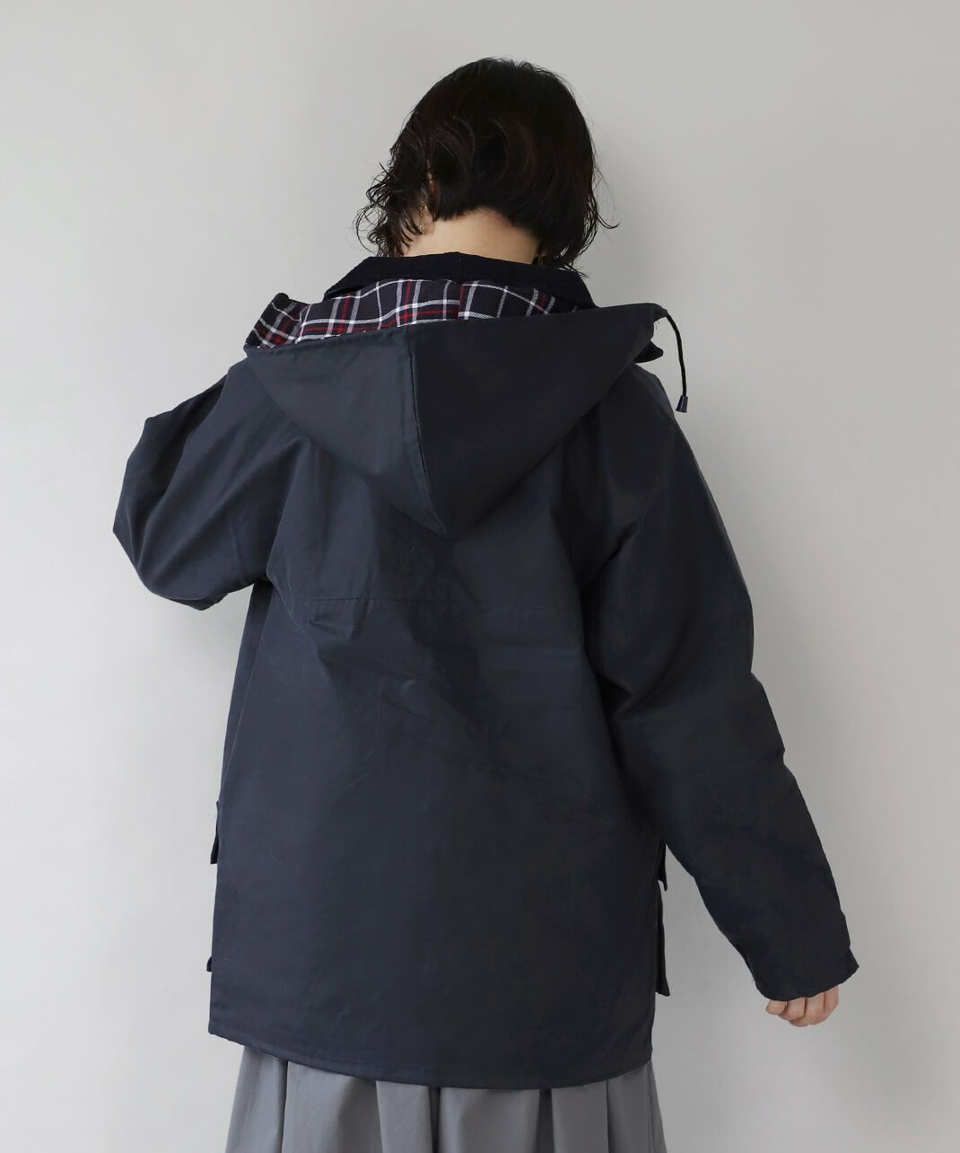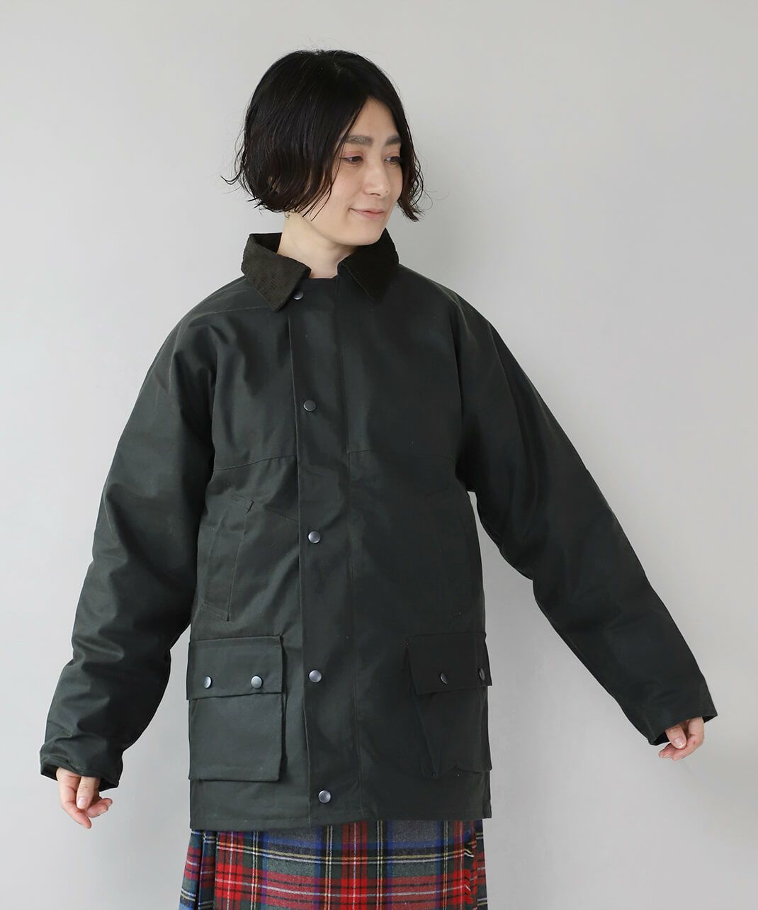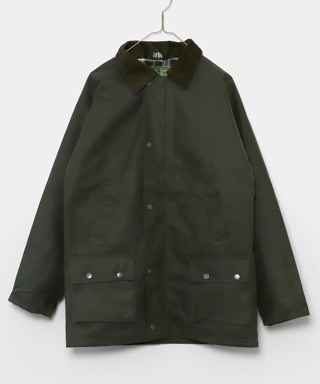 イギリスのファクトリーブランドRockall Outdoor (ロッコールアウトドア)。代表的なアイテムのオイルドジャケットです。 襟元には太畝のコーデュロイ、フラップ付きポケットの上に配置されたハンドウォーマーポケット、フロントの2WAYリングプルジップなど魅力的なディテールが詰まっています。ボタンで取り外しのできる、同じワックスコーティングを施したフード付き。 袖口の内側に厚みのあるリブを配置することで冷気の侵入を防ぎ防寒性も高めています。肩周りはラグランスリーブを採用することで、いろんなコーディネートに合わせやすく、永く愛用できる1着です。 着用を重ねる事でワックスコーティングが少しずつ乾き、独特の表情へと変化する経年変化も楽しめます。