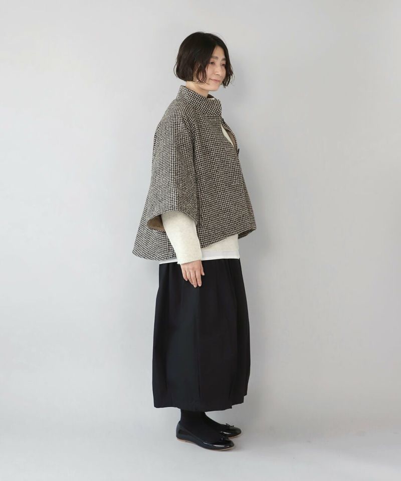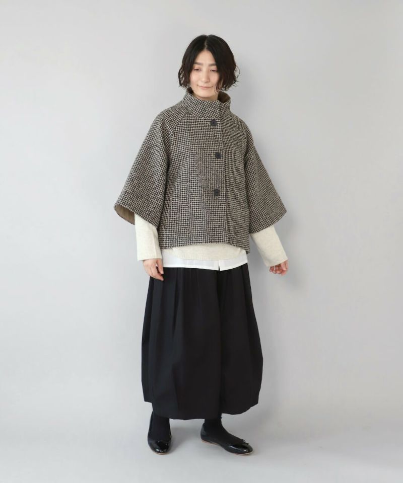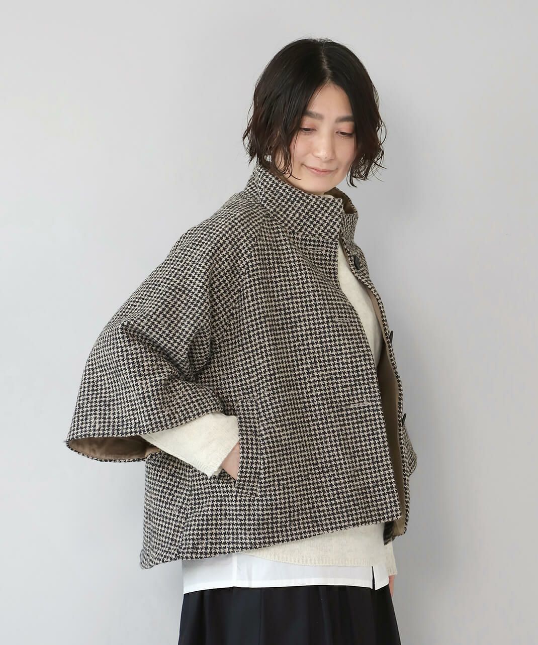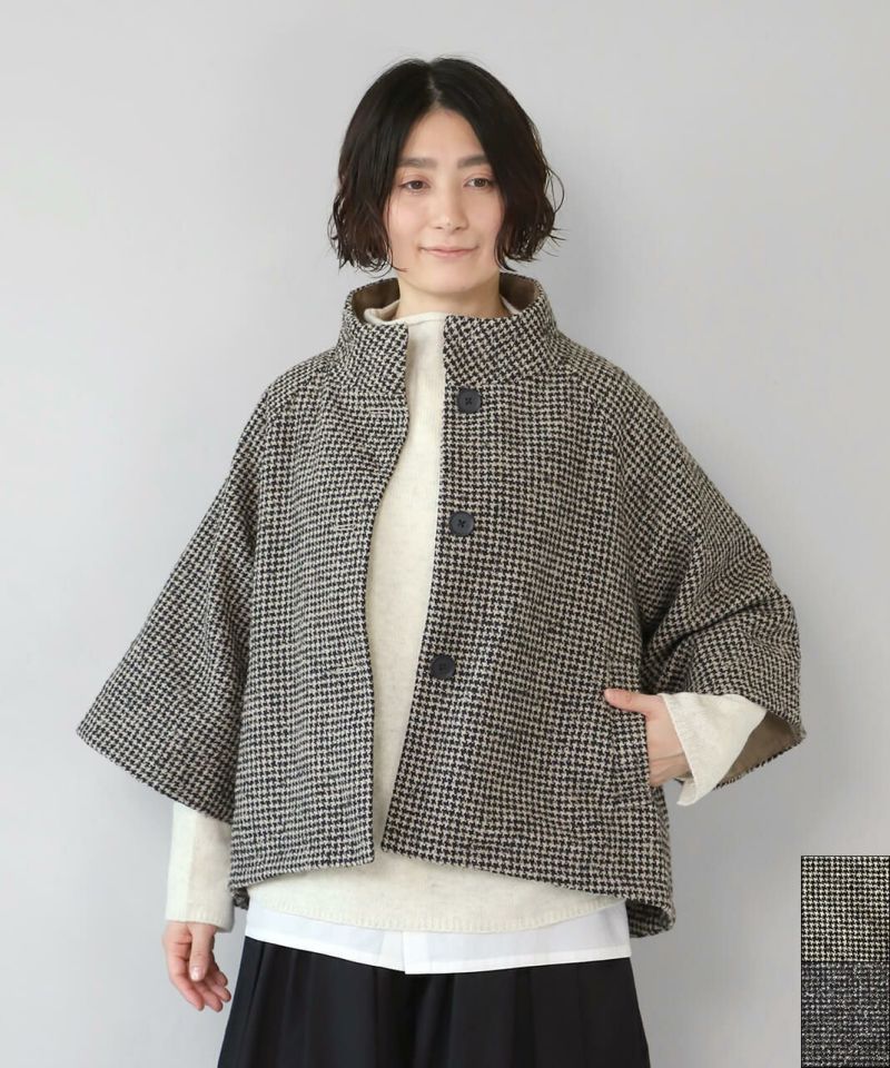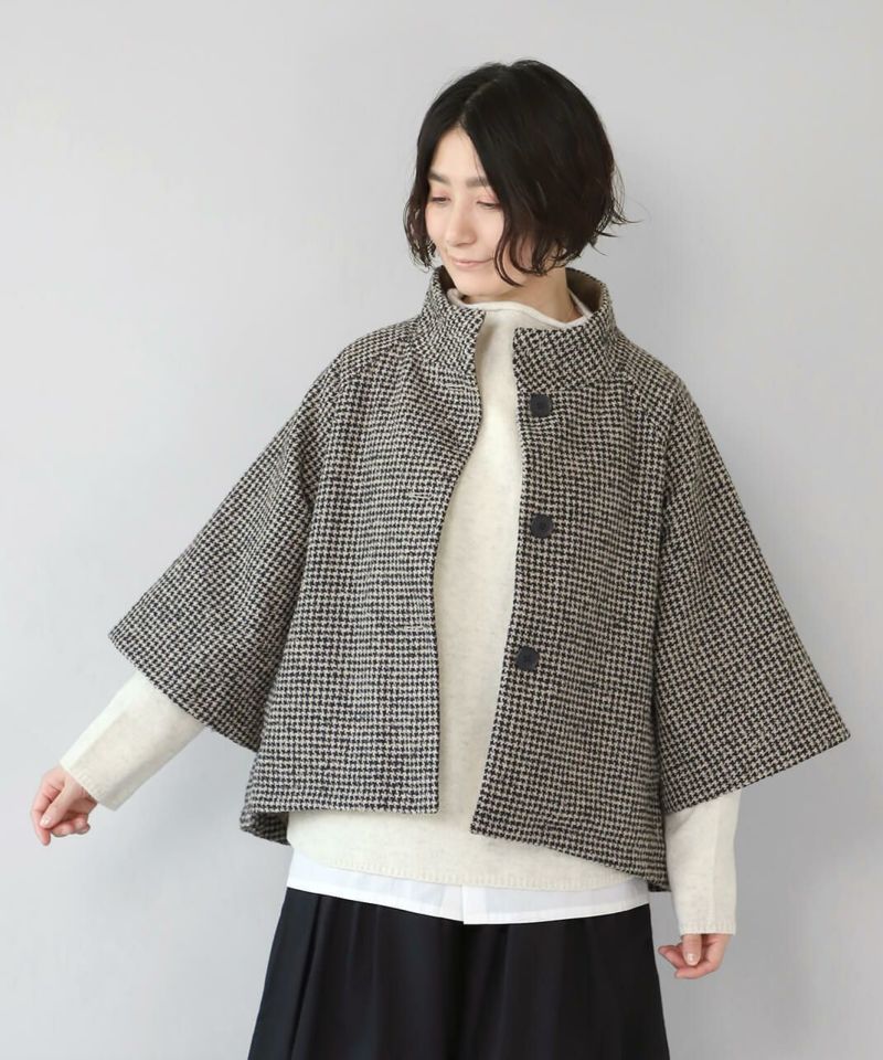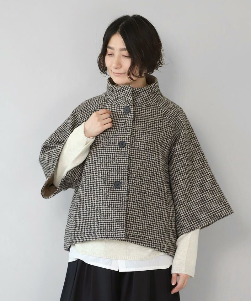 ざっくりと織り上げた千鳥チェックのポンチョシルエットコートです。 ツイード生地のような上品さで、クラシカルな印象の1着です。Aラインのポンチョのようなデザインで、コーディネートの主役にスタイリングを楽しむのがおすすめ。脱着がスムーズに行える、なめらかな裏地つきです。