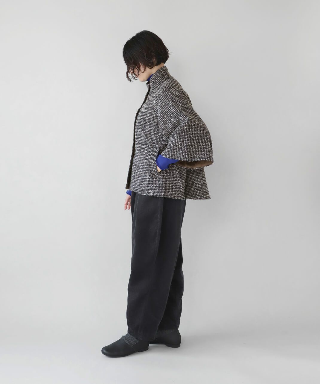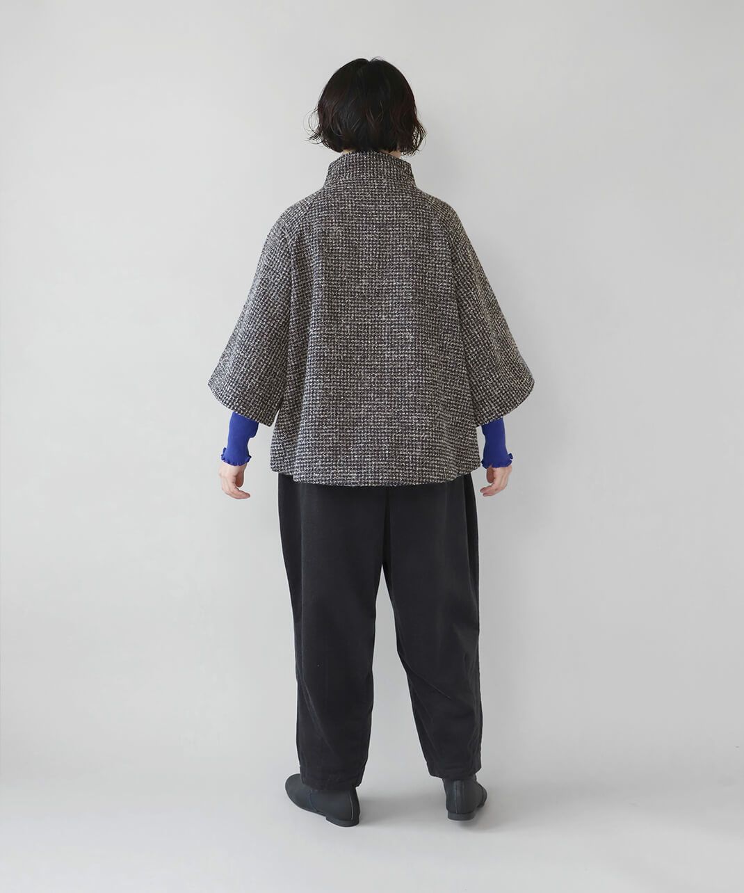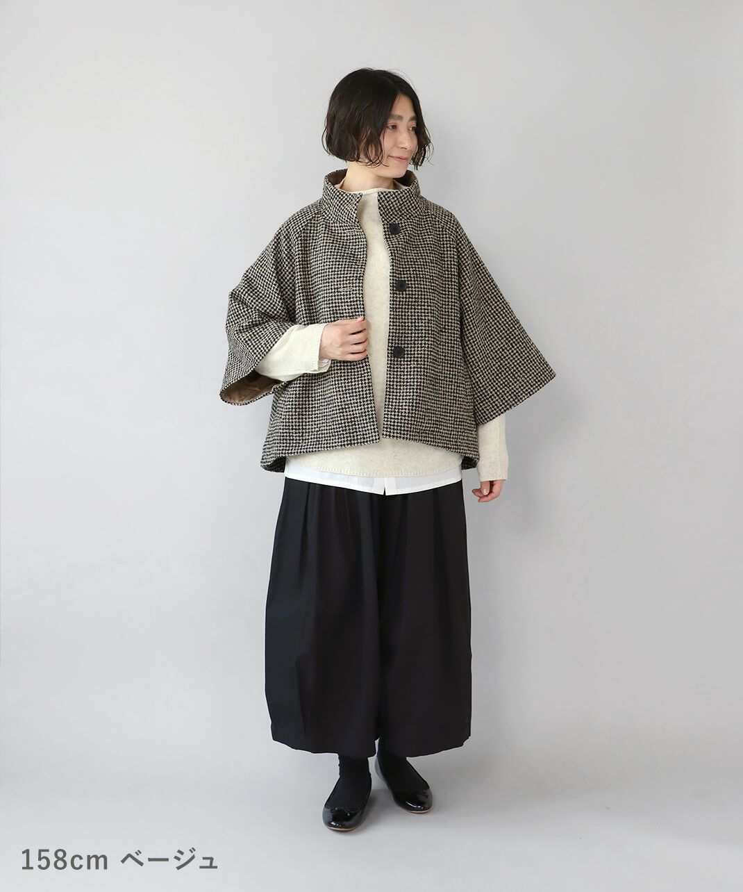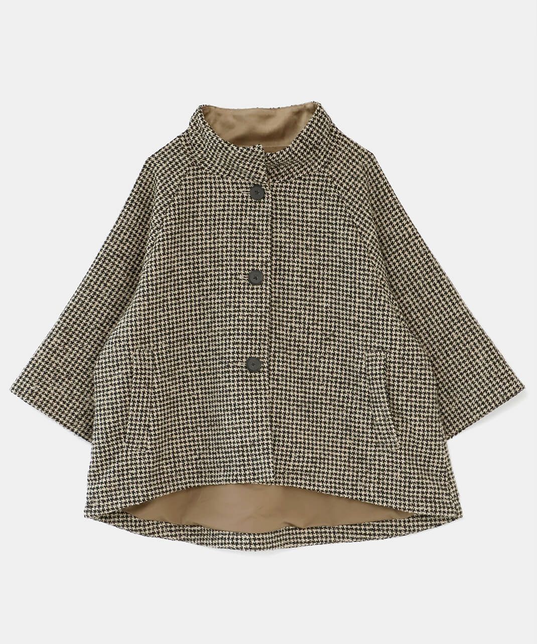 ざっくりと織り上げた千鳥チェックのポンチョシルエットコートです。 ツイード生地のような上品さで、クラシカルな印象の1着です。Aラインのポンチョのようなデザインで、コーディネートの主役にスタイリングを楽しむのがおすすめ。脱着がスムーズに行える、なめらかな裏地つきです。