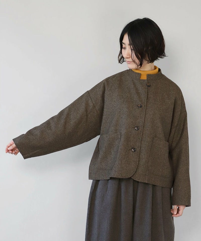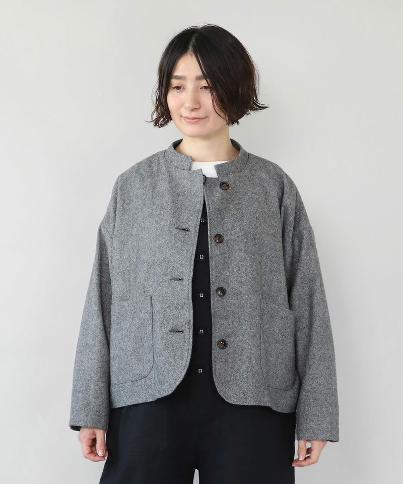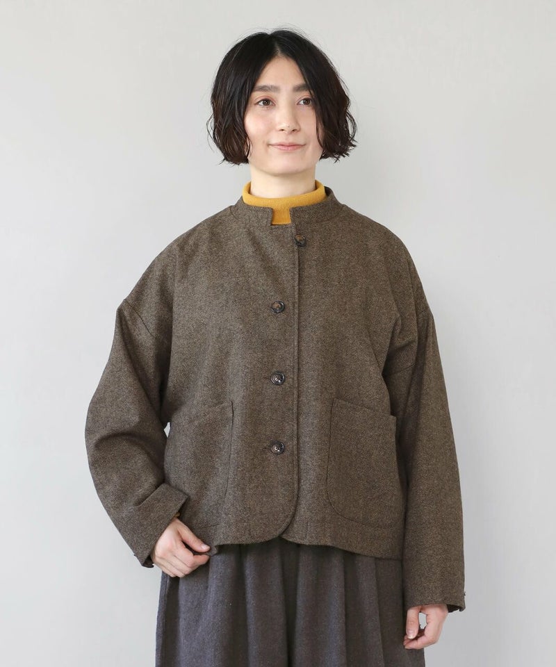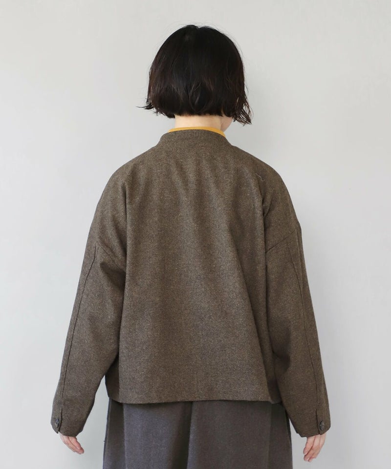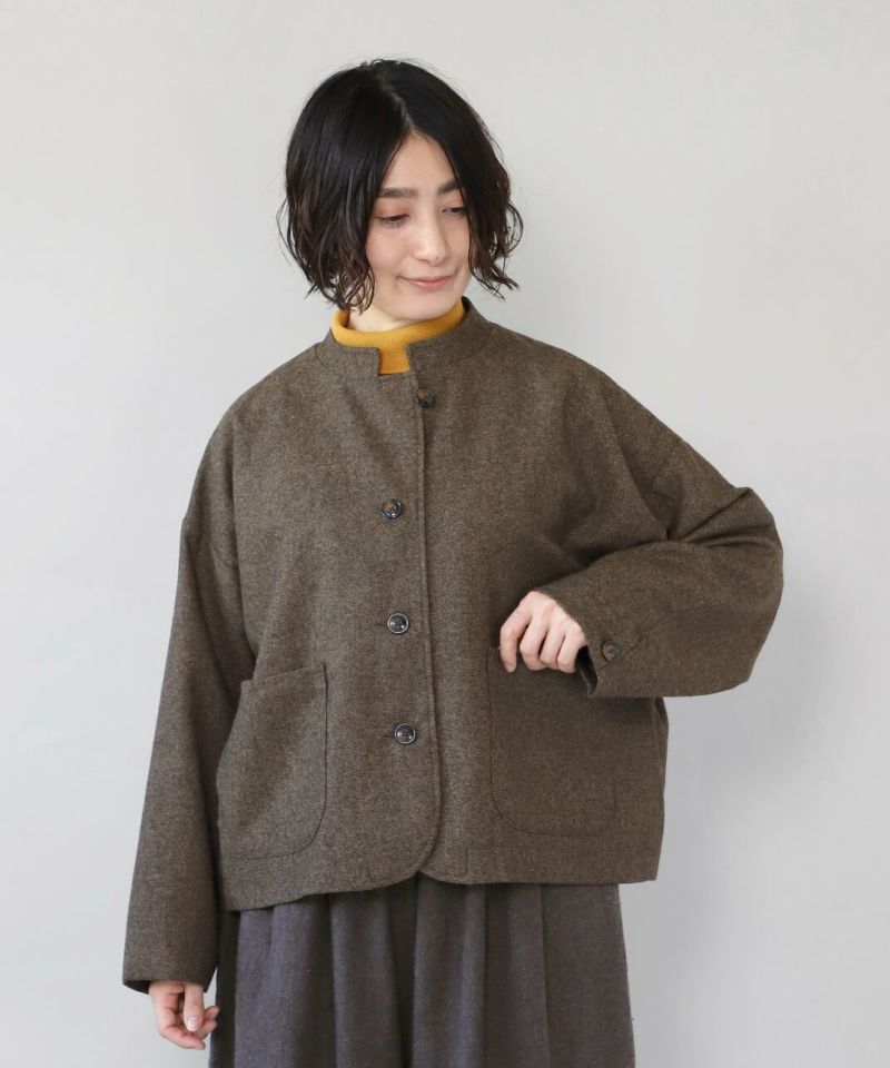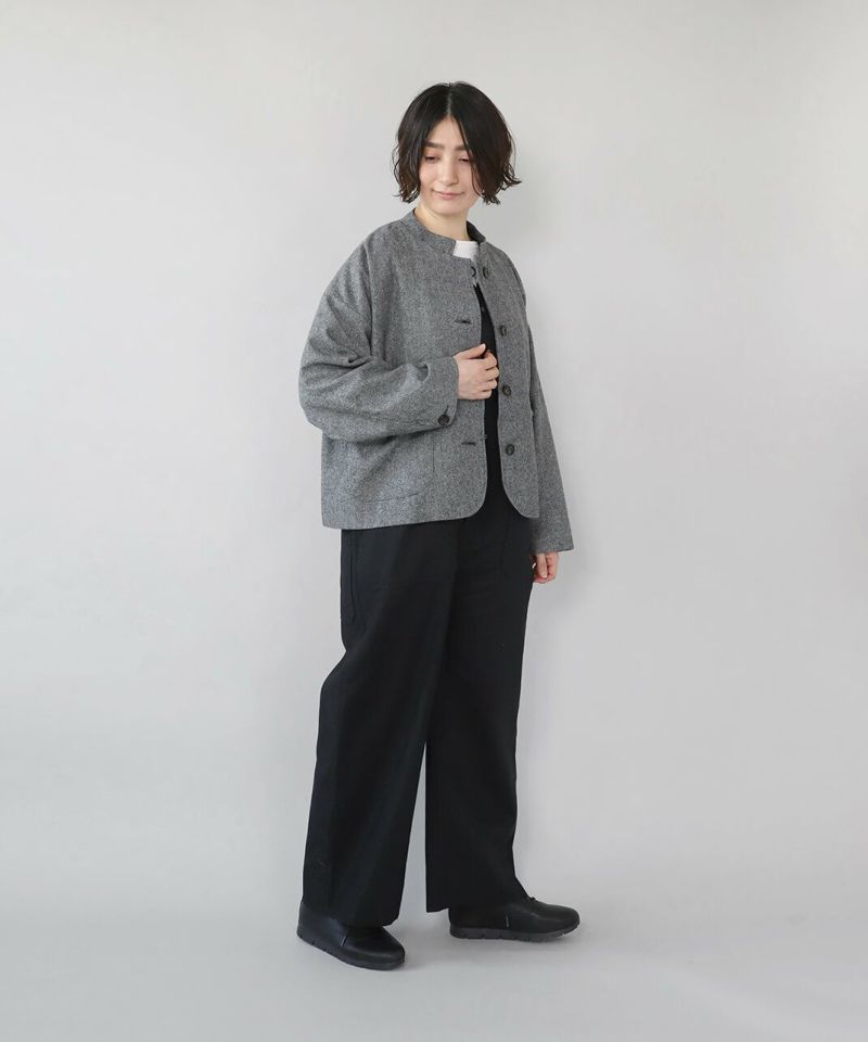 素朴で上品なツイード生地を使用したマオカラージャケットです。 適度なハリとやわらかさを持ちあわせた絶妙な風合いの1着です。 首元はマオカラーですっきりと、ワイドなシルエットでゆったりとした着心地。裏地に身頃はさらりとしたコットンを、袖には滑りのよいポリエステルが使用されています。 日常使いから、オフィスカジュアルまで幅広いスタイルに合わせやすく、1枚あると重宝します。