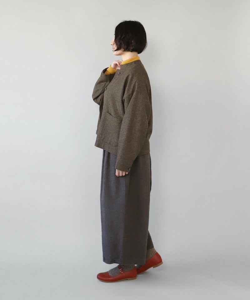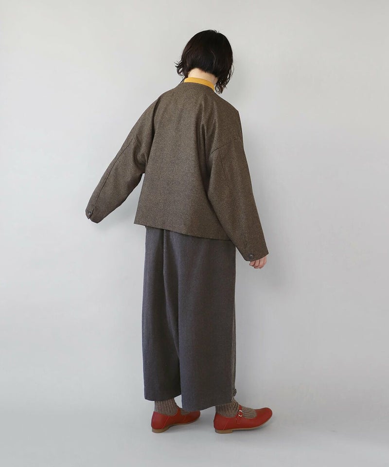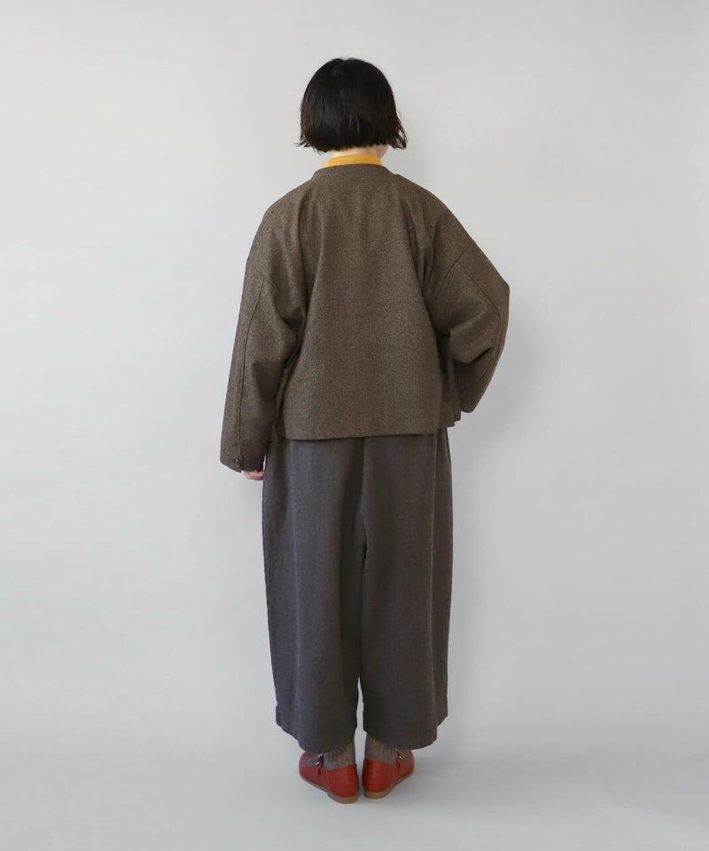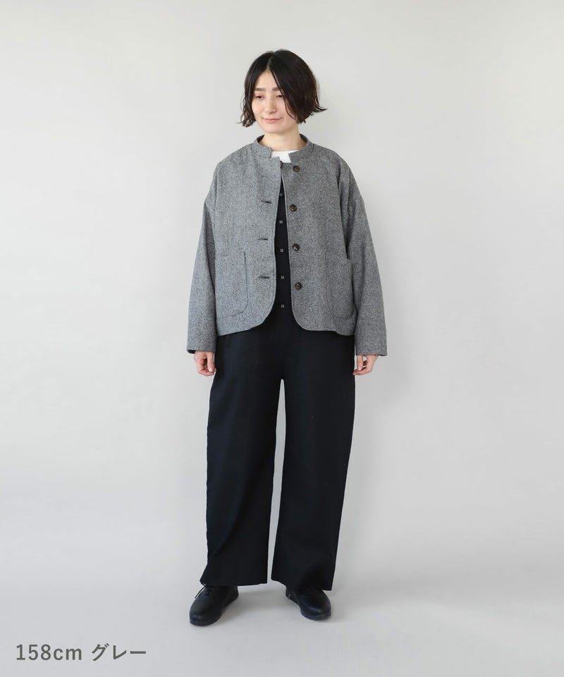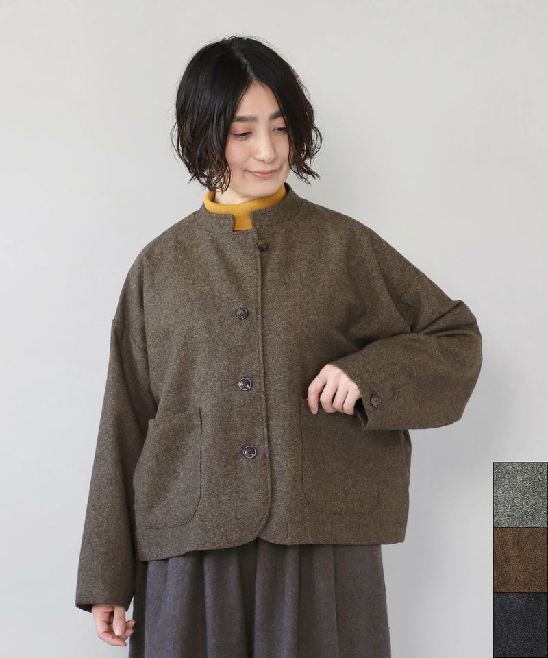 素朴で上品なツイード生地を使用したマオカラージャケットです。 適度なハリとやわらかさを持ちあわせた絶妙な風合いの1着です。 首元はマオカラーですっきりと、ワイドなシルエットでゆったりとした着心地。裏地に身頃はさらりとしたコットンを、袖には滑りのよいポリエステルが使用されています。 日常使いから、オフィスカジュアルまで幅広いスタイルに合わせやすく、1枚あると重宝します。