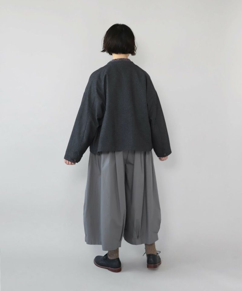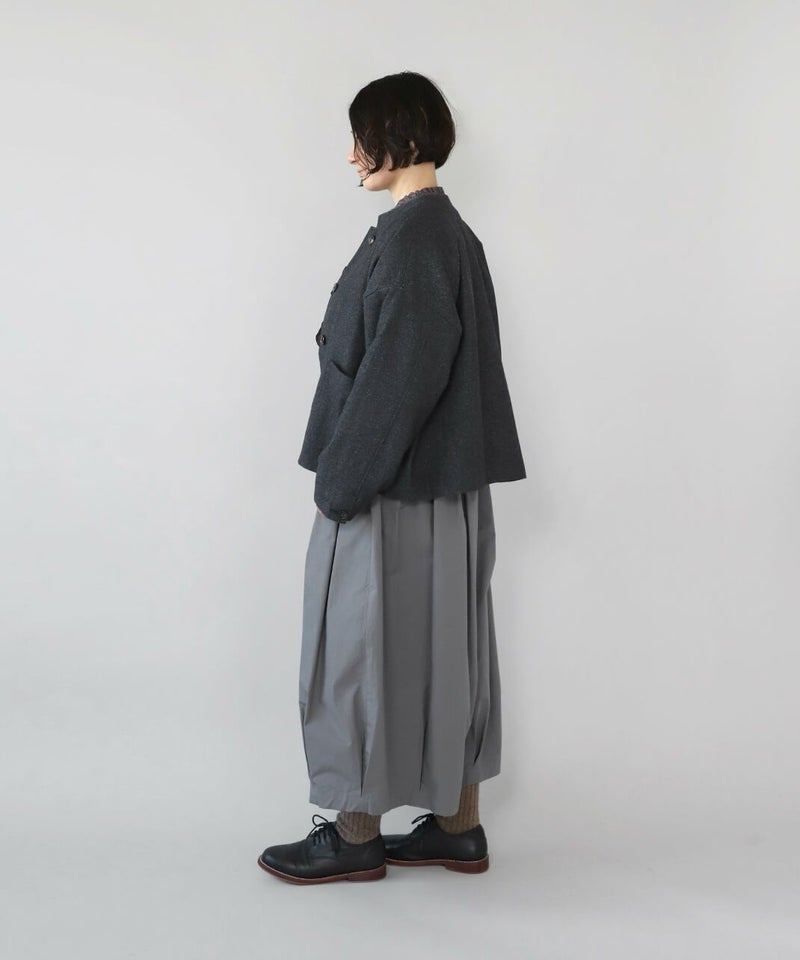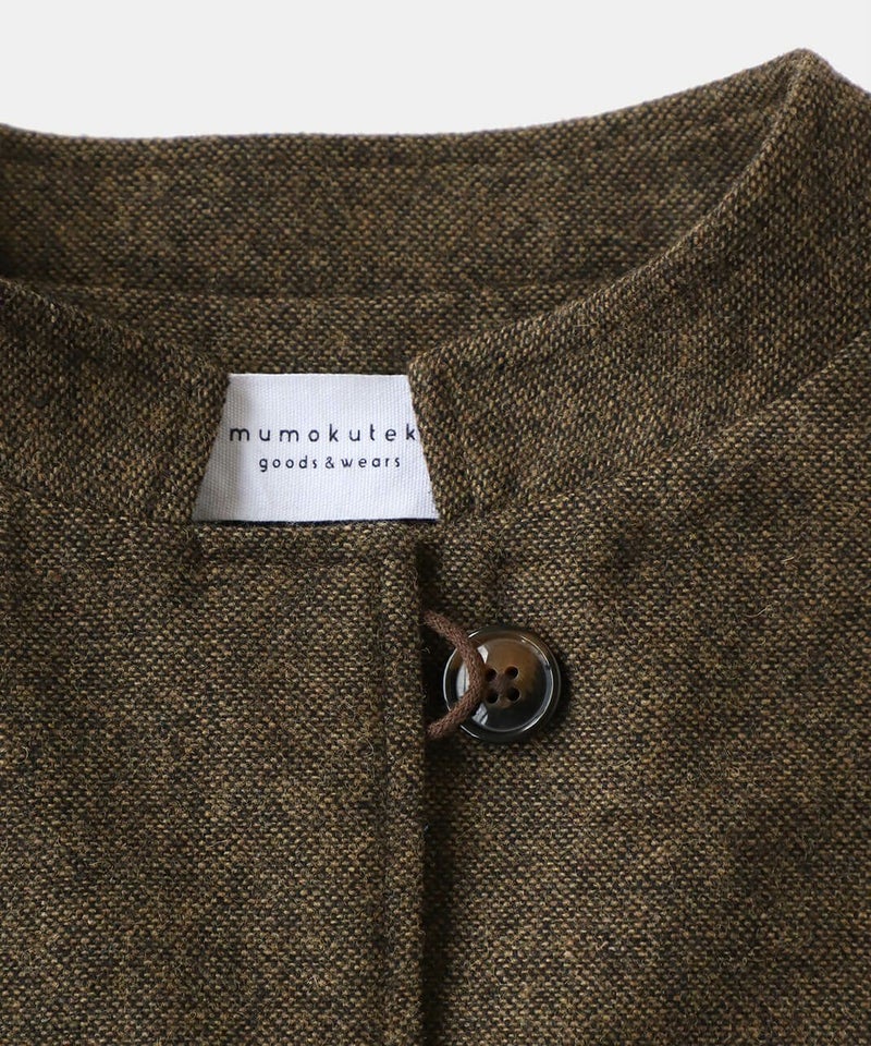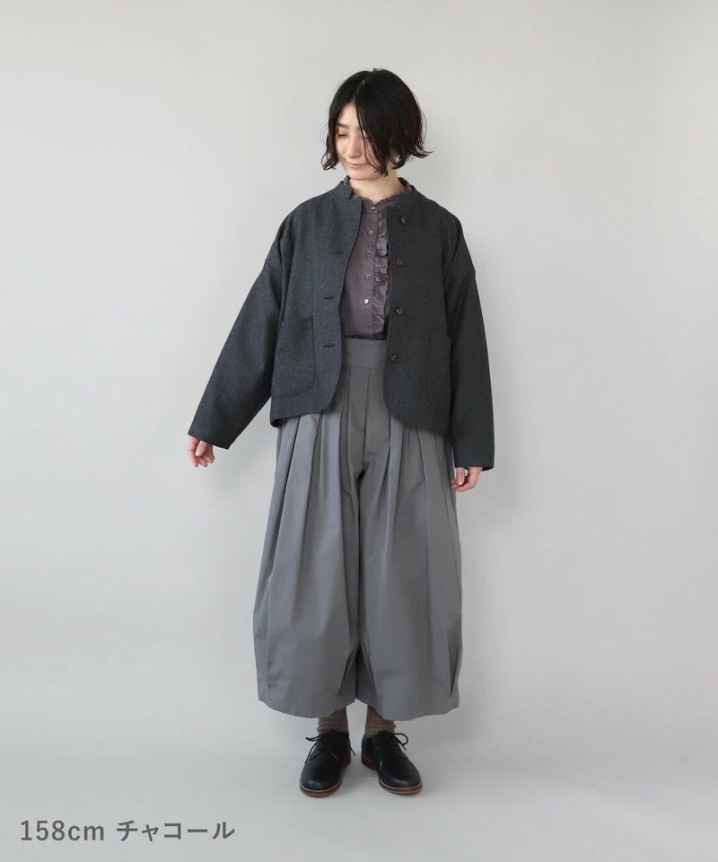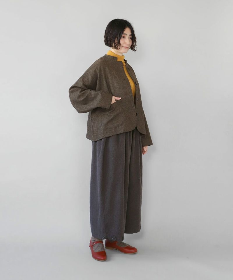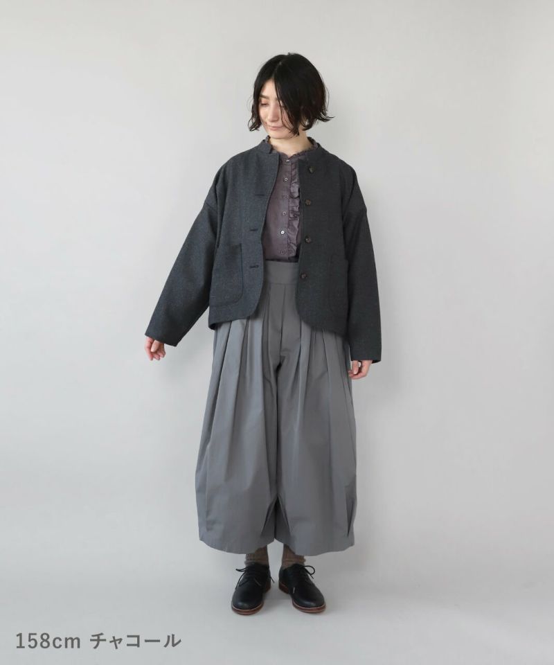 素朴で上品なツイード生地を使用したマオカラージャケットです。 適度なハリとやわらかさを持ちあわせた絶妙な風合いの1着です。 首元はマオカラーですっきりと、ワイドなシルエットでゆったりとした着心地。裏地に身頃はさらりとしたコットンを、袖には滑りのよいポリエステルが使用されています。 日常使いから、オフィスカジュアルまで幅広いスタイルに合わせやすく、1枚あると重宝します。
