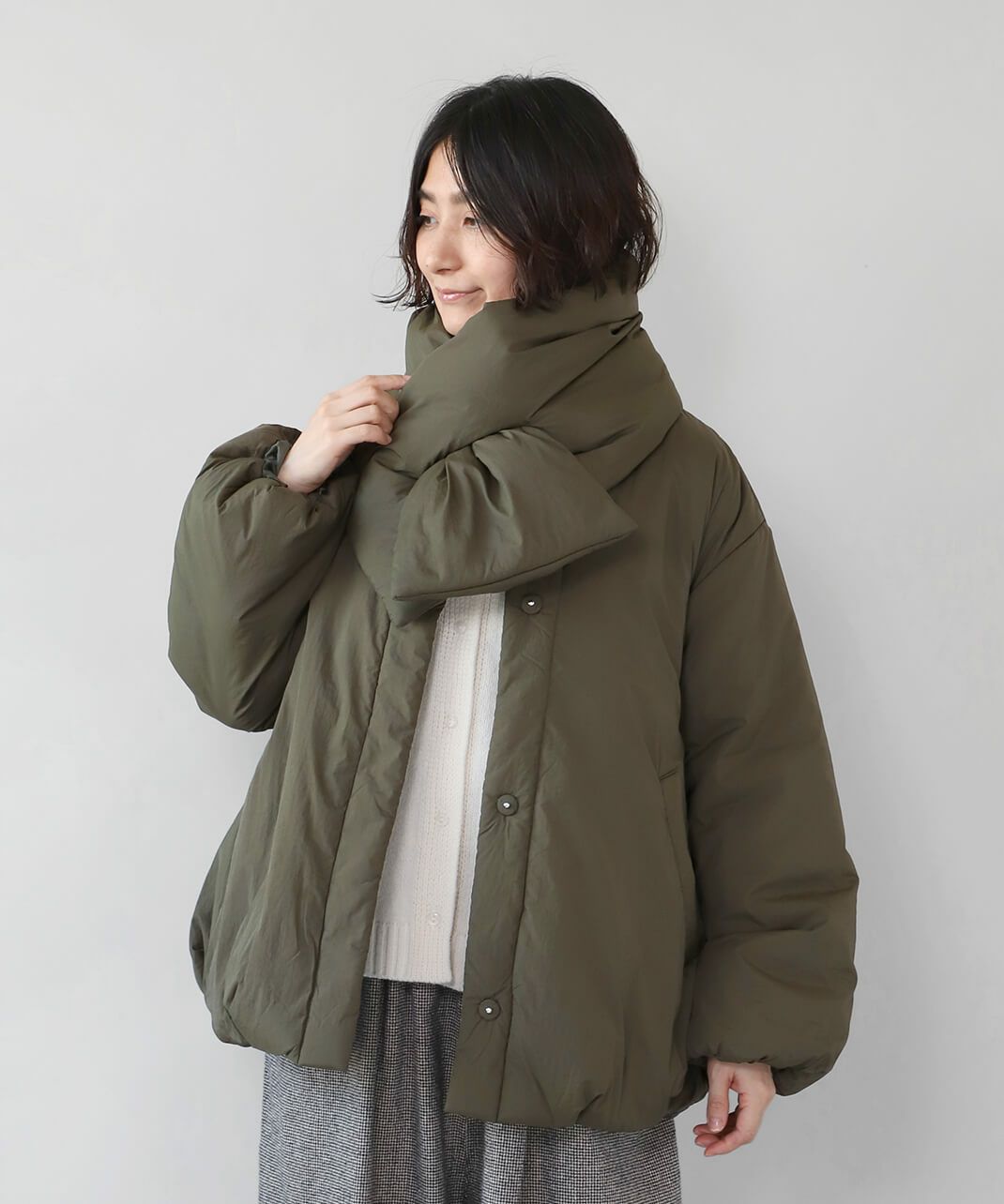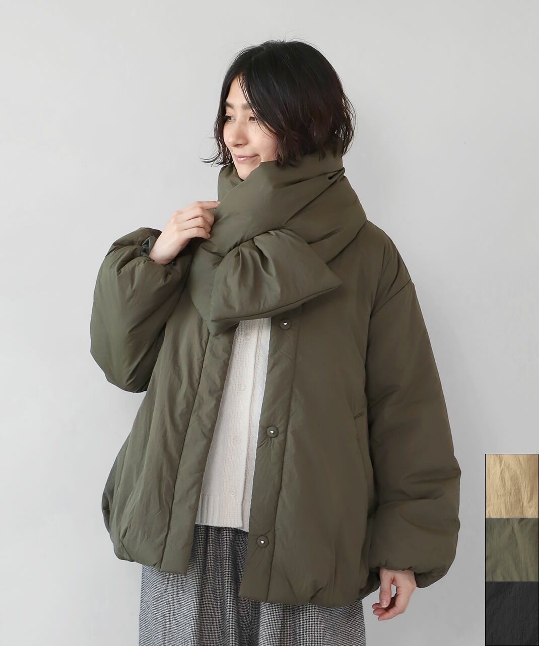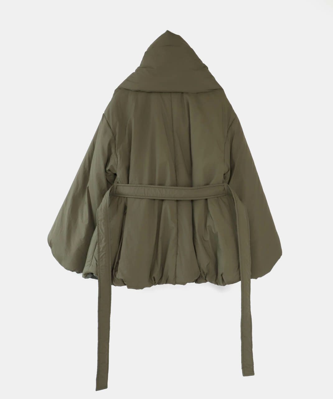 摩擦や摩耗に強く耐久性があり、シワも気になりにくいナイロンを使用した中綿コートです。 ノーカラーに裾ドロップショルダーでゆったりとした着心地。フロントは比翼仕立てですっきりと、裾に向けてふんわり広がるバルーンシルエットに。 中綿入りでボリューム感がありながら、とても軽くストレスなく着用可能。付属の取り外しの出来る薄中綿入りのマフラー付きで首元もあたたかく過ごせます。またベルトでウエストを絞れば、また違うシルエットを楽しめます。