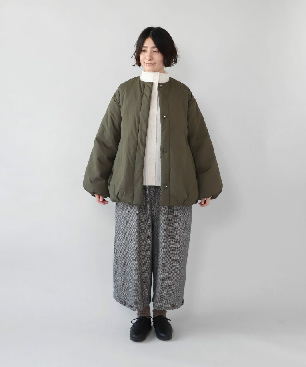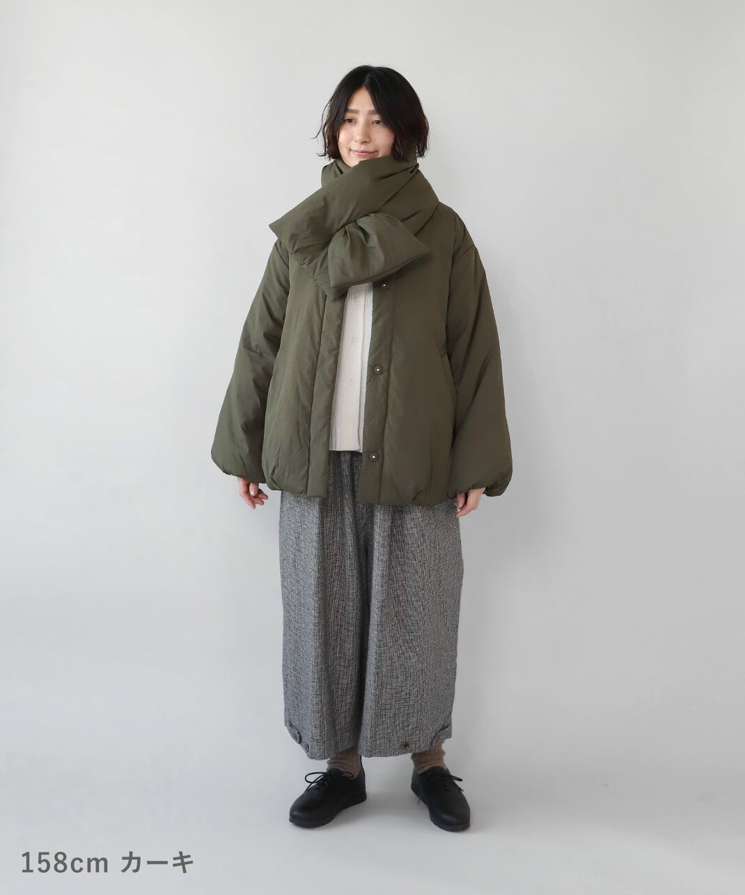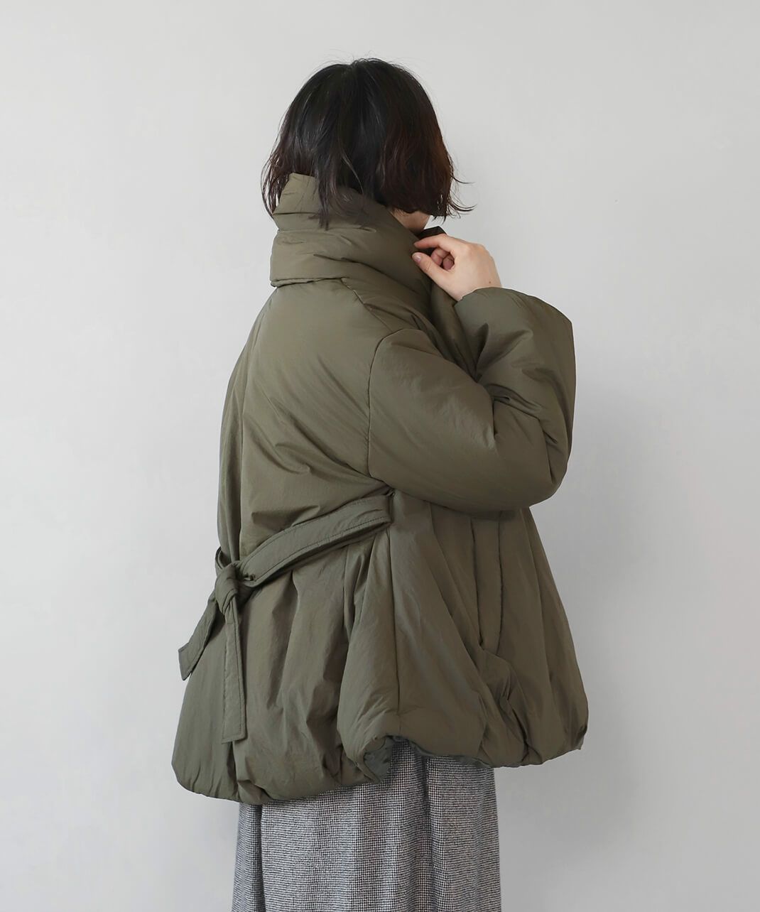 摩擦や摩耗に強く耐久性があり、シワも気になりにくいナイロンを使用した中綿コートです。 ノーカラーに裾ドロップショルダーでゆったりとした着心地。フロントは比翼仕立てですっきりと、裾に向けてふんわり広がるバルーンシルエットに。 中綿入りでボリューム感がありながら、とても軽くストレスなく着用可能。付属の取り外しの出来る薄中綿入りのマフラー付きで首元もあたたかく過ごせます。またベルトでウエストを絞れば、また違うシルエットを楽しめます。