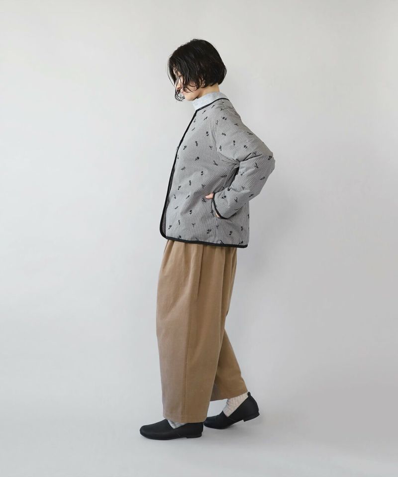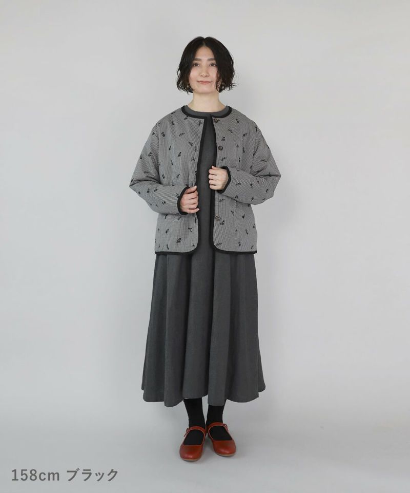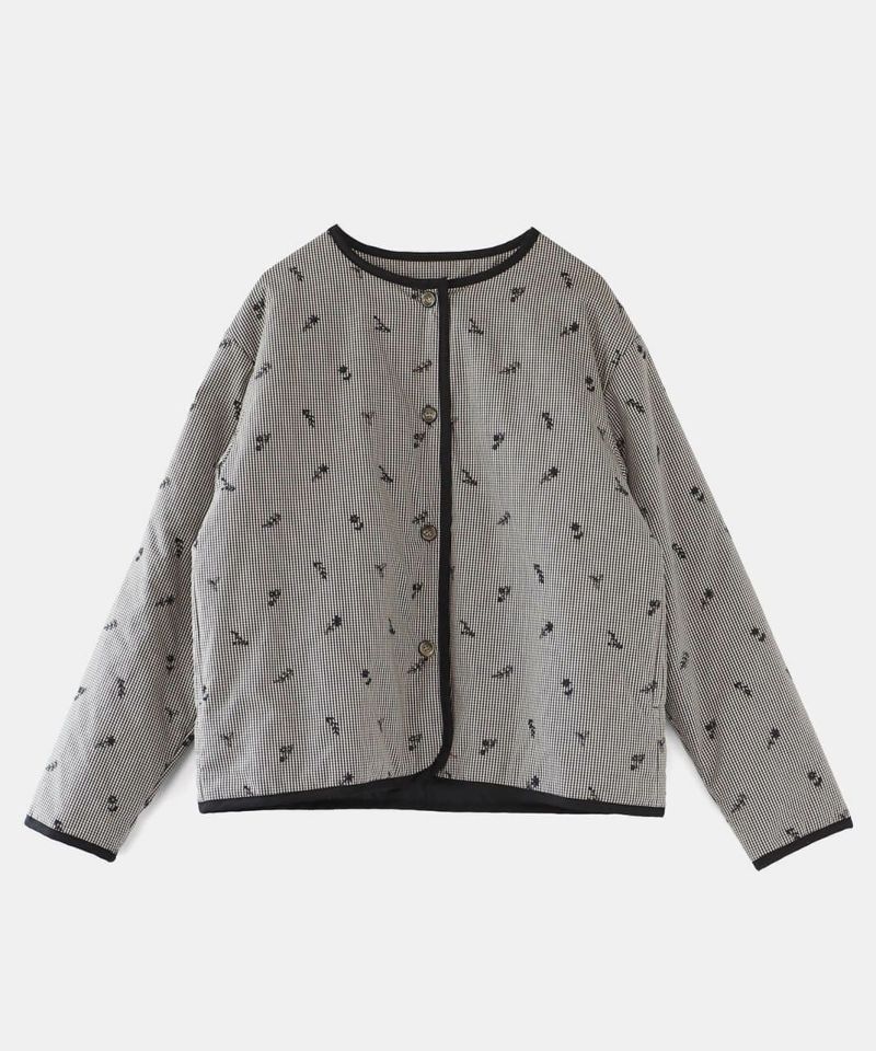 小花柄の刺繍を施したチェック柄のコットン生地に、ポリエステルの中綿入りでふっくら軽やかに仕上げたノーカラーショートコートです。ほどよくゆとりのあるボックスシルエットでリラックスした着心地。すべりの良い裏地付きのため脱着もスムーズです。ベースのチェック柄と小花柄の刺繍のコントラストが可愛らしくナチュラルな印象を演出してくれます。羽織りを主役にスタイリングを楽しめる1着です。