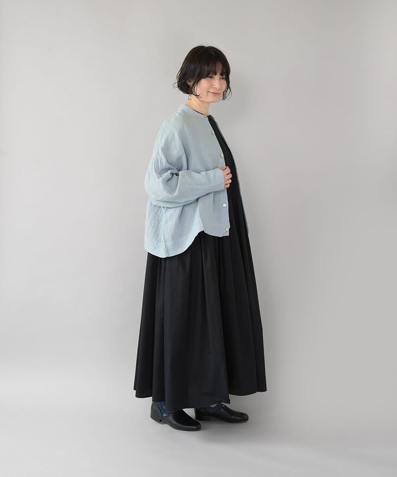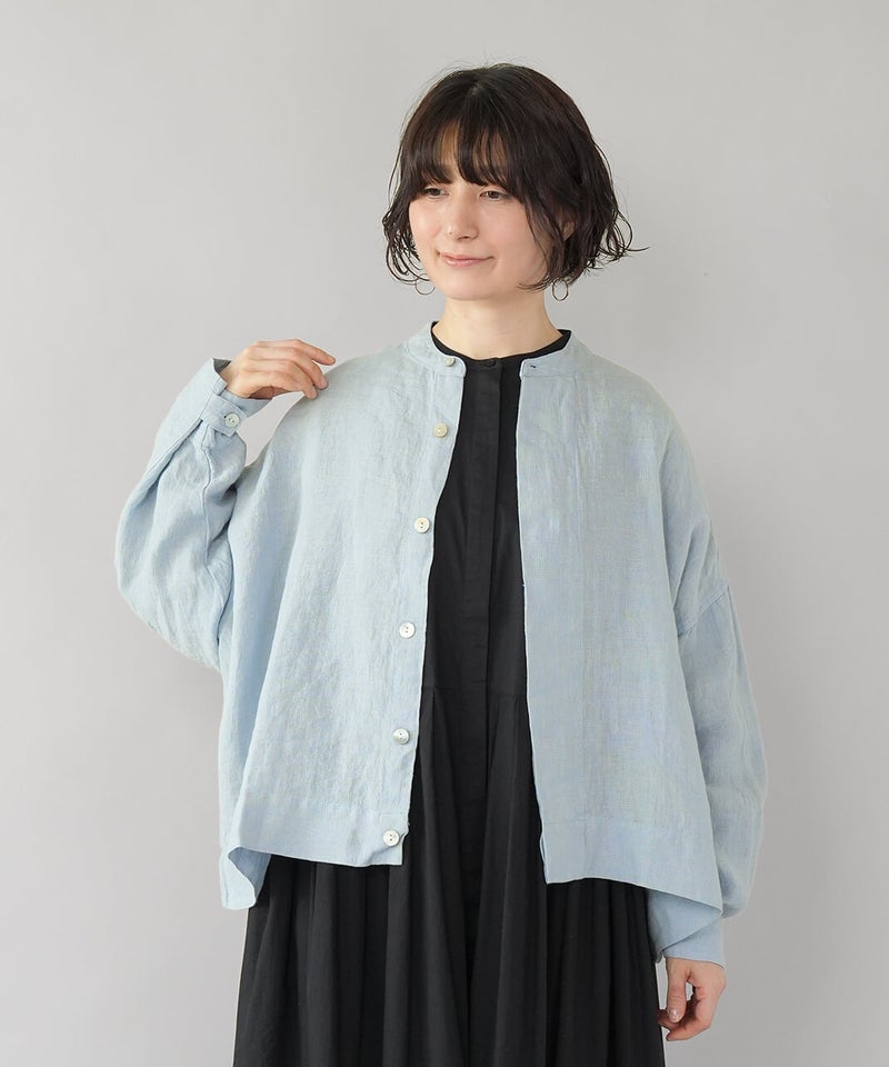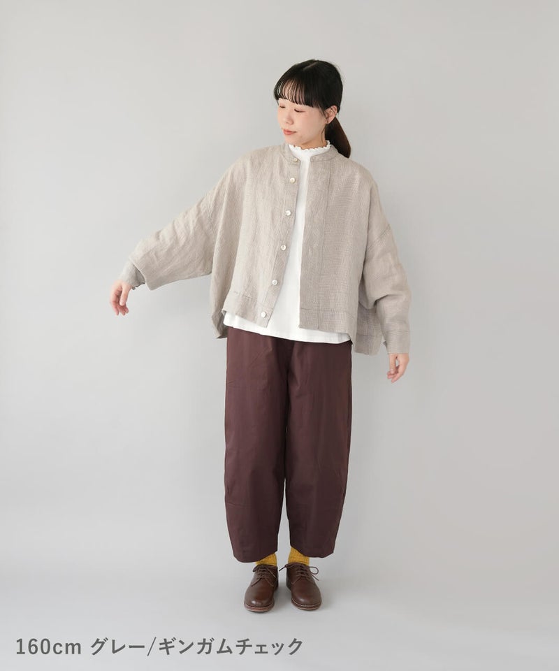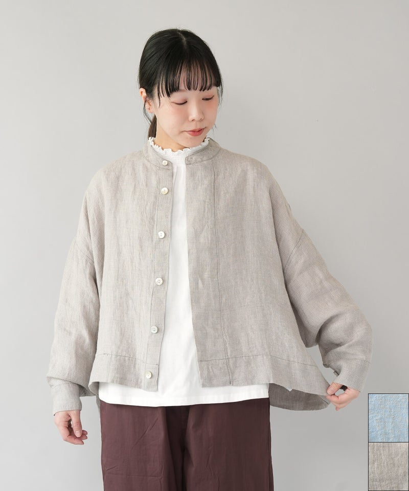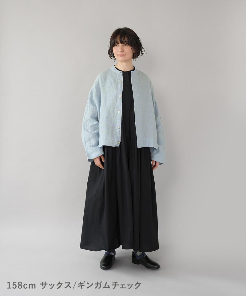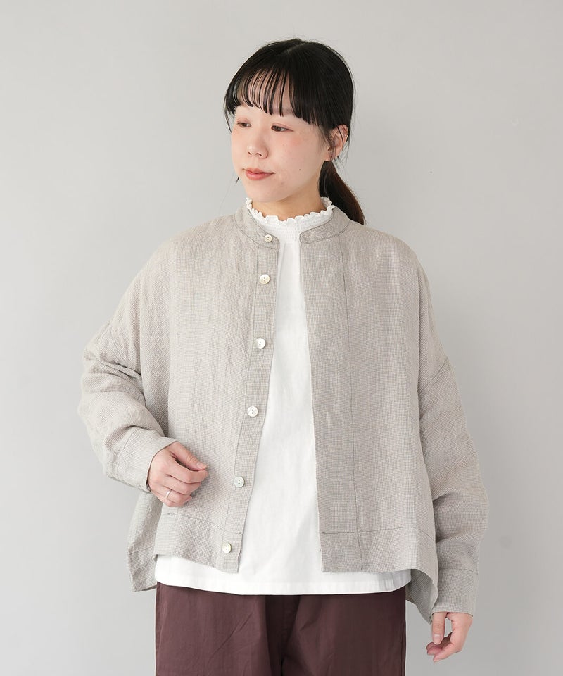 さらりとした肌ざわりが心地よい、麻100%のジャケットです。細かなギンガムチェックの薄手の生地で、リネンならではの清涼感が感じられます。汗ばむ季節の羽織りとしてはもちろん、冷房のきいた室内でさっと羽織るのにも。軽やかな着心地で、季節の変わり目にも頼りになります。袖口のボタンを留めると、ふんわりとしたボリューム袖に。前立ては太めの比翼仕立てで、身幅はゆったりと、丈はやや短め。こだわりの詰まった1着です。その日の装いに合わせて、表情の変化が楽しまめす。