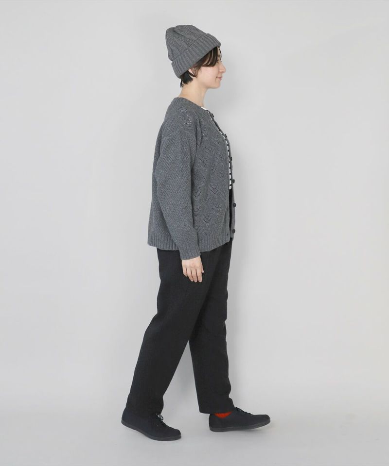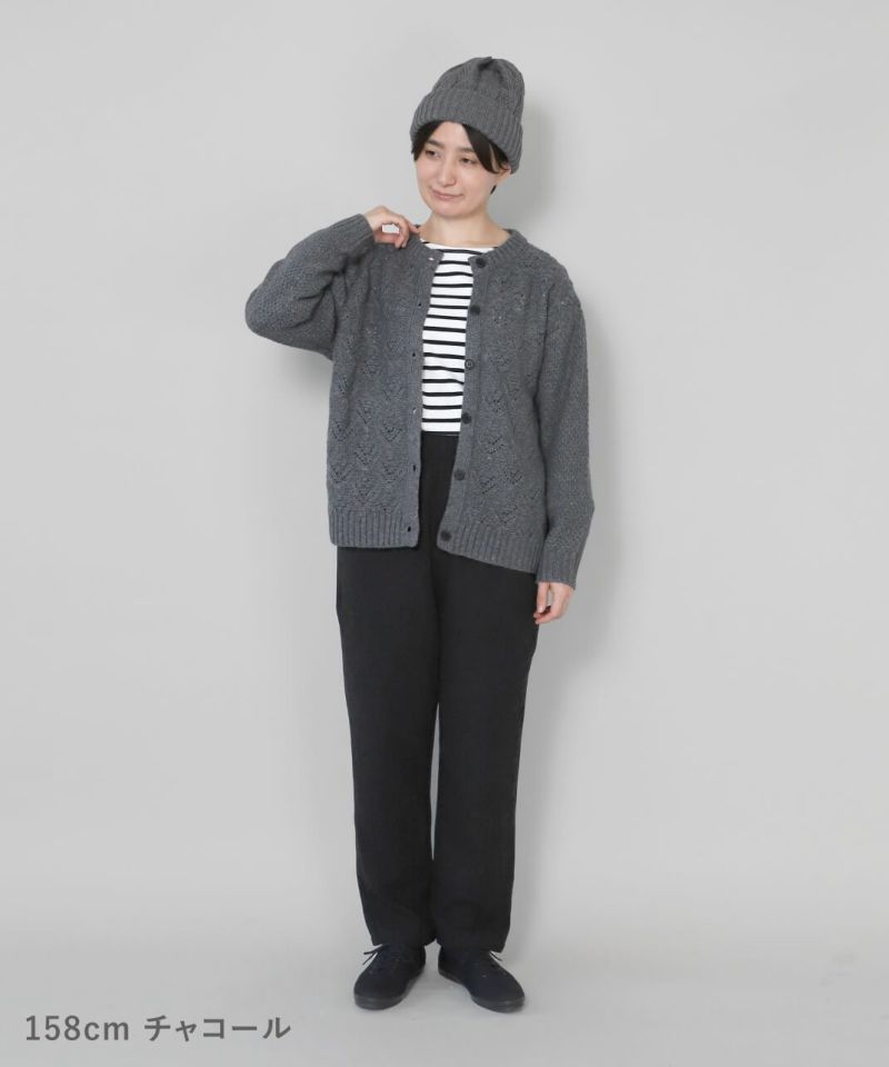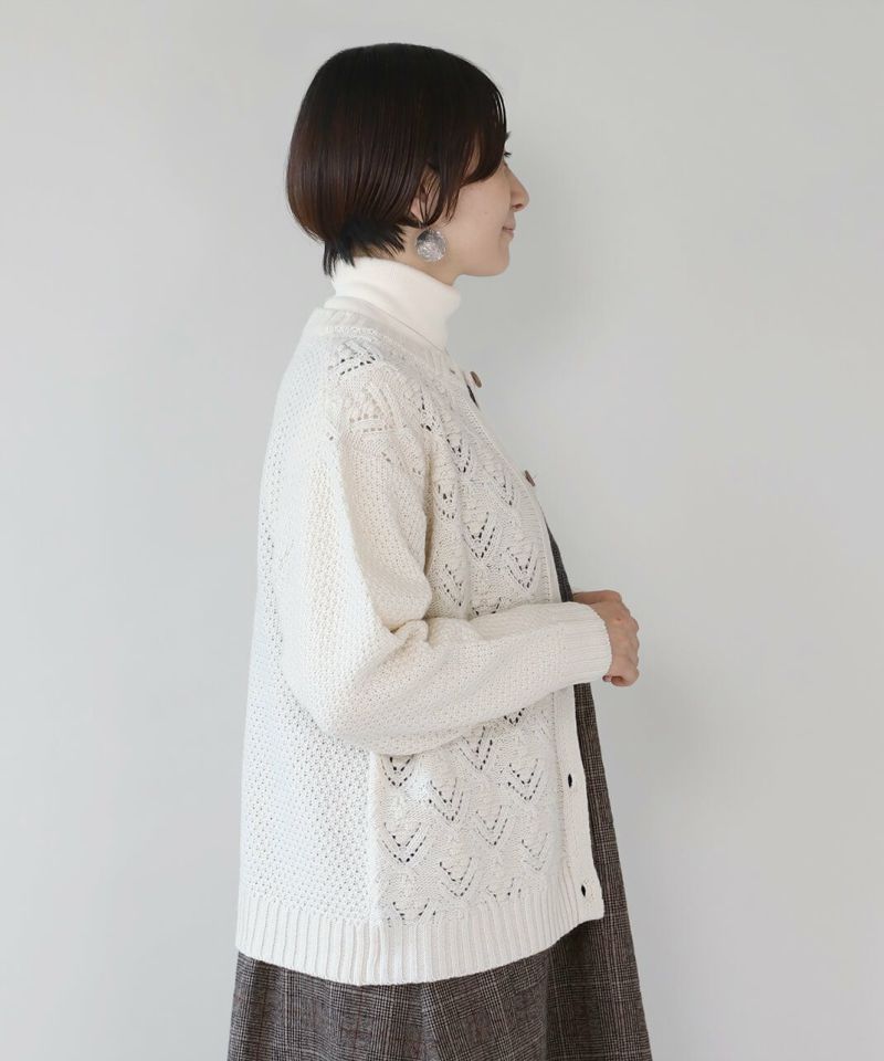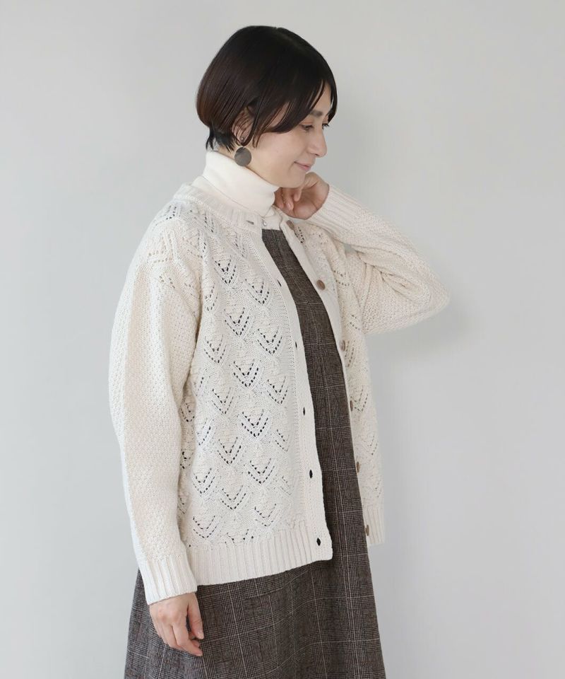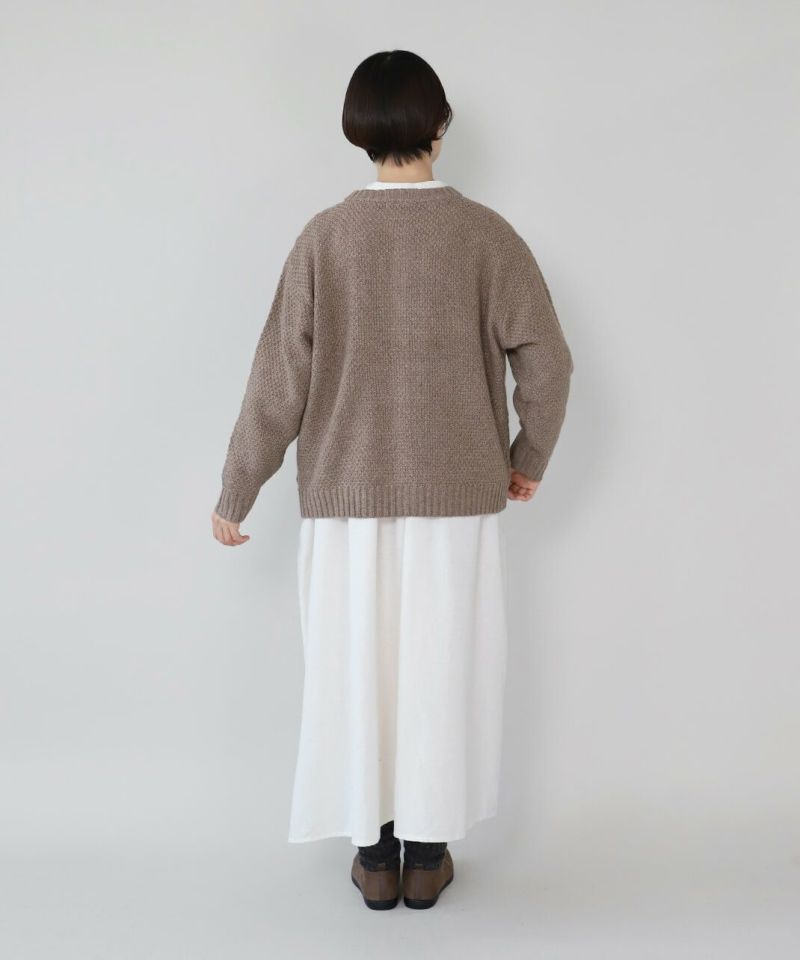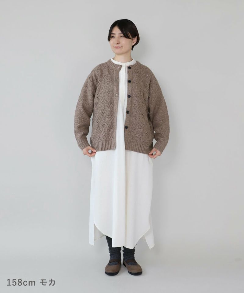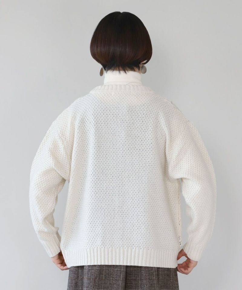 ラムウール混のクルーネックカーディガンです。ドロップショルダーのゆったりシルエットで軽い着心地。前身頃が柄編み、袖やうしろが鹿の子編みに切替わっているこだわりのデザイン。どんなスタイルにもさっと羽織ればナチュラルなコーディネートが完成します。
