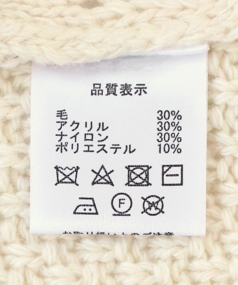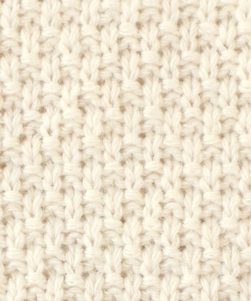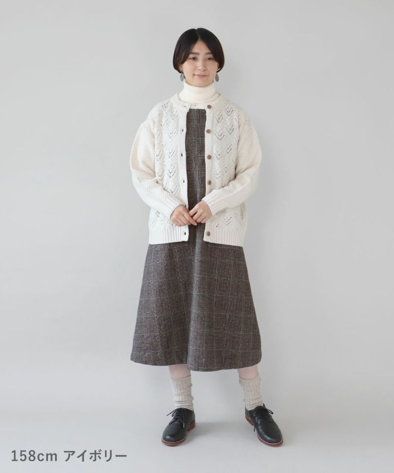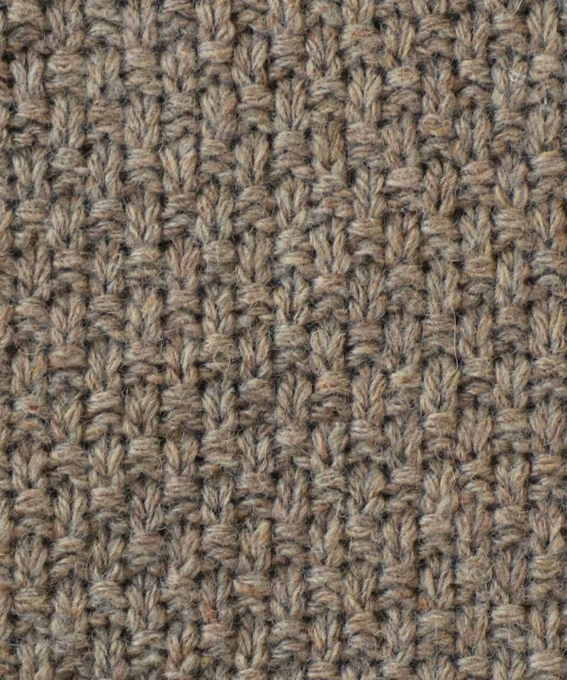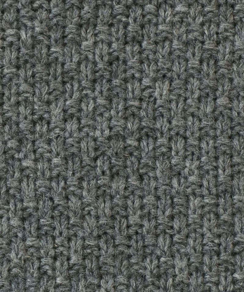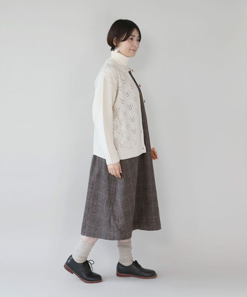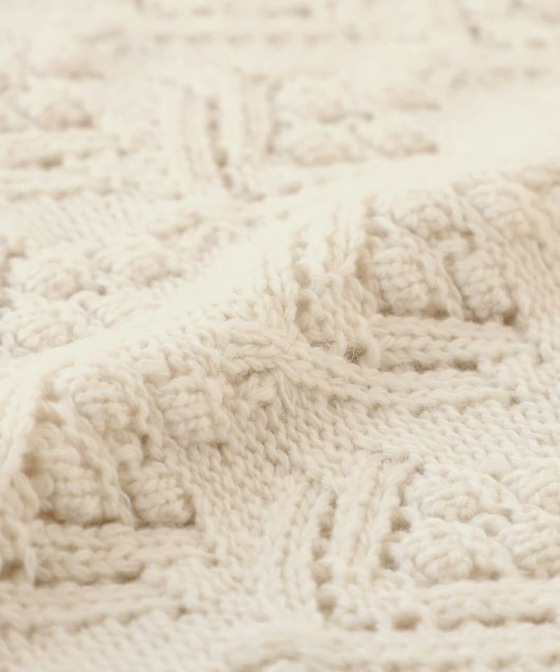 ラムウール混のクルーネックカーディガンです。ドロップショルダーのゆったりシルエットで軽い着心地。前身頃が柄編み、袖やうしろが鹿の子編みに切替わっているこだわりのデザイン。どんなスタイルにもさっと羽織ればナチュラルなコーディネートが完成します。