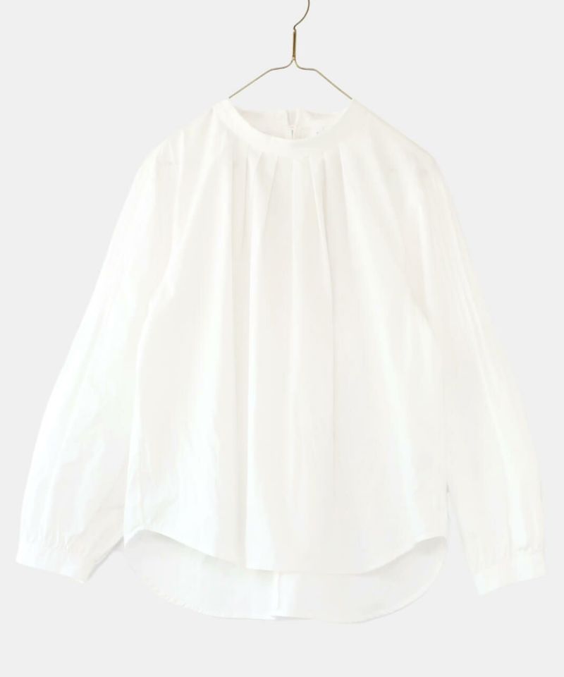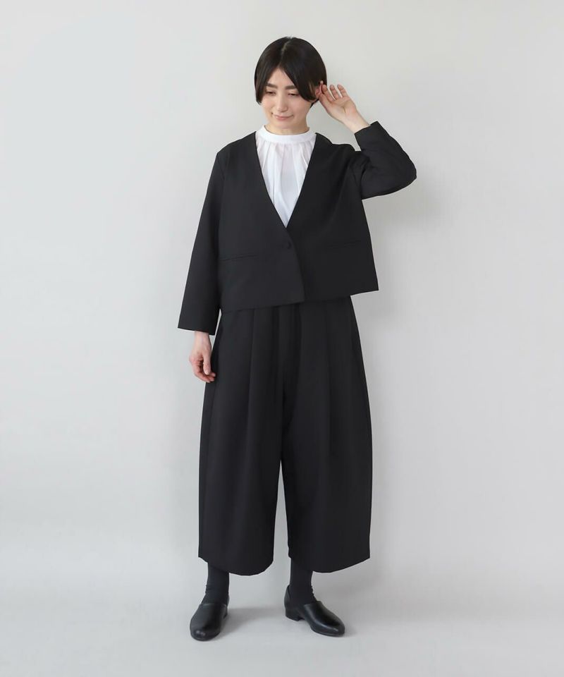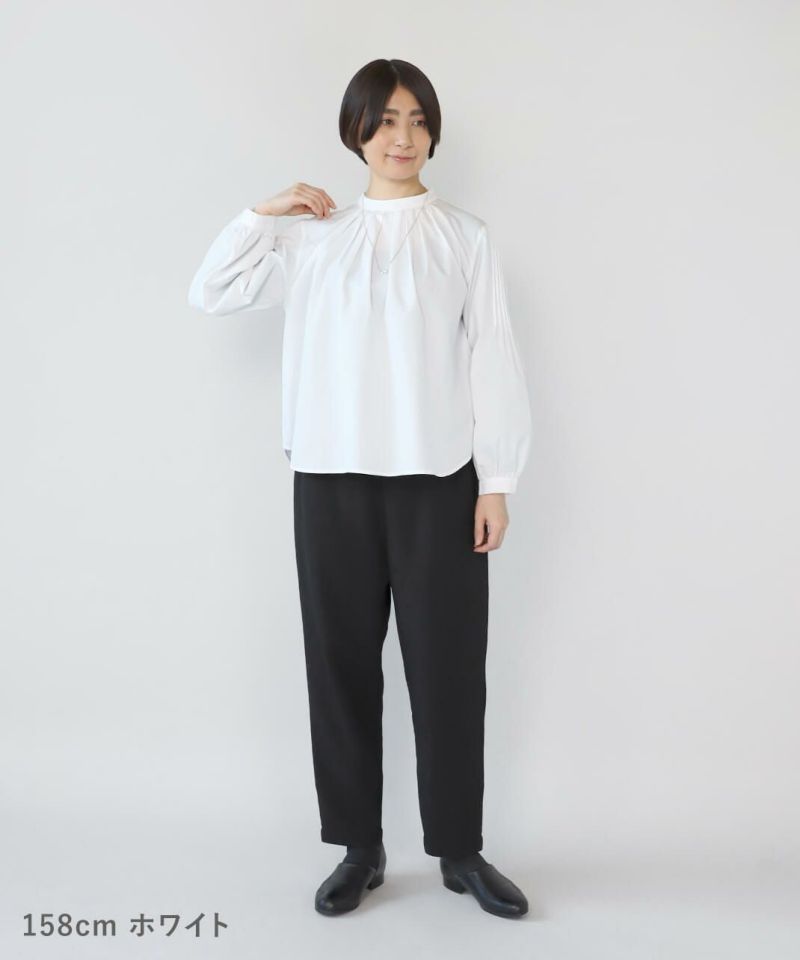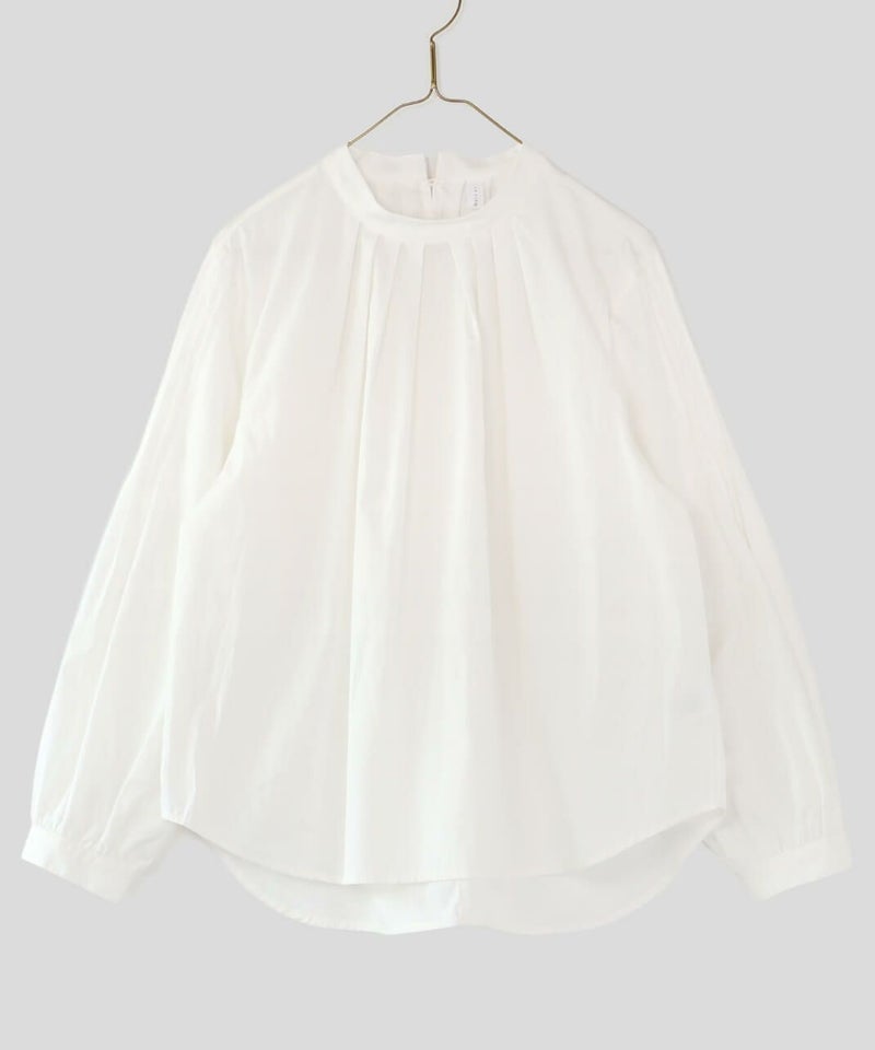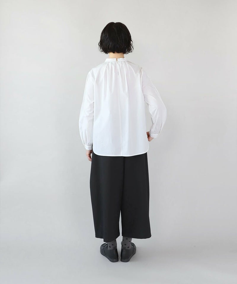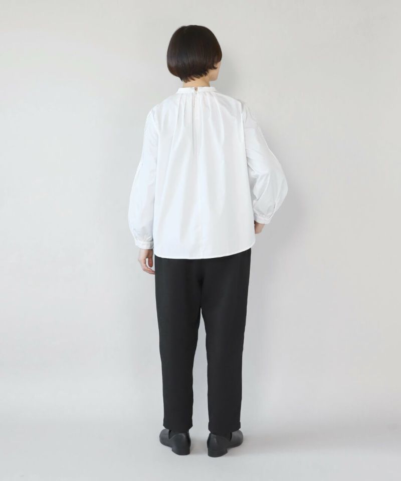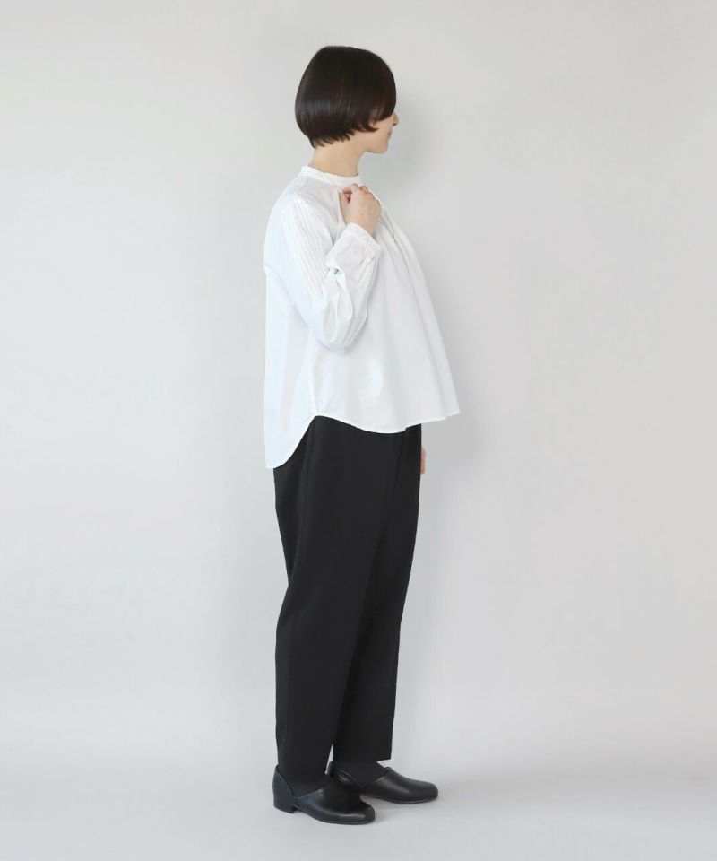 スタンドネックにタックを施したデザインが印象的な1着です。