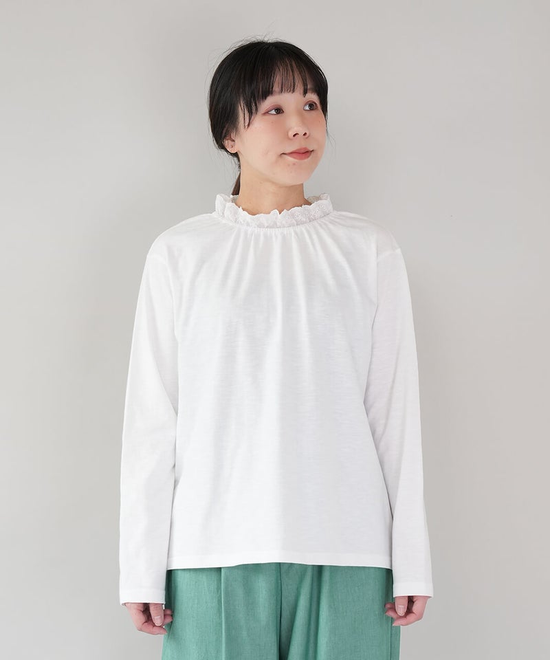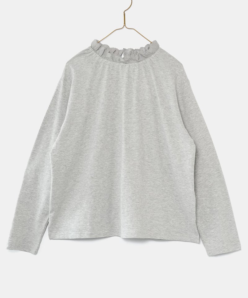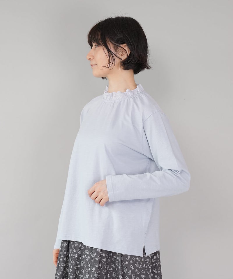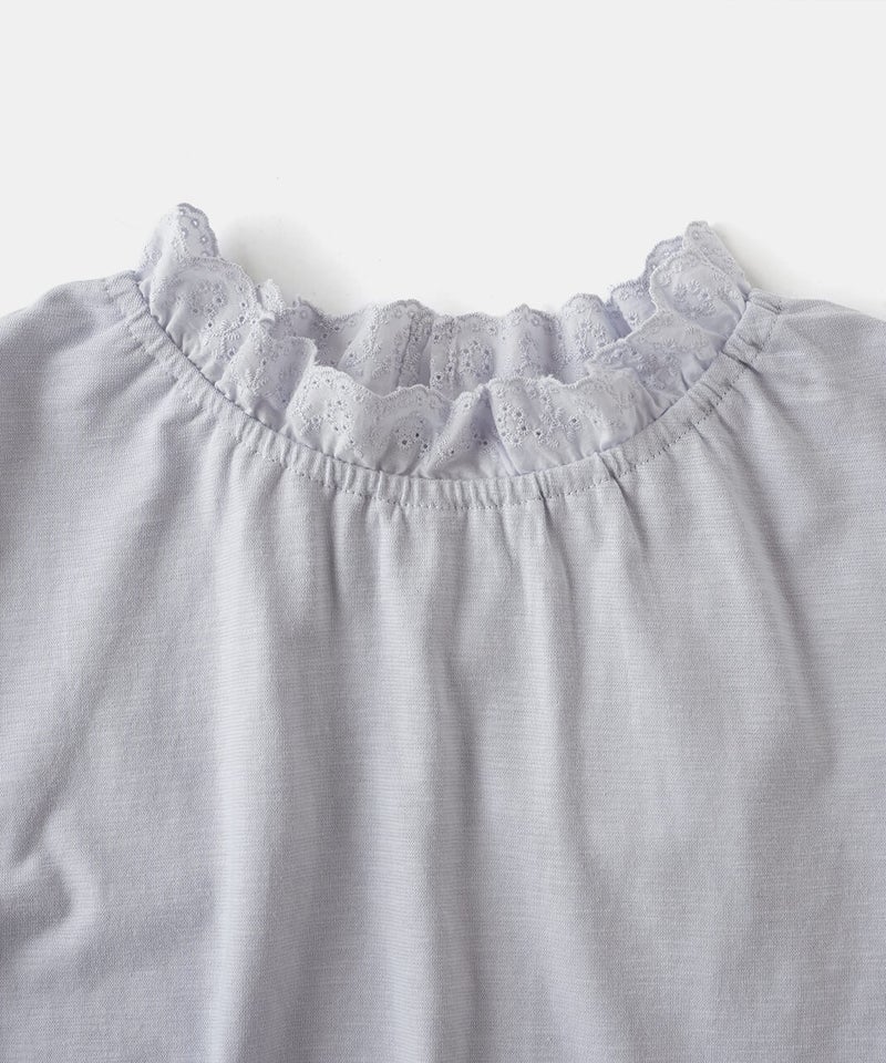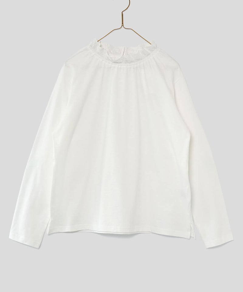 首元にフリルをあしらったカットソーです。 肌触りの良いコットン素材を使用。 ネック周りに繊細なコットンレースをあしらい、程よい甘さのナチュラル感を演出してくれます。