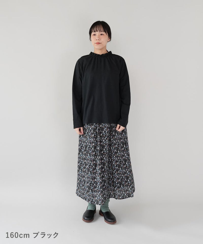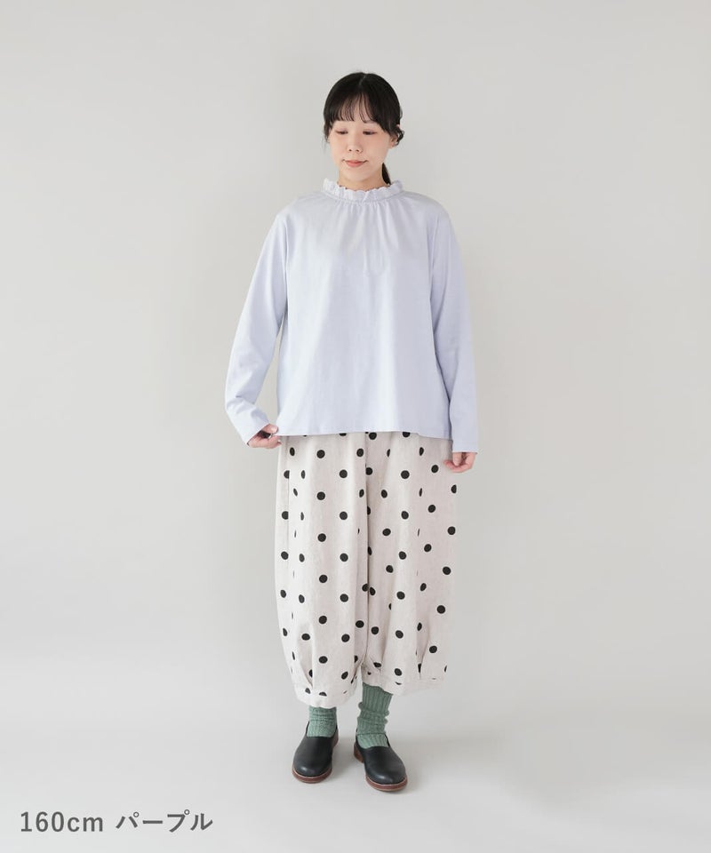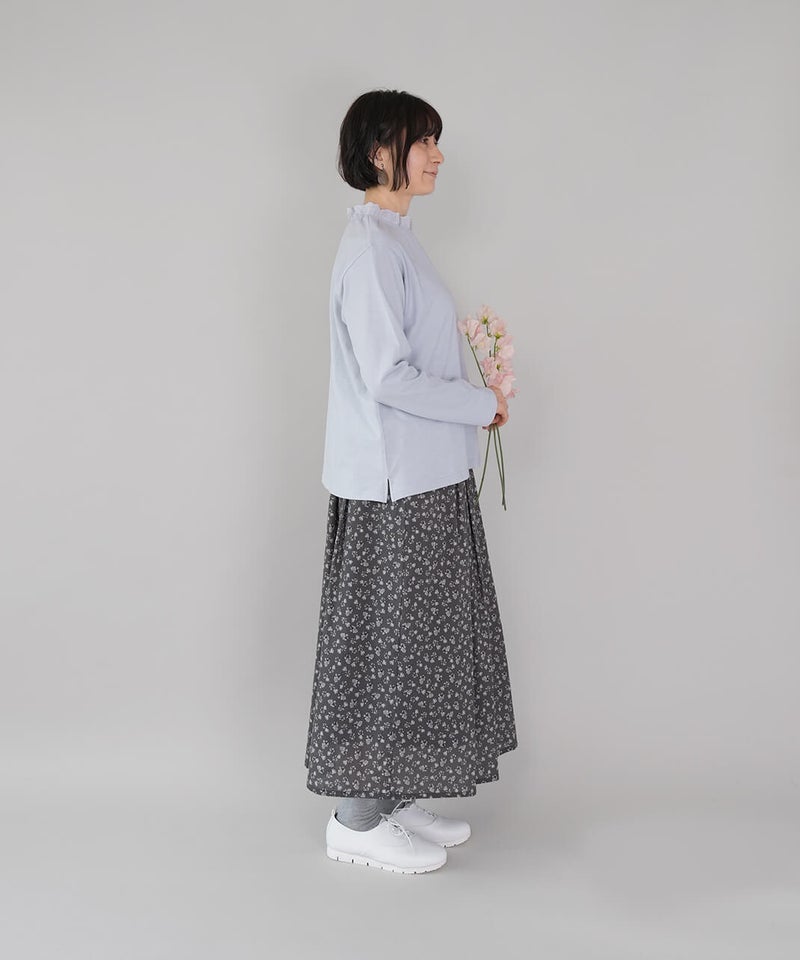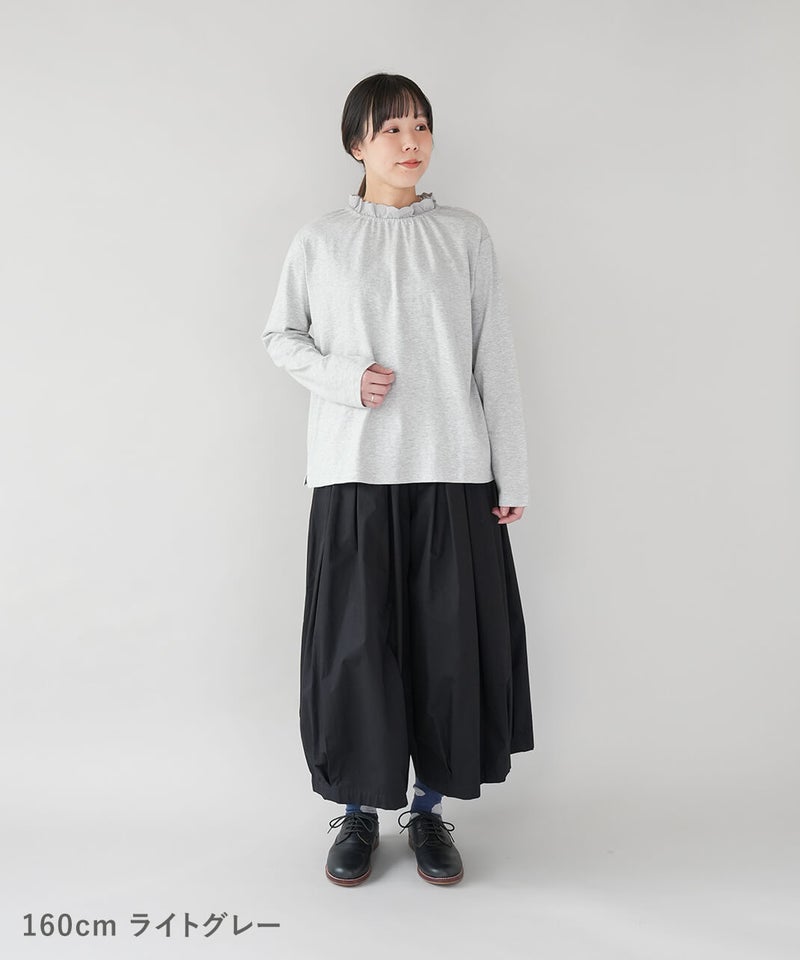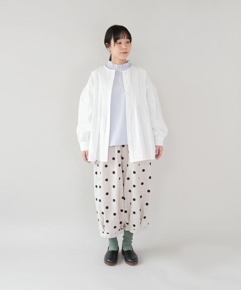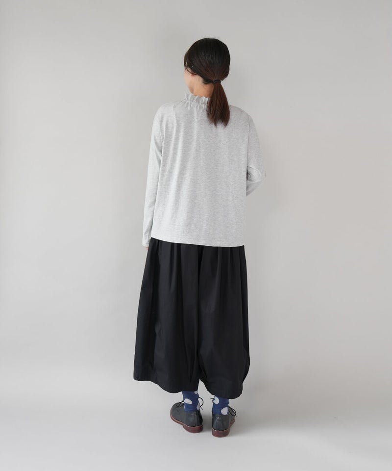 背側の襟元には涙開きにし、ボタンで着脱のしやすいのデザインに。 シンプルなデザインながらも、首元のディテールがアクセントになります。 身幅に少しゆとりを持たせたリラックス感のある着心地です。 カジュアルなスウェットと合わせたり、ワンピースやカーディガンとのレイヤードスタイルにもおすすめです。