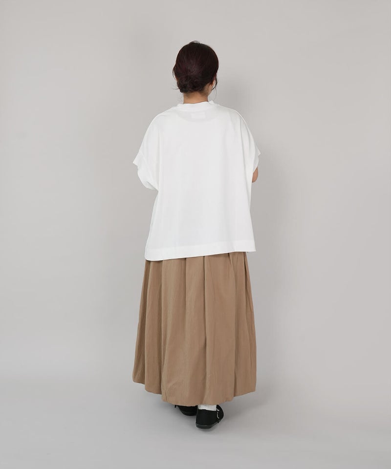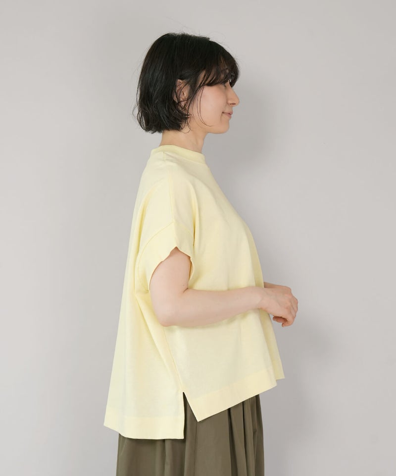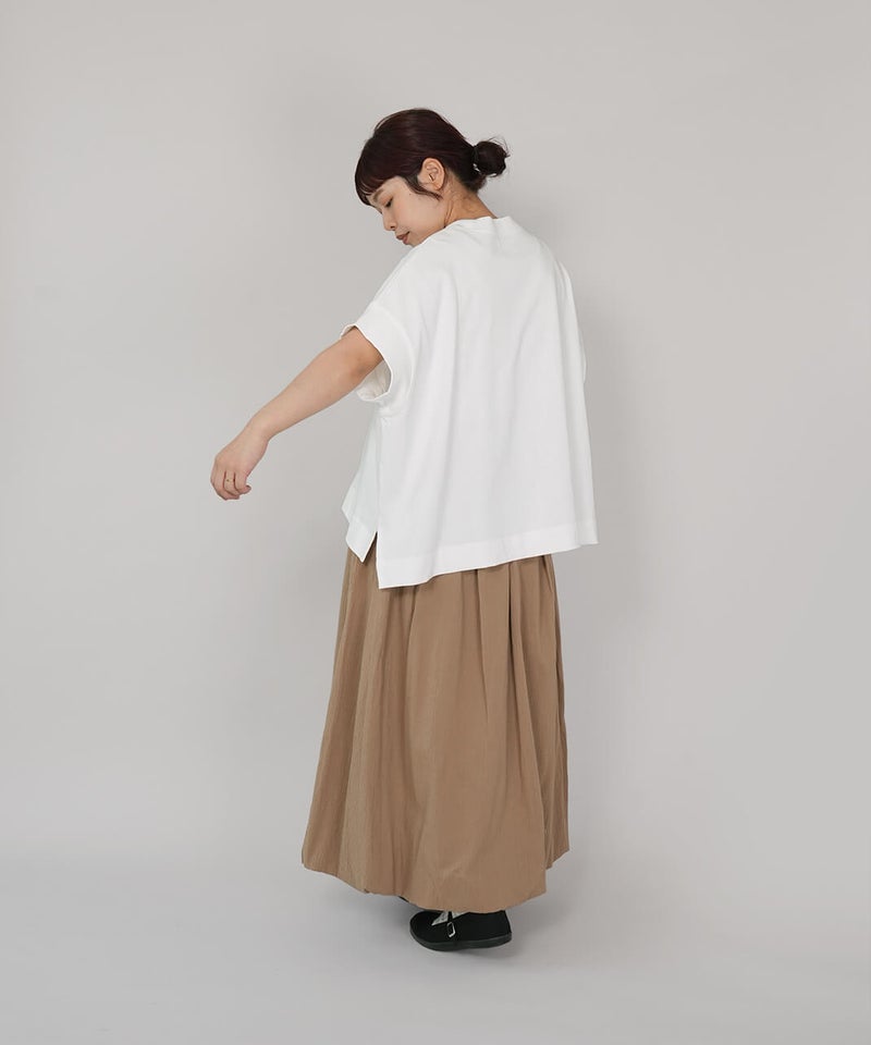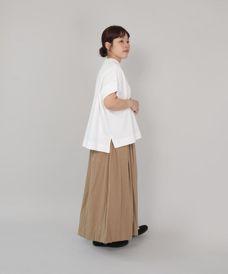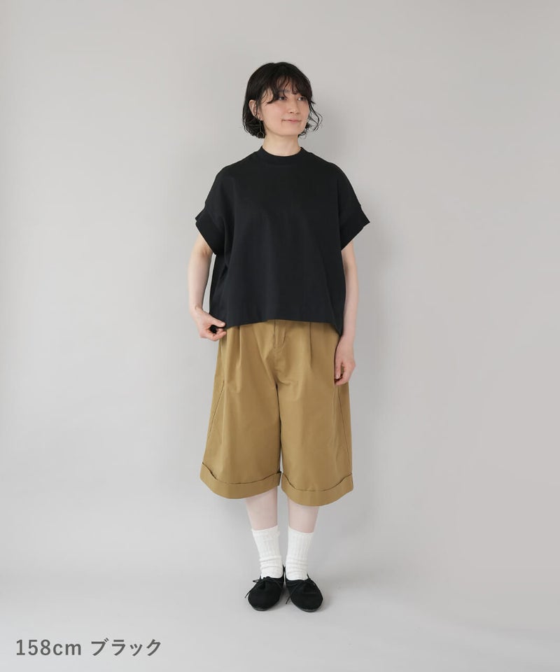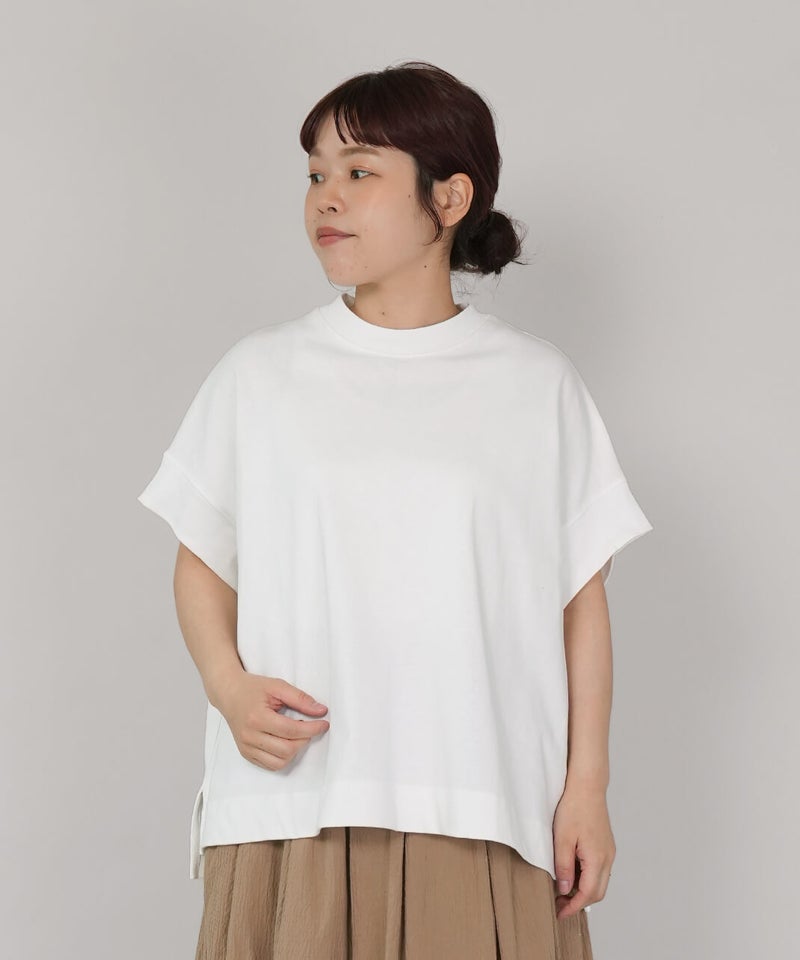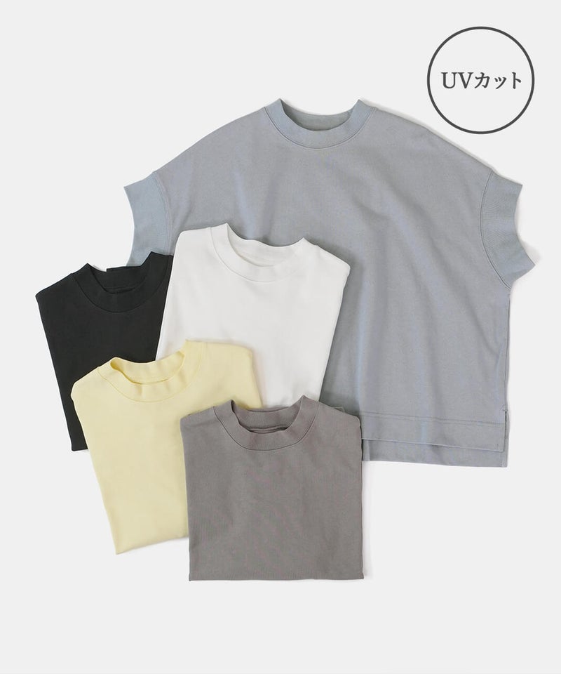 ワイドなボックスシルエットと程よい長さのフレンチ袖でゆったりさの中にすっきりを見せてくれます。シンプルなデザインはコーディネートに馴染みやすく、重宝する1着です。生地にUV加工を施しているため、紫外線遮蔽率90%以上(白は80%以上)です。