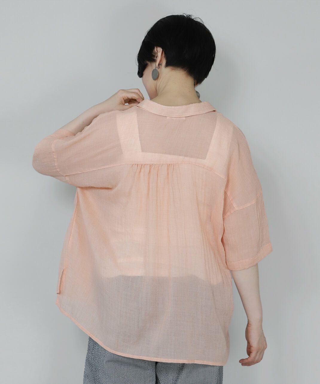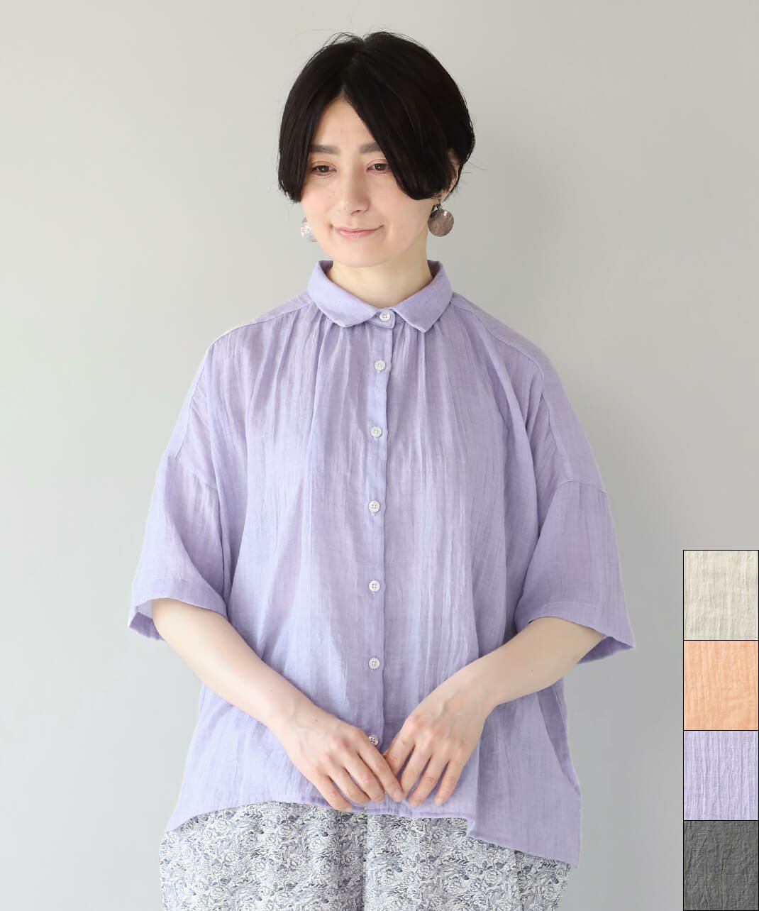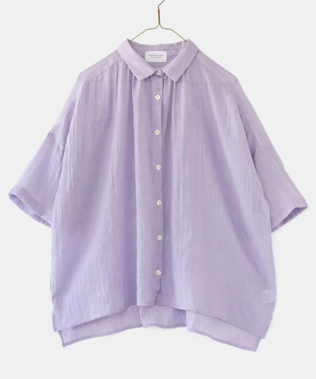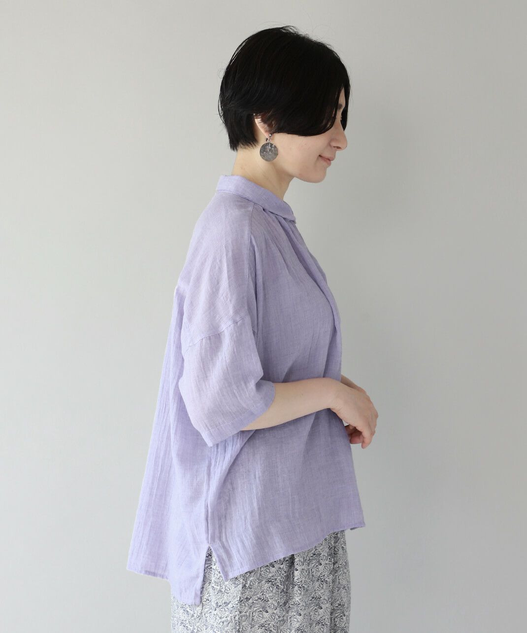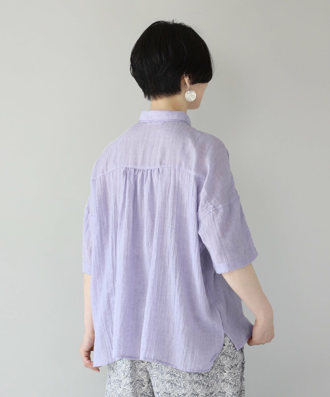 薄くて軽く、柔らかなコットンポリエステルガーゼの5分袖シャツです。 少しの透け感とシワの風合いがナチュラルな印象を演出してくれます。ワイドな身頃とドロップショルダー、襟ぐりに寄せたギャザーで裾に向かってふんわり広がるAラインシルエットに仕上げました。シャツとしてはもちろん、ボタンを開けて羽織りとしての着用もおすすめです。
