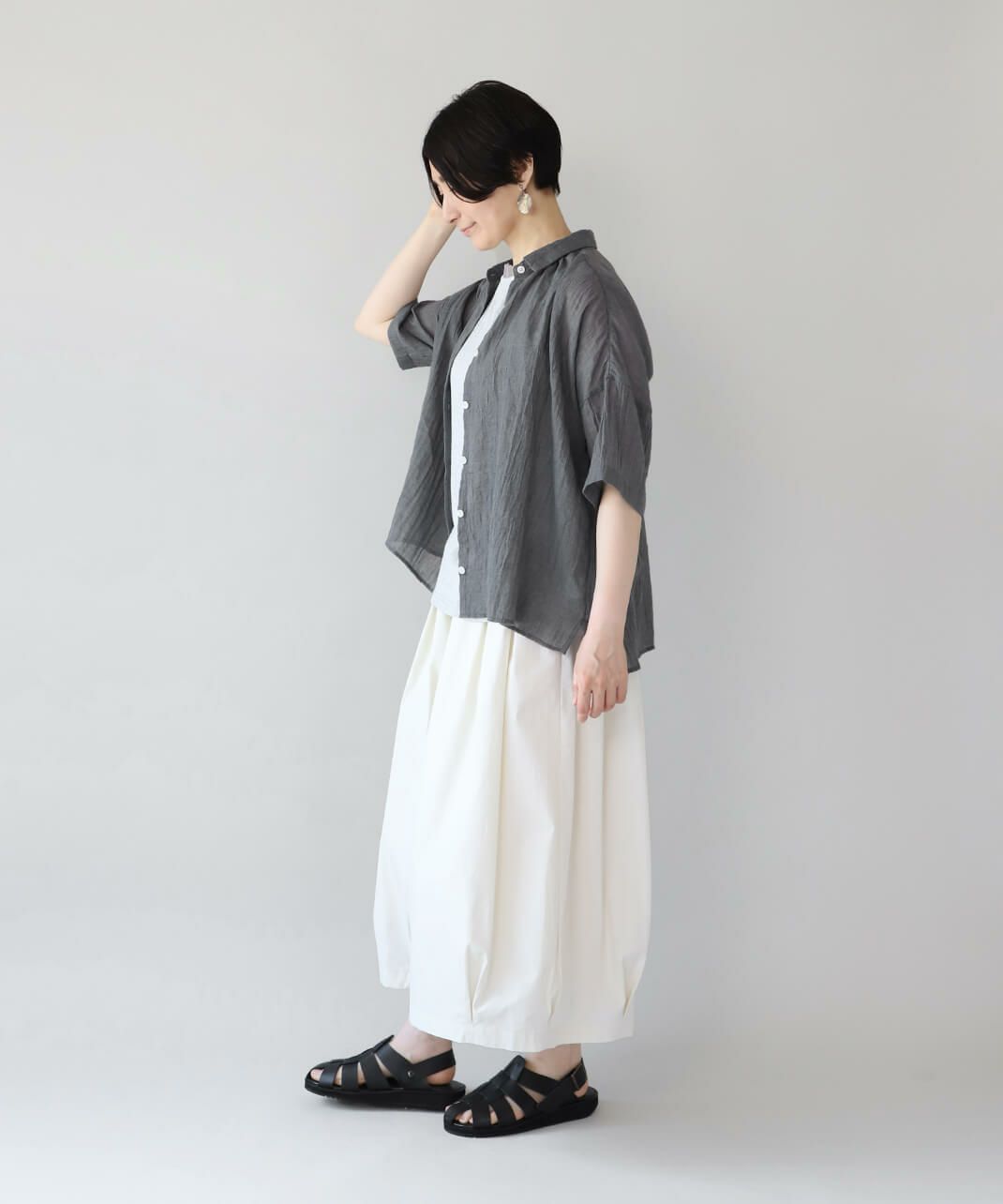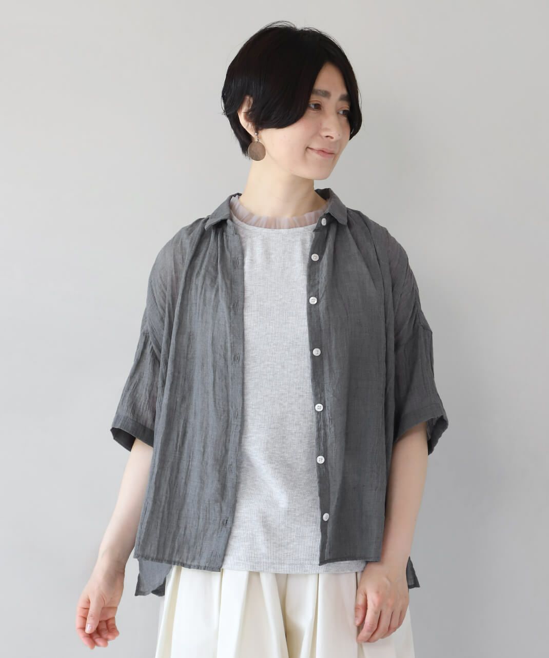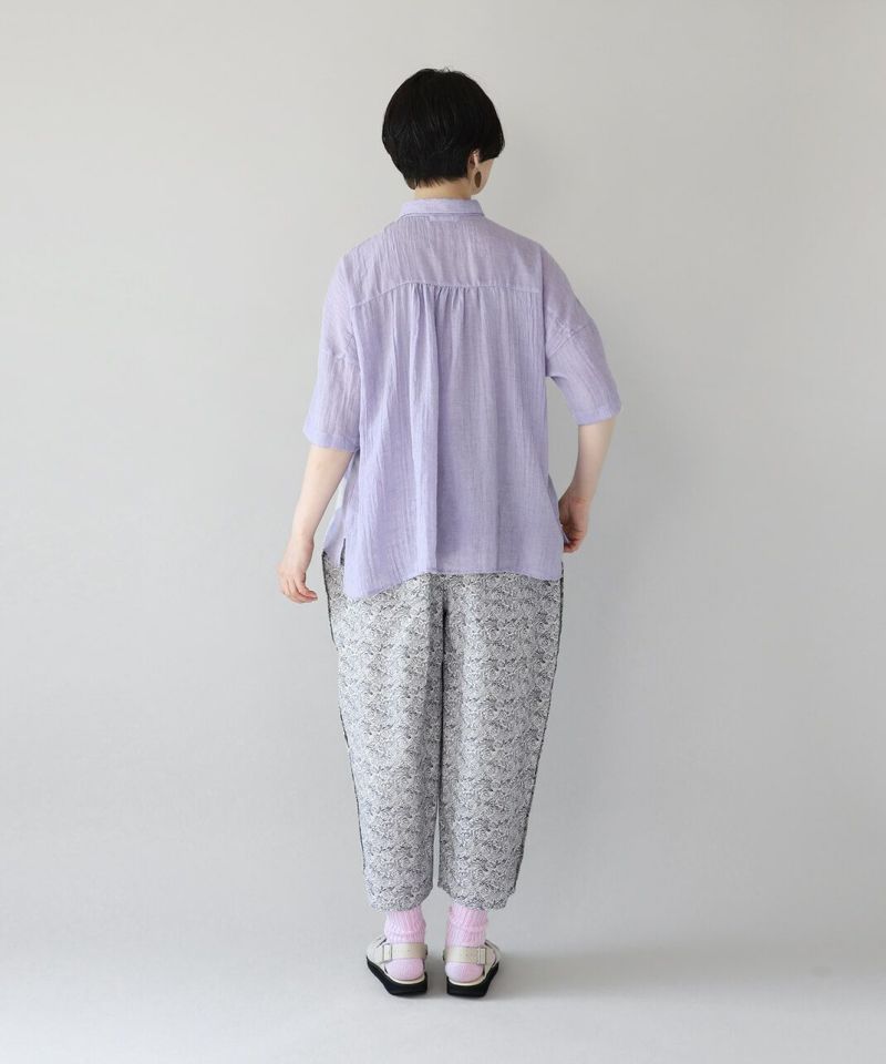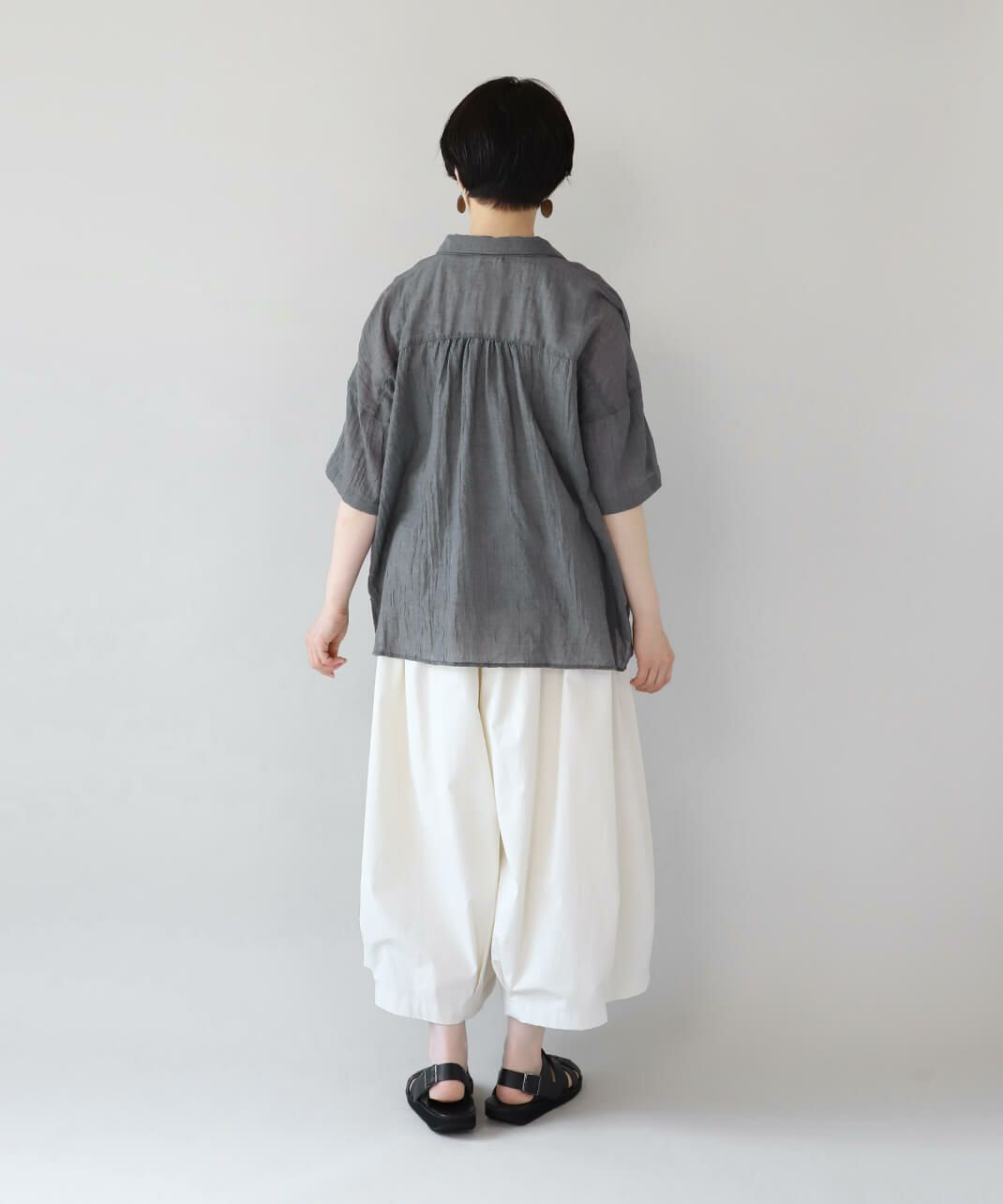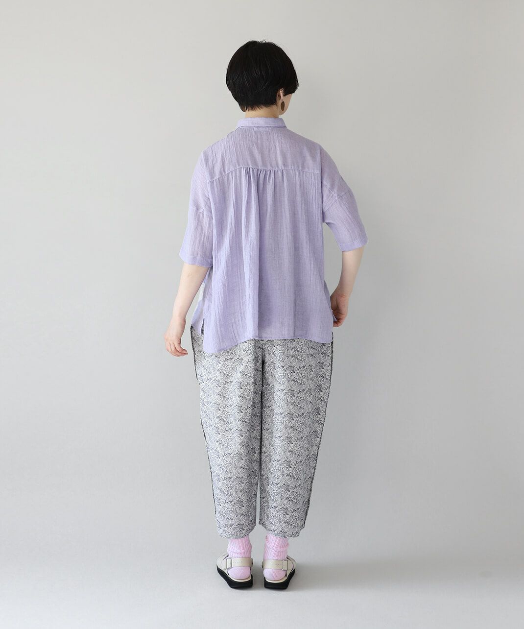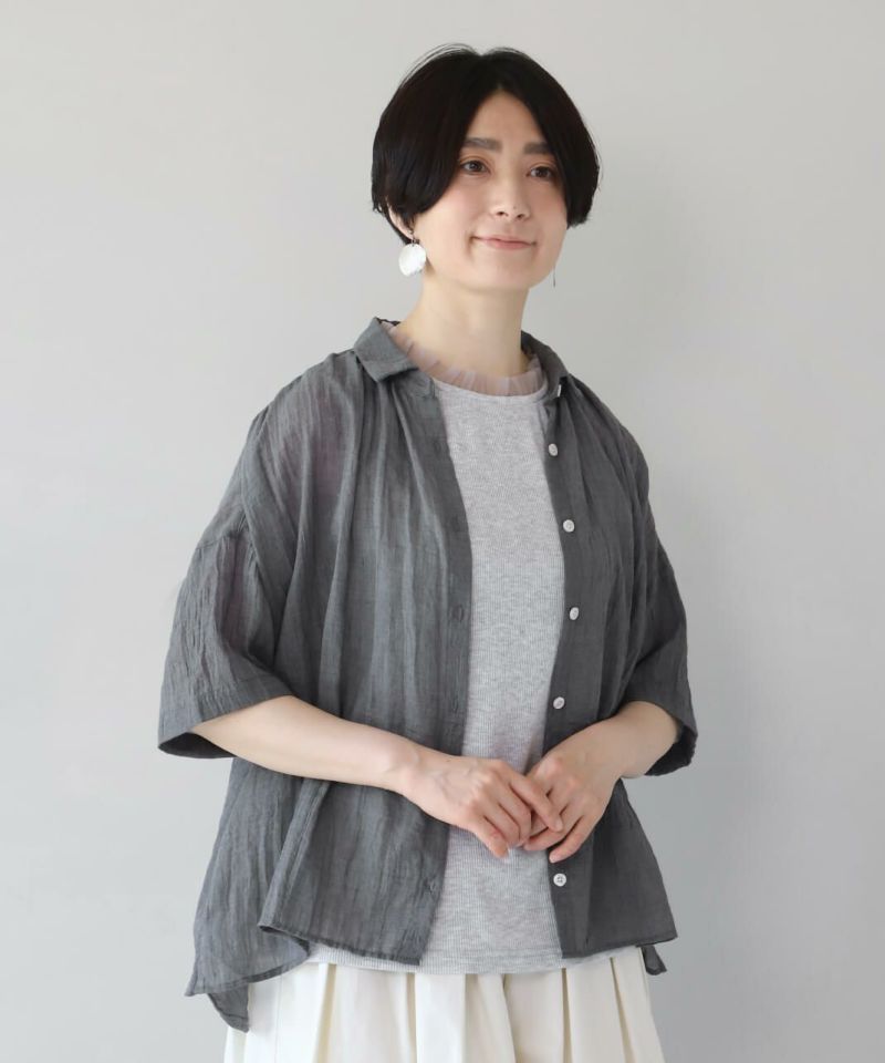 薄くて軽く、柔らかなコットンポリエステルガーゼの5分袖シャツです。 少しの透け感とシワの風合いがナチュラルな印象を演出してくれます。ワイドな身頃とドロップショルダー、襟ぐりに寄せたギャザーで裾に向かってふんわり広がるAラインシルエットに仕上げました。シャツとしてはもちろん、ボタンを開けて羽織りとしての着用もおすすめです。