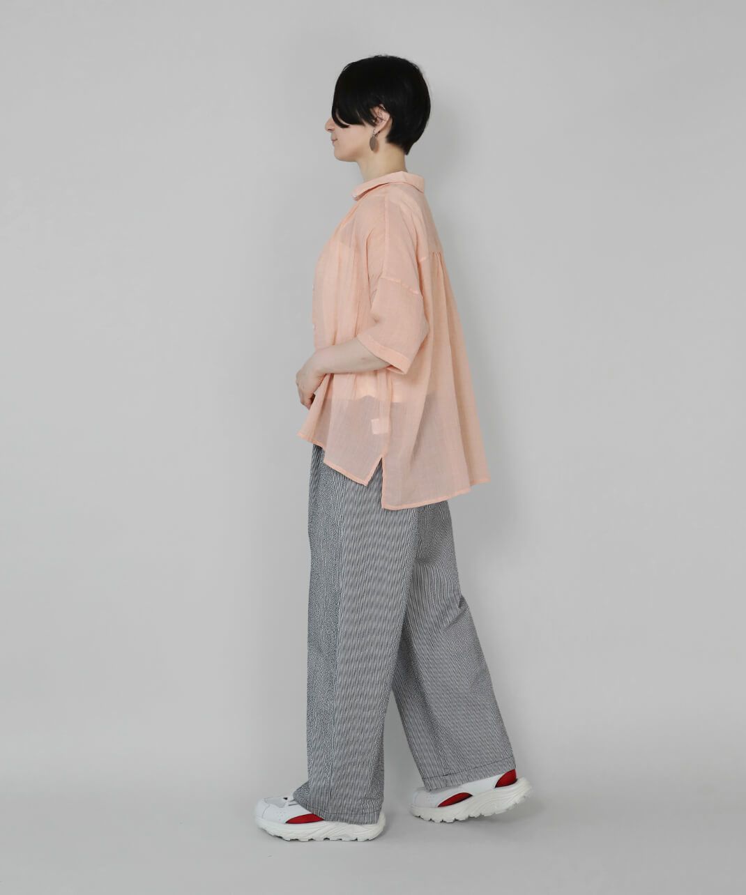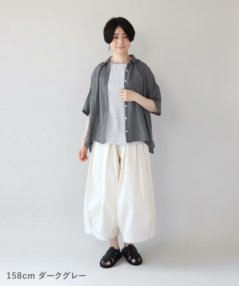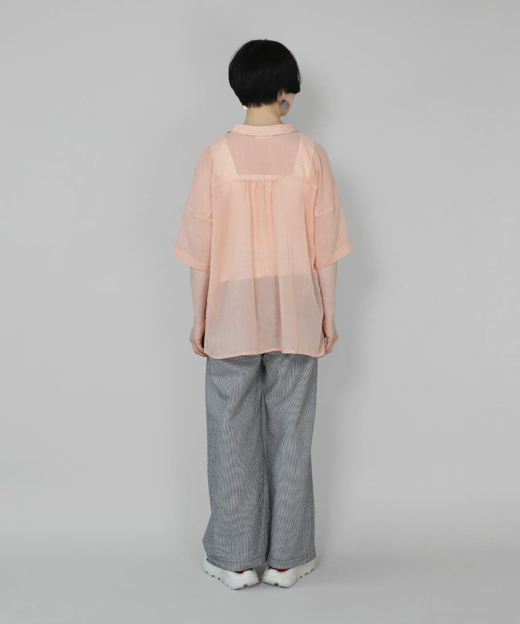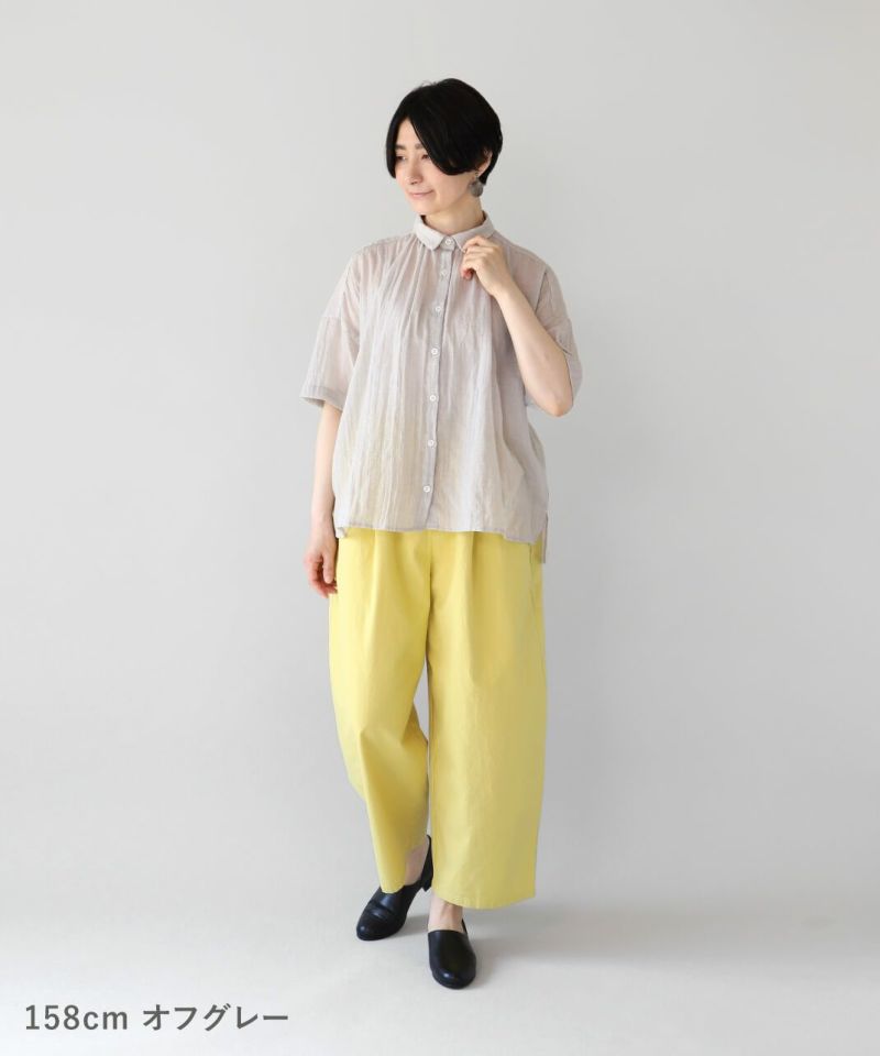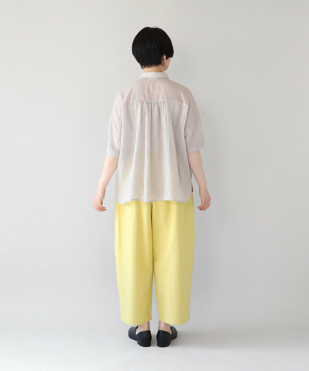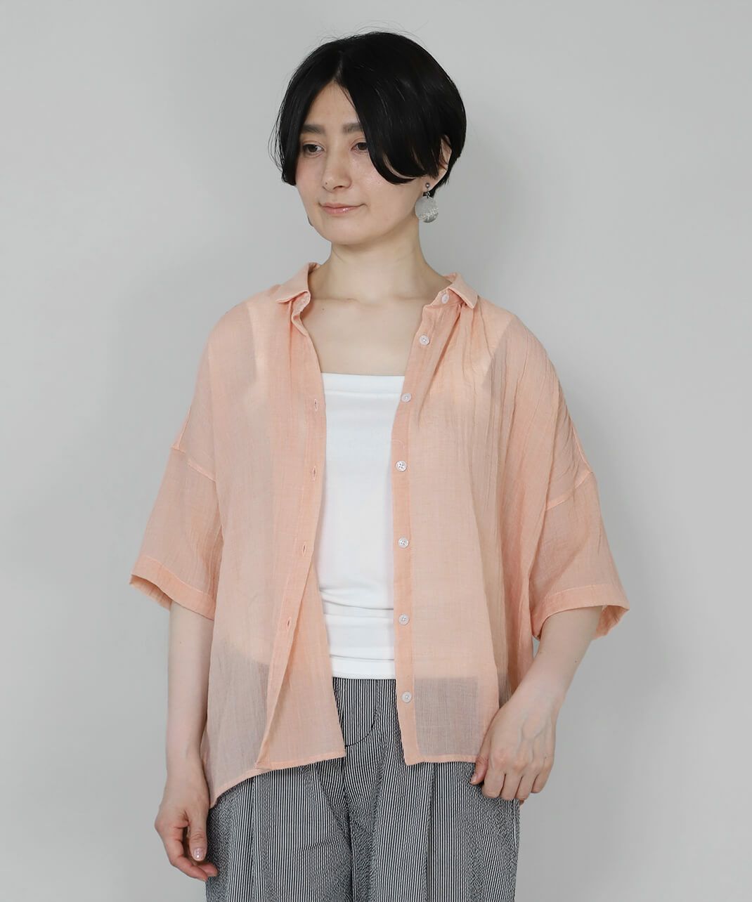 薄くて軽く、柔らかなコットンポリエステルガーゼの5分袖シャツです。 少しの透け感とシワの風合いがナチュラルな印象を演出してくれます。ワイドな身頃とドロップショルダー、襟ぐりに寄せたギャザーで裾に向かってふんわり広がるAラインシルエットに仕上げました。シャツとしてはもちろん、ボタンを開けて羽織りとしての着用もおすすめです。