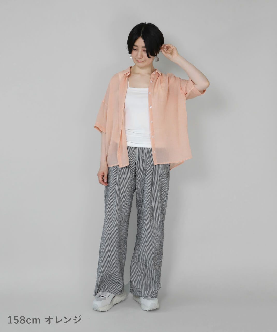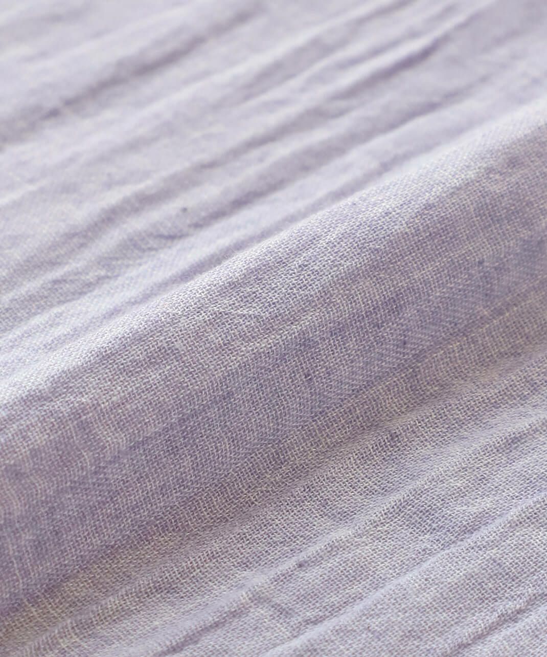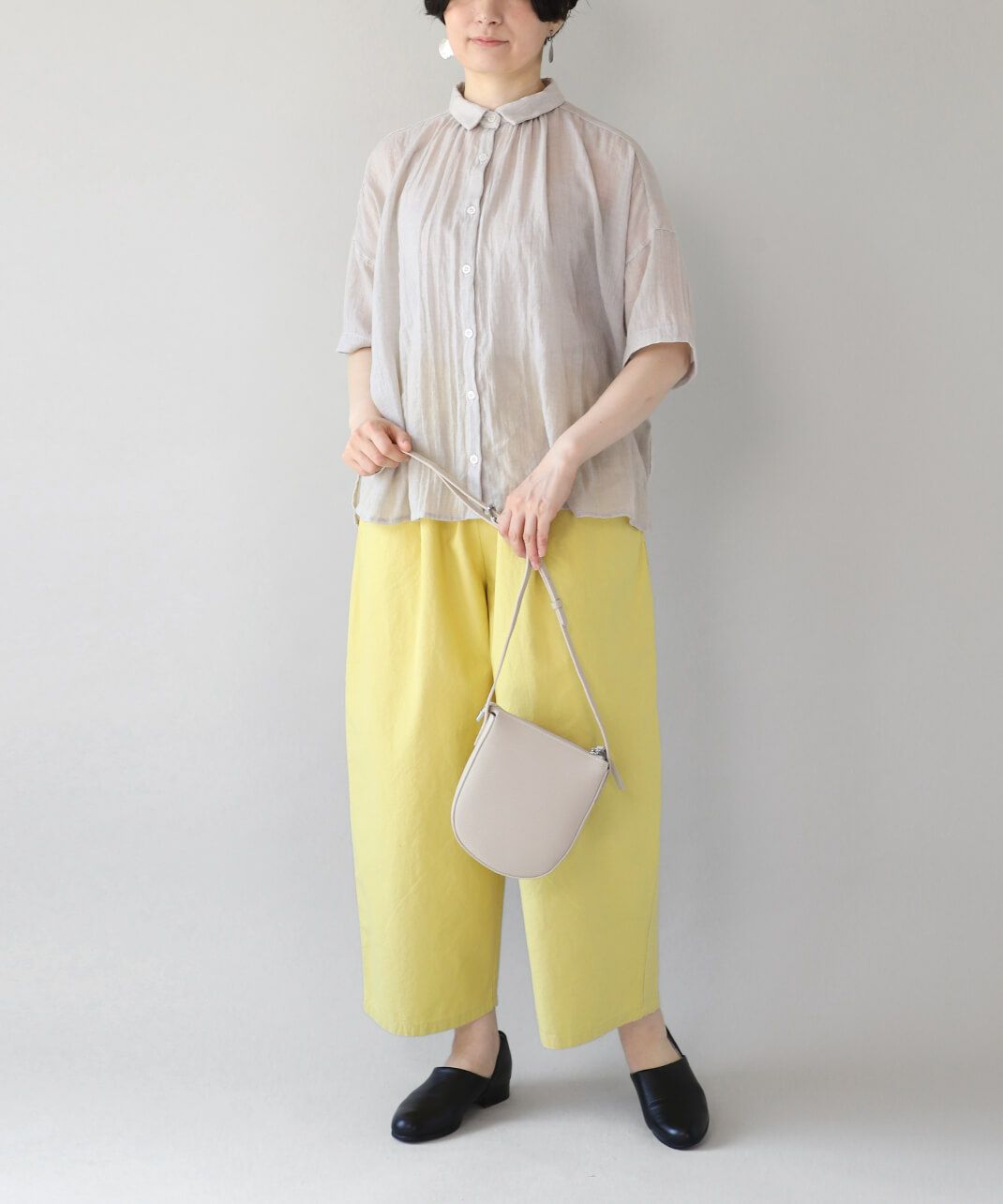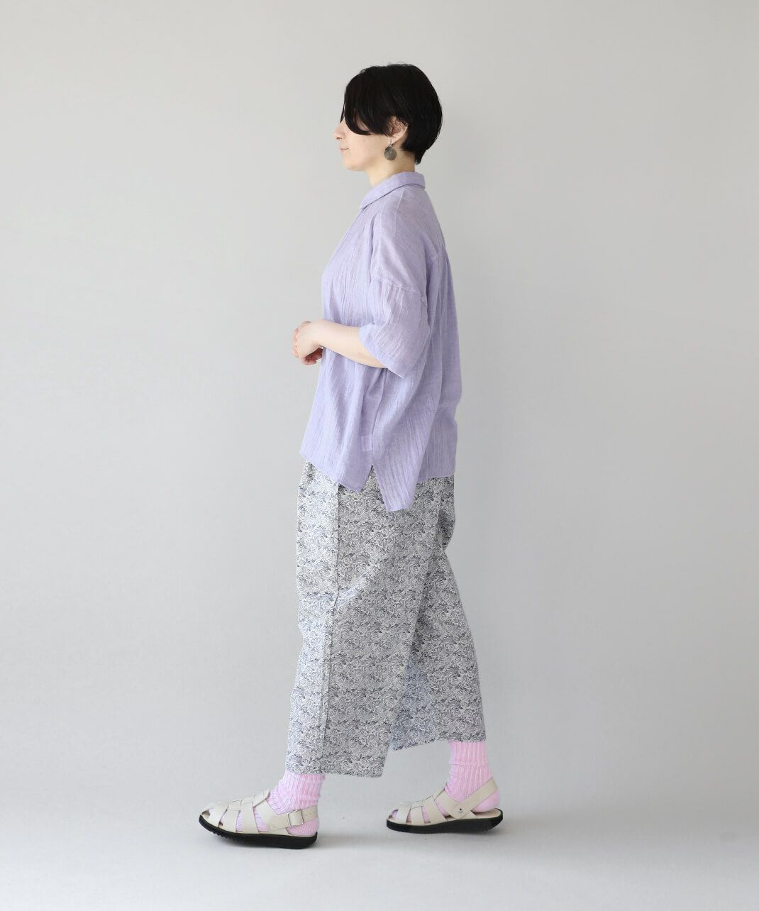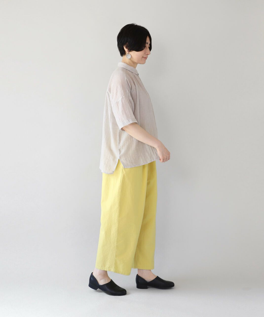 薄くて軽く、柔らかなコットンポリエステルガーゼの5分袖シャツです。 少しの透け感とシワの風合いがナチュラルな印象を演出してくれます。ワイドな身頃とドロップショルダー、襟ぐりに寄せたギャザーで裾に向かってふんわり広がるAラインシルエットに仕上げました。シャツとしてはもちろん、ボタンを開けて羽織りとしての着用もおすすめです。