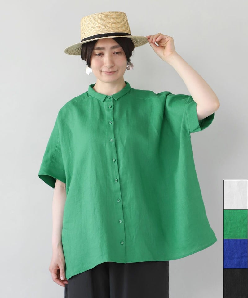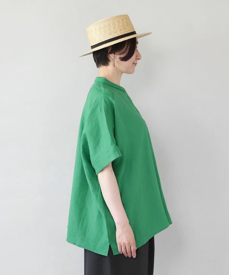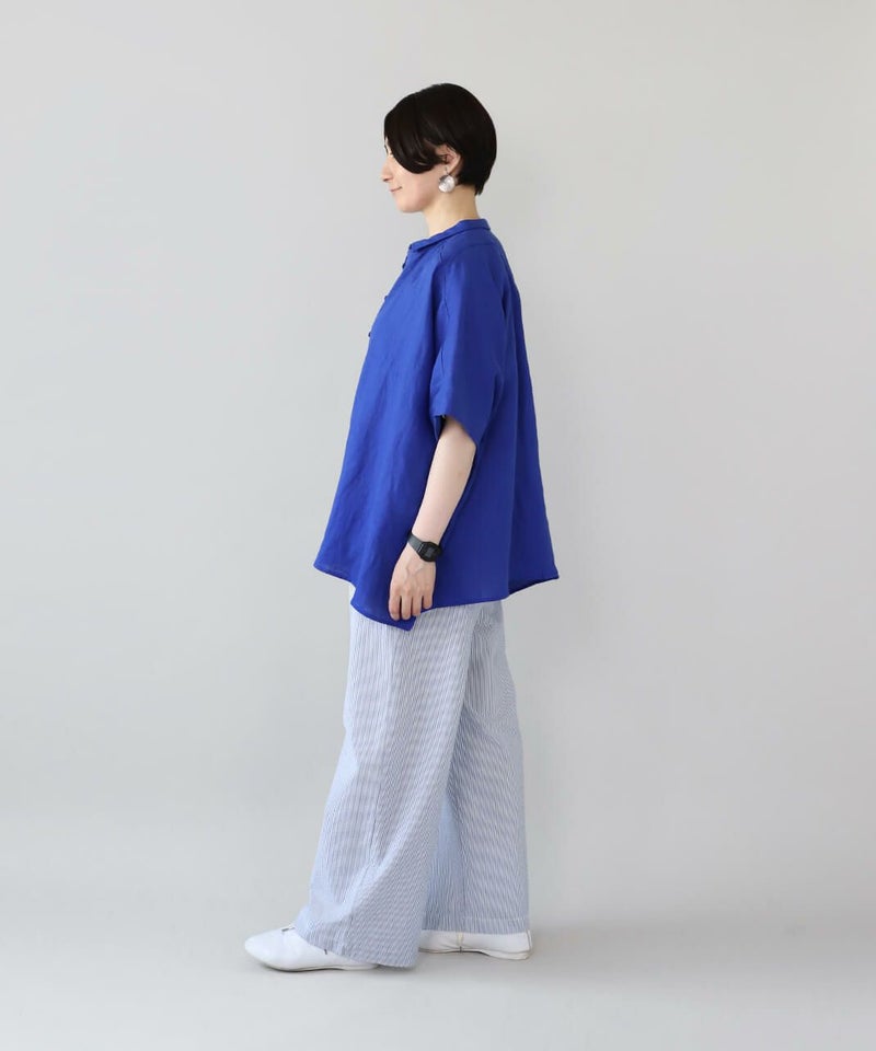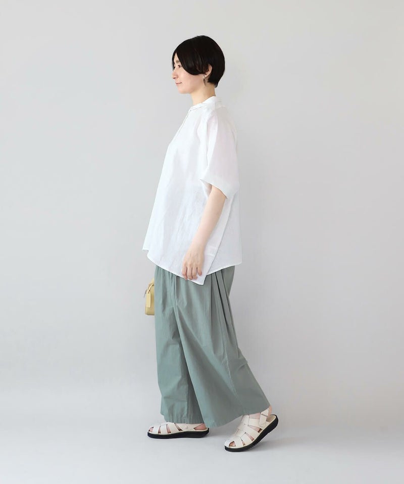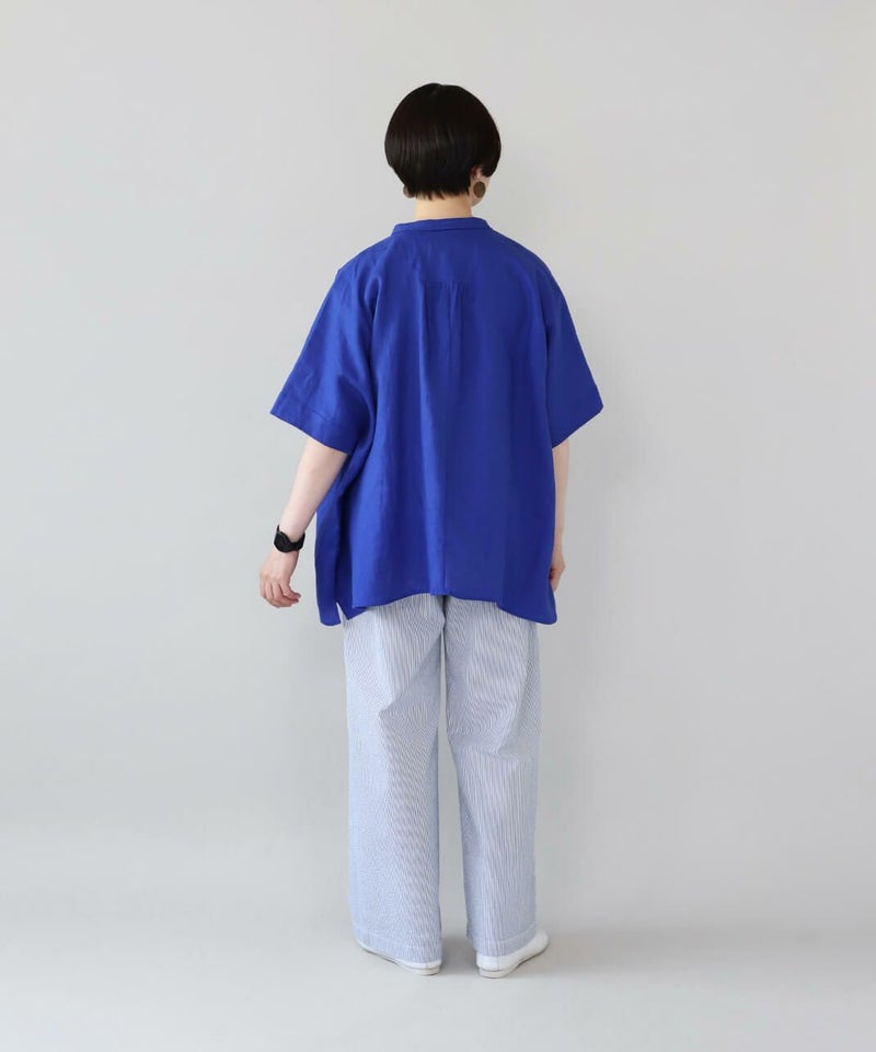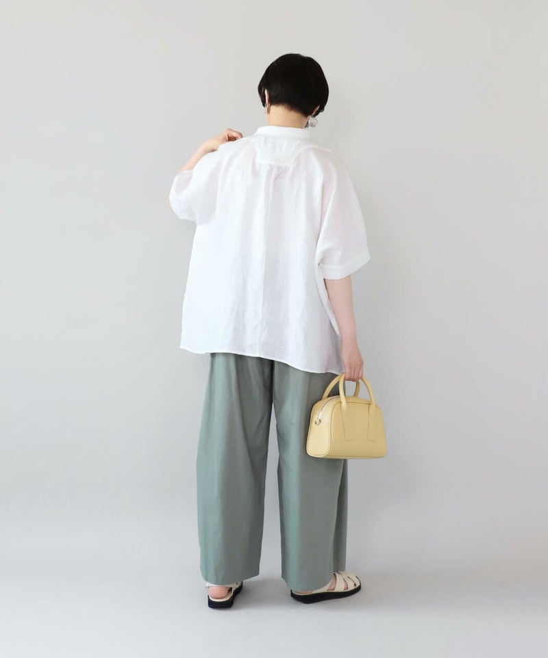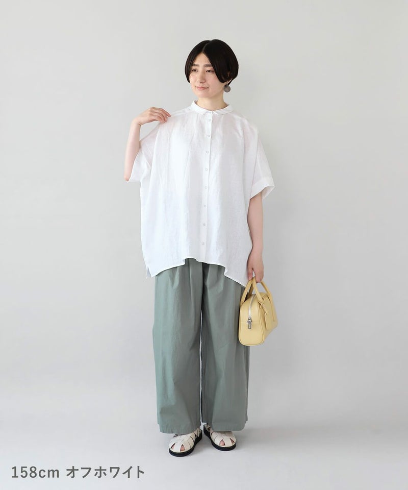 やや光沢のあるリネンを使用した小さな襟のワイドブラウスです。 ワイドなボックスシルエットでゆったりとリラックスした着心地。同じリネン生地のくるみボタンを使用しています。肩周辺の切替えは身体に沿うようにデザインされています。シンプルながら洗練されたナチュラルな雰囲気を演出してくれます。 きれいなシルエットなので、羽織りとしてもおすすめです。