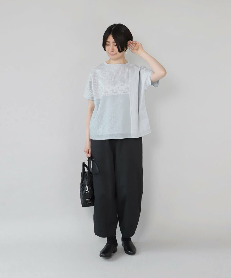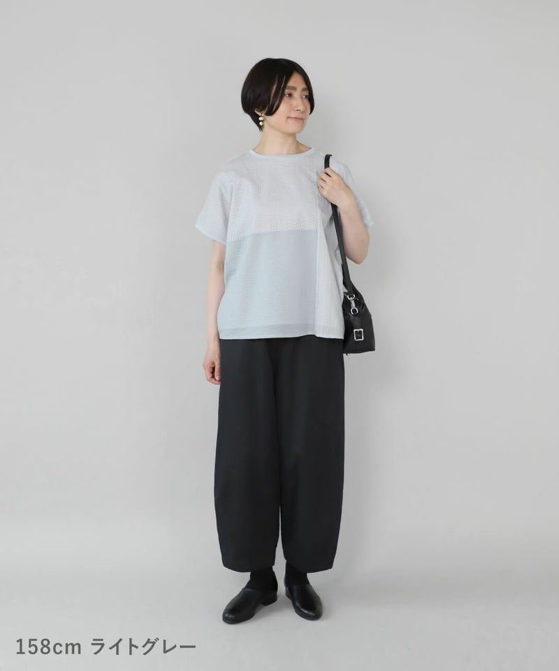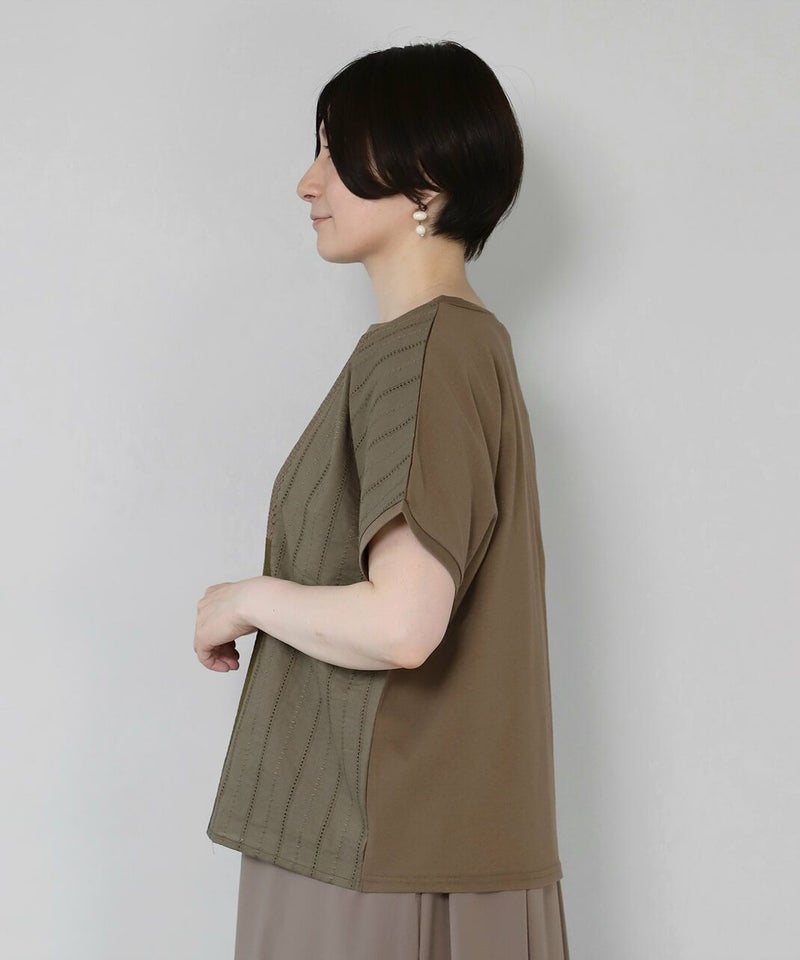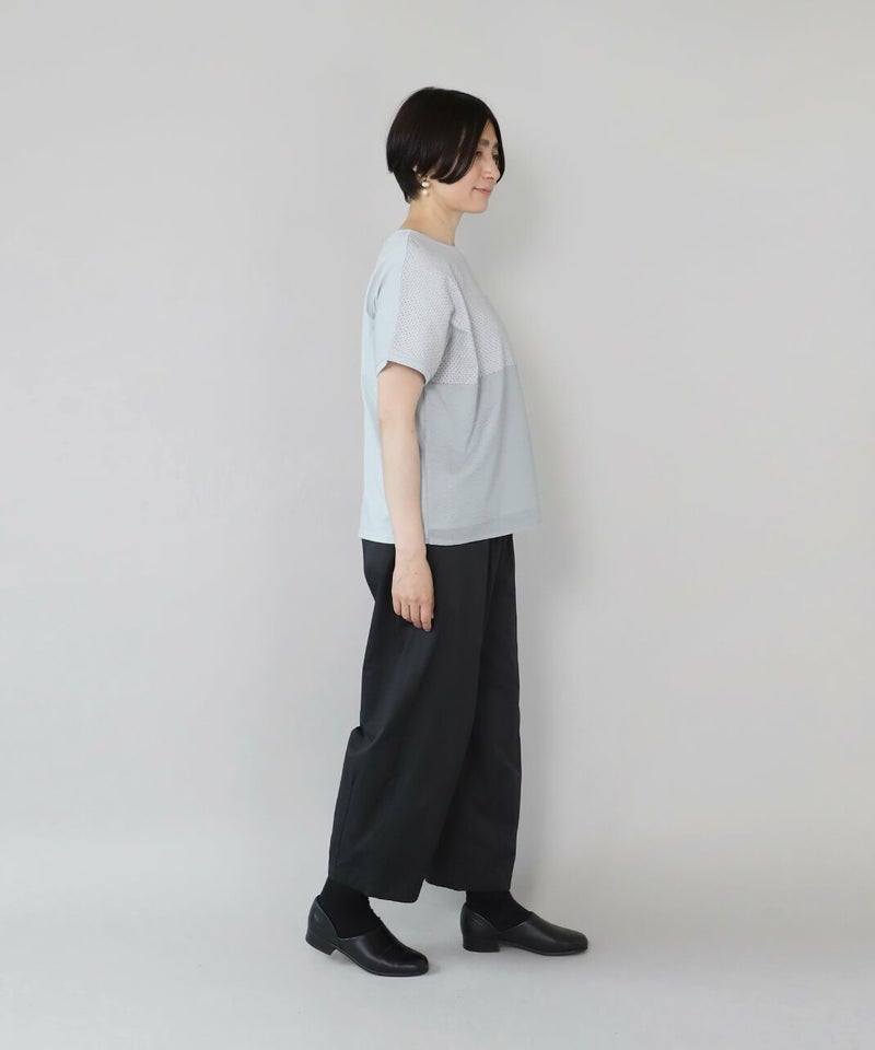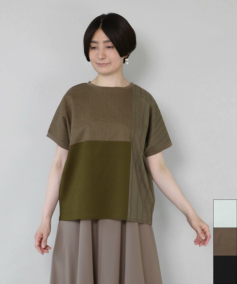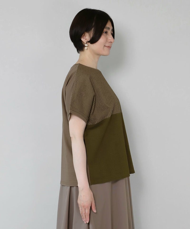前にカットワークレースと凹凸感のある生地、後ろは伸縮性のあるコットンを組み合わせたコンビプルオーバーです。 ややワイドな身幅のでTシャツのようにさっと着られて、1枚で様になります。フロントにあしらったレースのパッチワークが可愛らしさを演出してくれます。レース部分は透けないように2枚仕立てになっています。どんなスタイルにも合わせやすく、コーディネートを楽しめます。