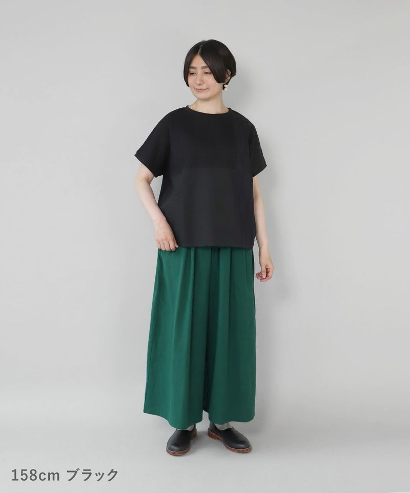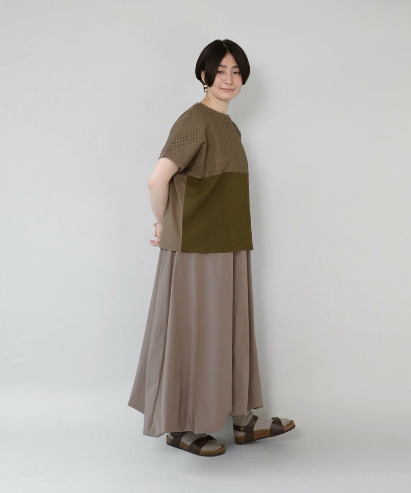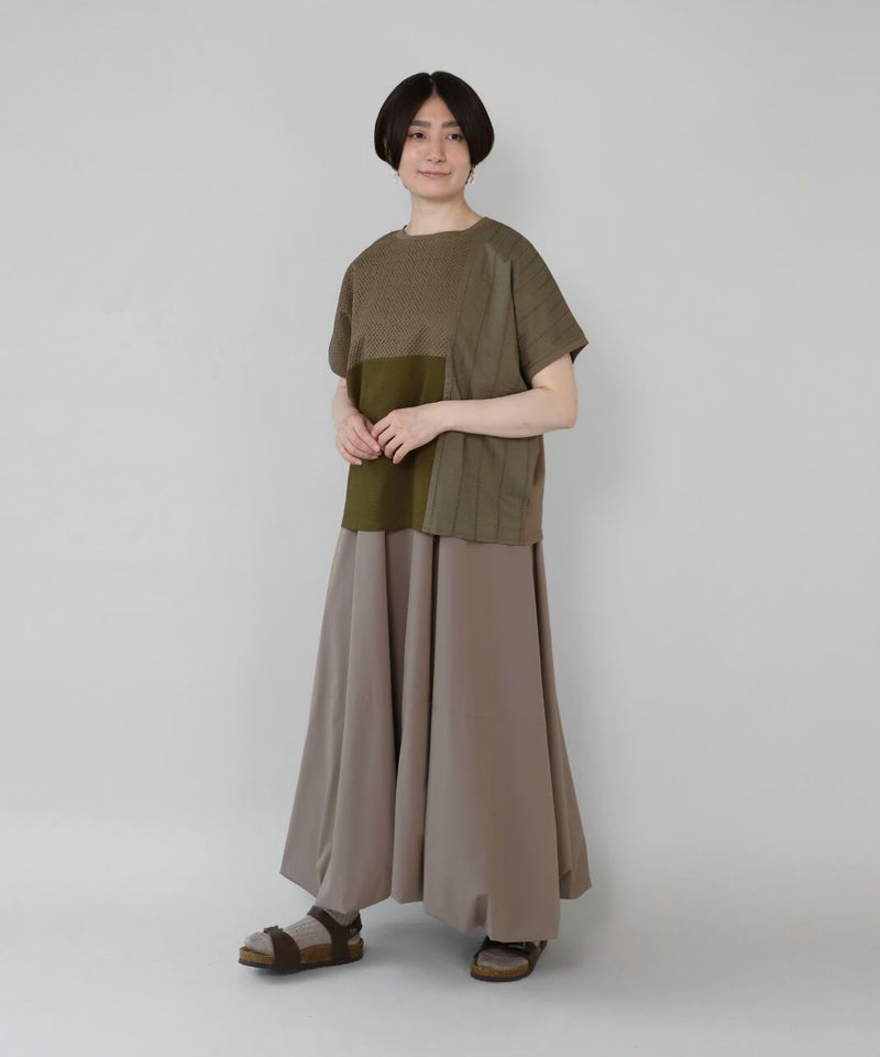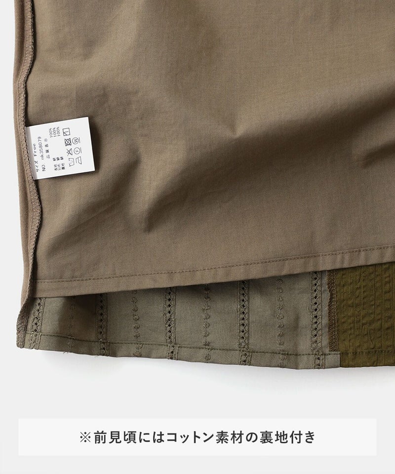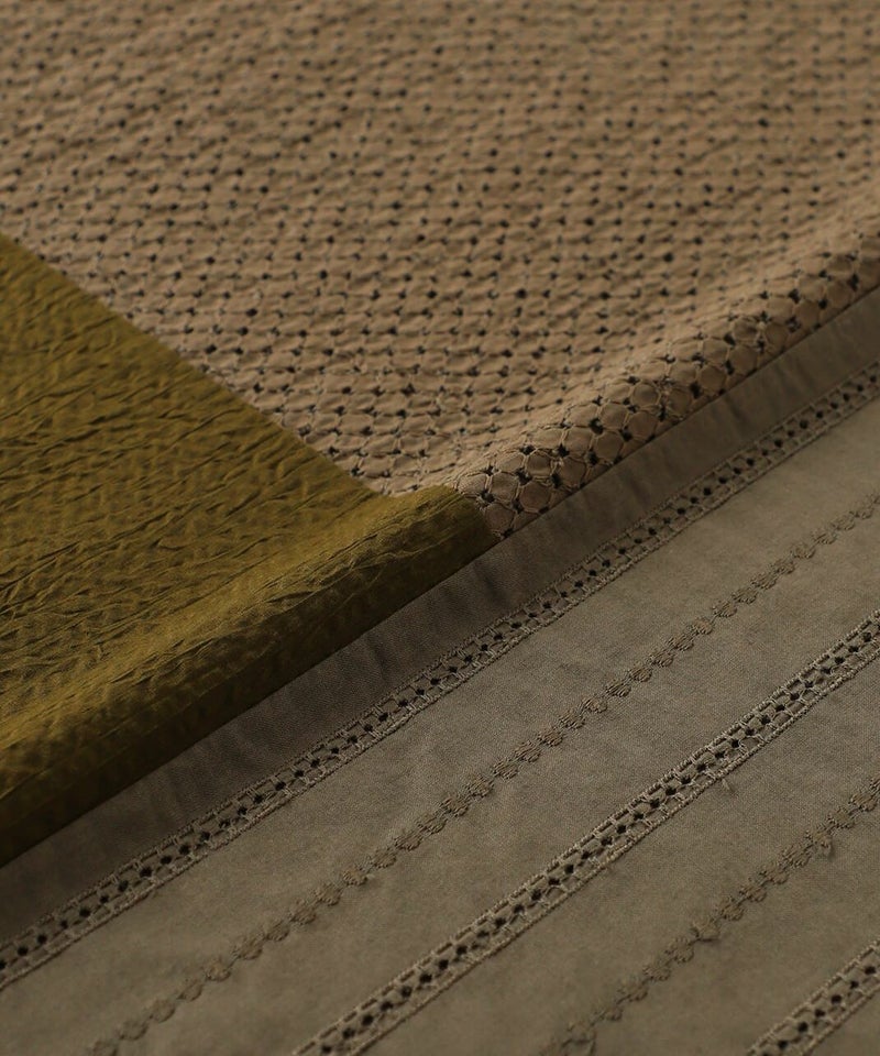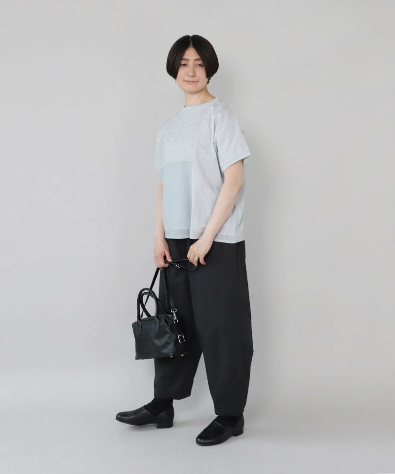 前にカットワークレースと凹凸感のある生地、後ろは伸縮性のあるコットンを組み合わせたコンビプルオーバーです。 ややワイドな身幅のでTシャツのようにさっと着られて、1枚で様になります。フロントにあしらったレースのパッチワークが可愛らしさを演出してくれます。レース部分は透けないように2枚仕立てになっています。どんなスタイルにも合わせやすく、コーディネートを楽しめます。