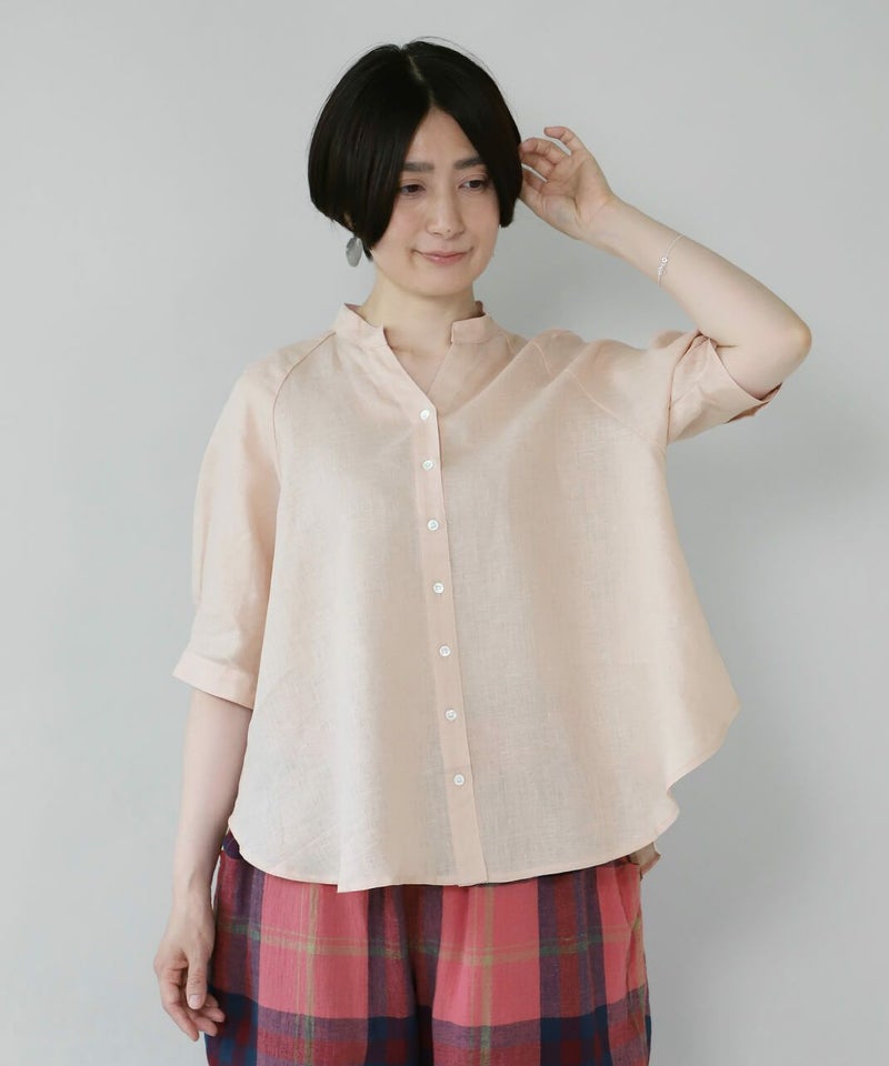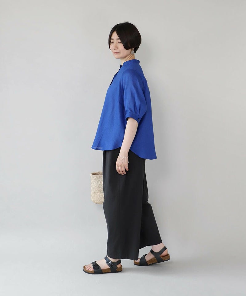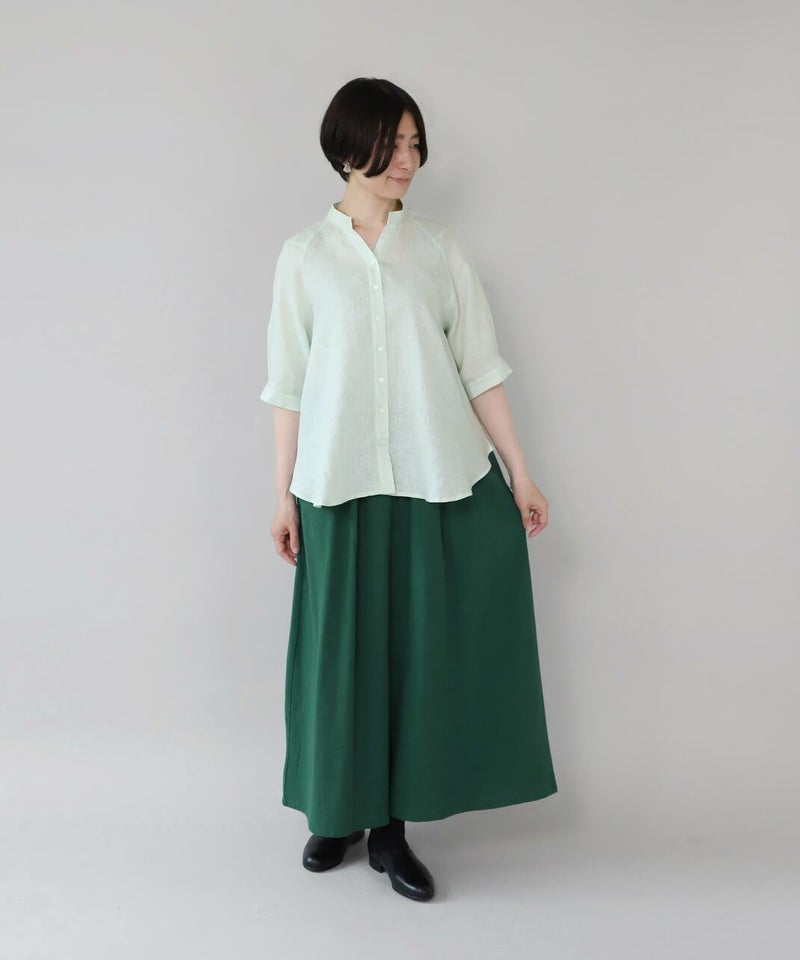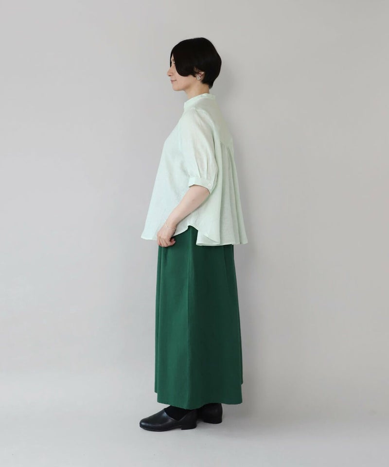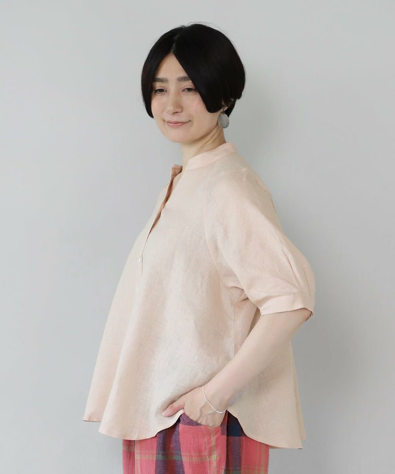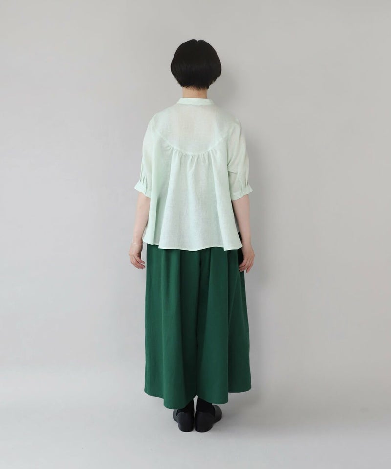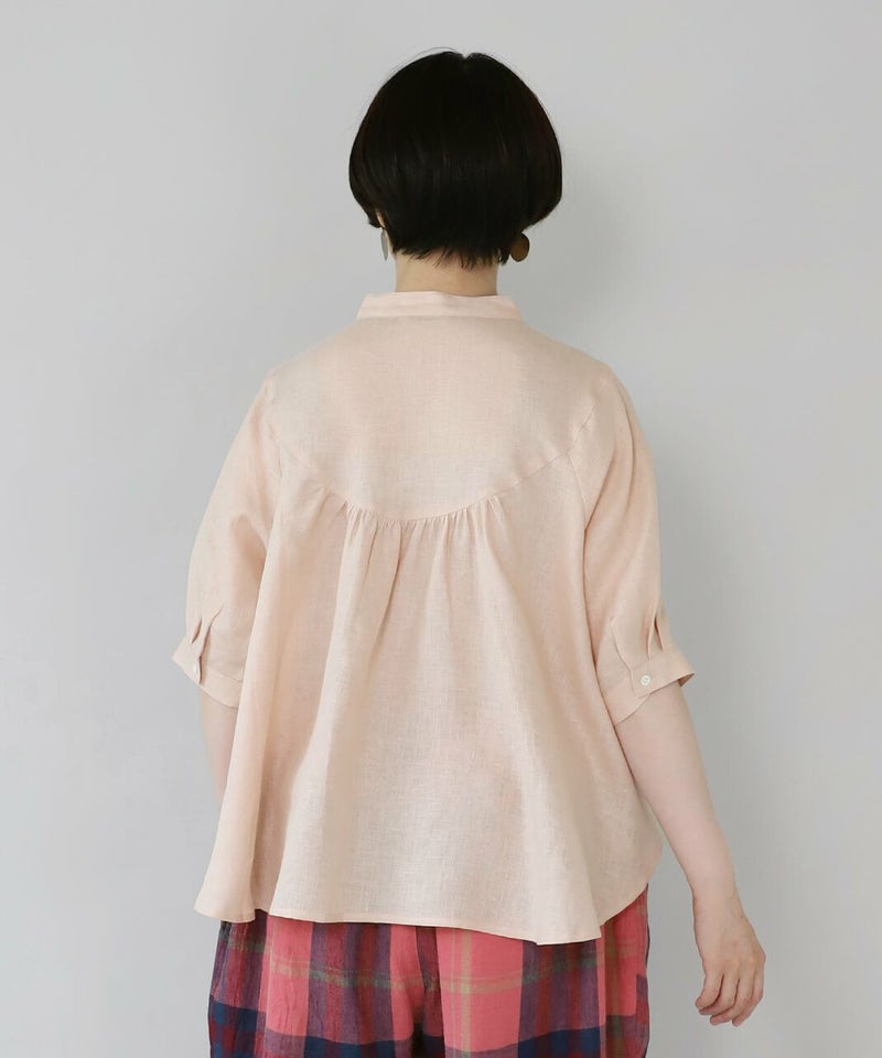 少しハリのあるリネン生地を使用したデザインブラウスです。 スキッパーネックに低めのスタンドカラーを合わせ、すっきりとした仕上り。ラグランスリーブの5分袖が二の腕をカバーしてくれます。後ろは身頃にギャザー、袖にタックを施し、ふんわり広がるフレアシルエットに。前と後ろで印象ががらりと変わる、こだわりの詰まった1着です。ボタンを開けて羽織りとしての着用もおすすめです。
