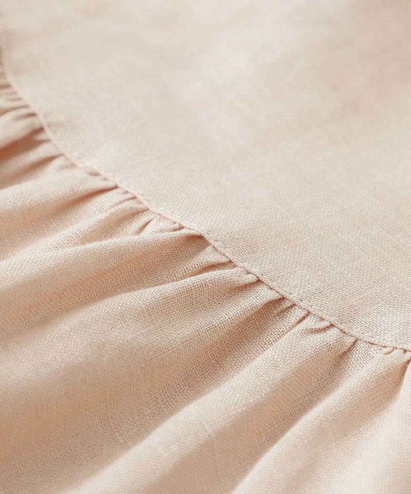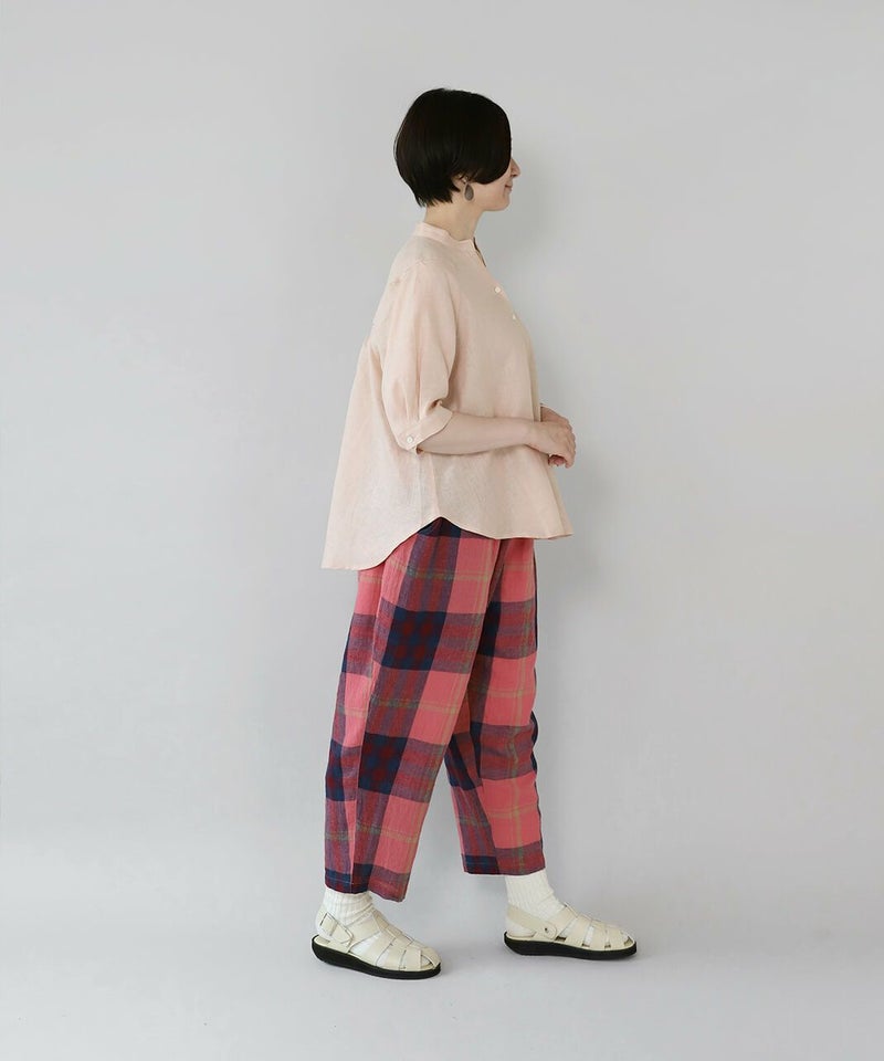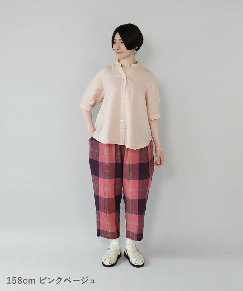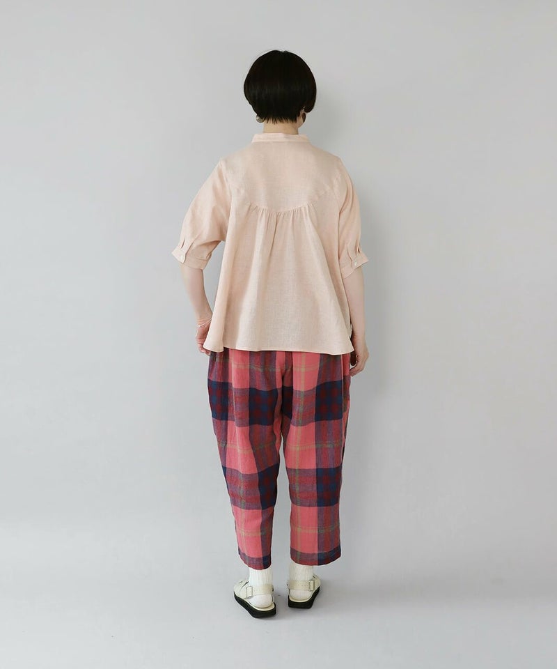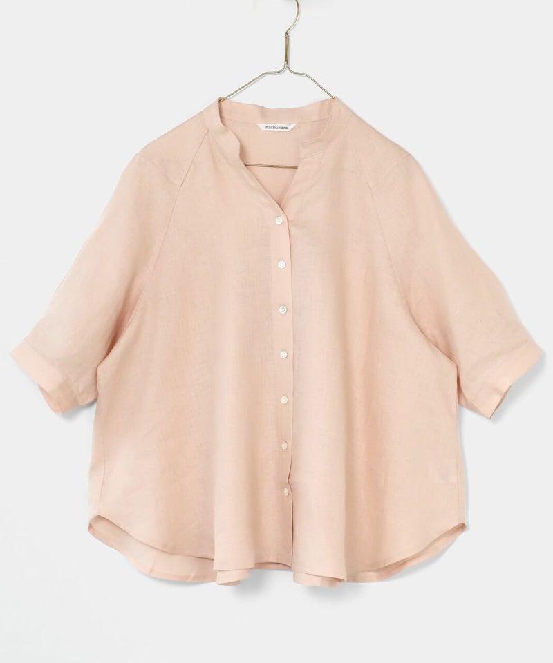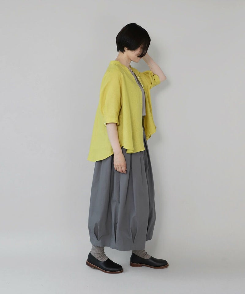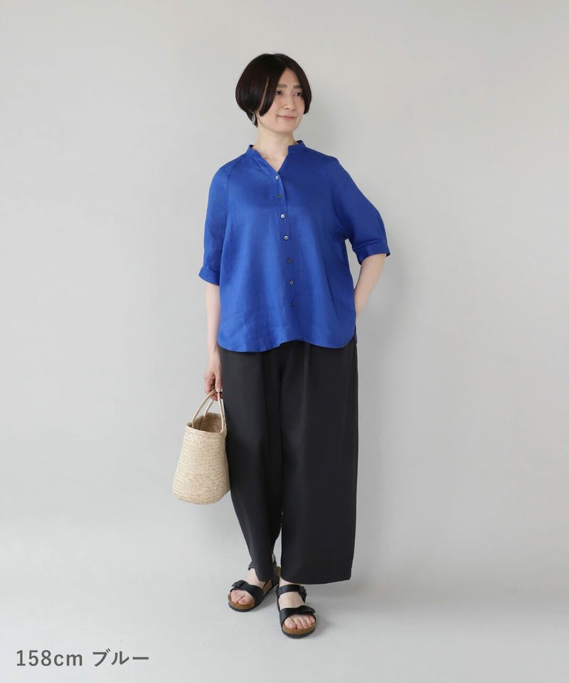 少しハリのあるリネン生地を使用したデザインブラウスです。 スキッパーネックに低めのスタンドカラーを合わせ、すっきりとした仕上り。ラグランスリーブの5分袖が二の腕をカバーしてくれます。後ろは身頃にギャザー、袖にタックを施し、ふんわり広がるフレアシルエットに。前と後ろで印象ががらりと変わる、こだわりの詰まった1着です。ボタンを開けて羽織りとしての着用もおすすめです。