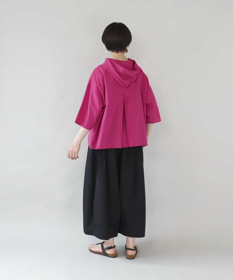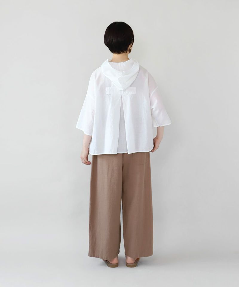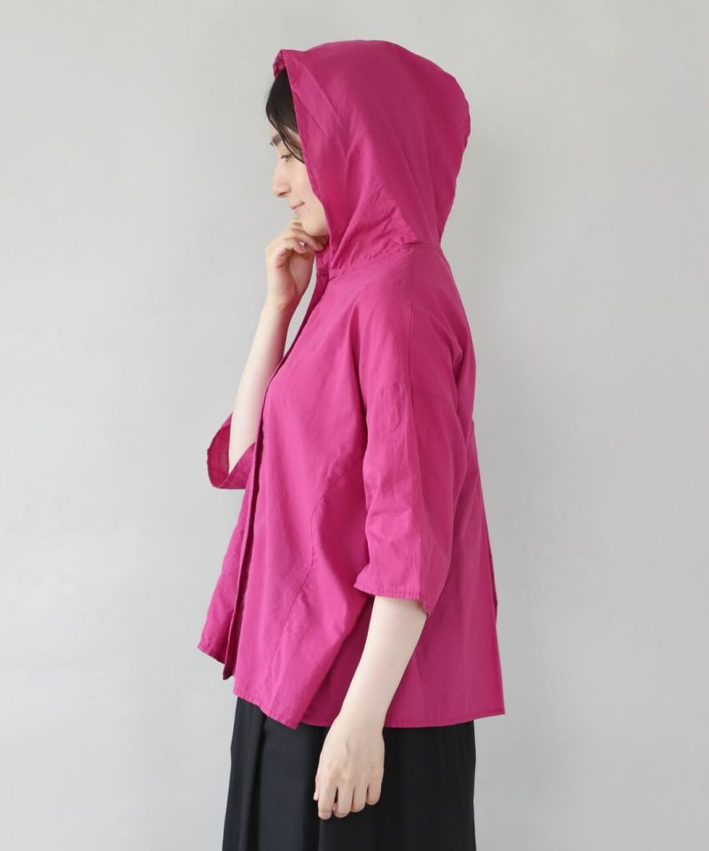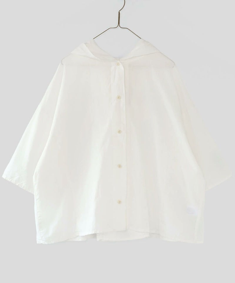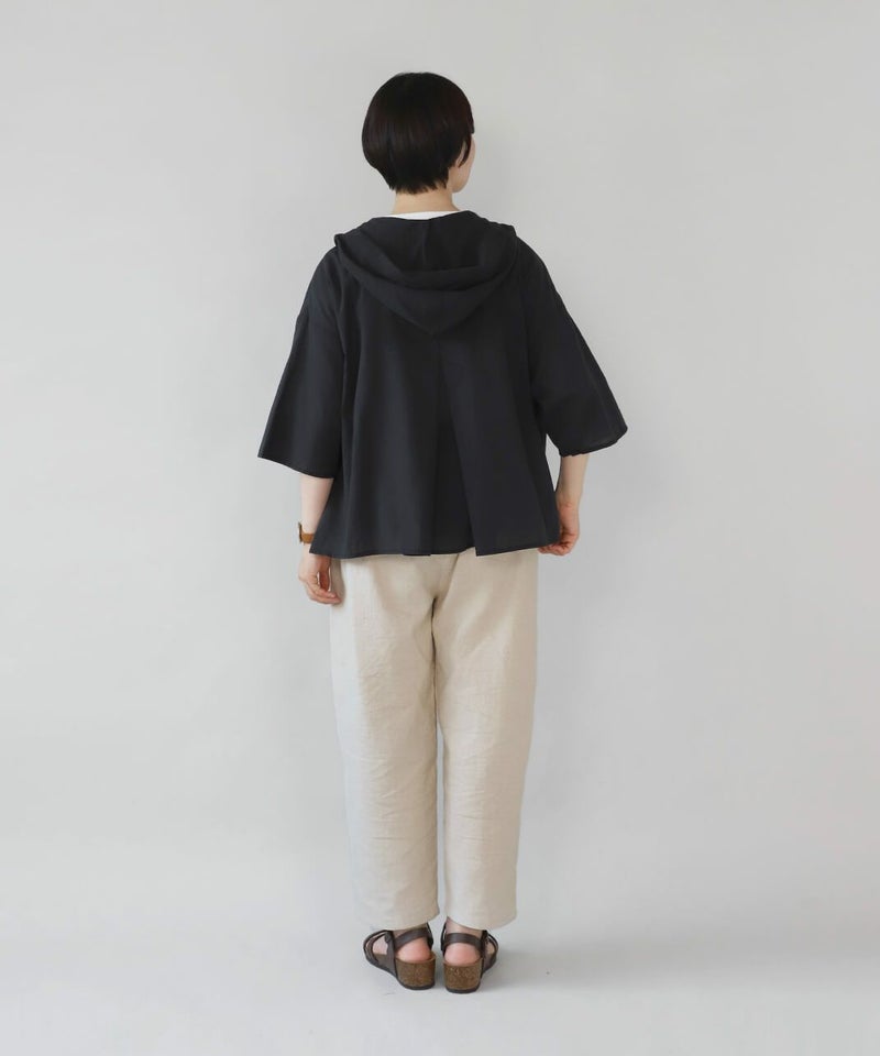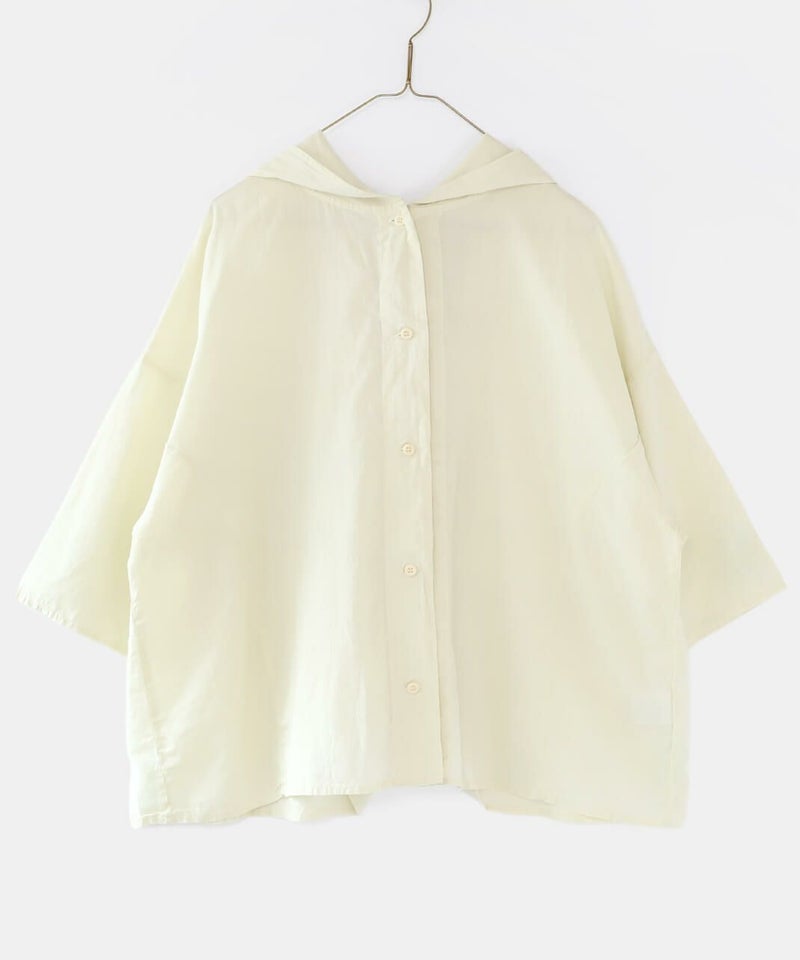 軽く柔らかな肌触りのコットンリネンローン生地を使用したフード付きのブラウスです。 薄手の生地とややAラインのシルエットがさらりとした印象を演出してくれます。さっと羽織れるフード付きのため日よけとしても活躍します。独特な風合いを出すための加工を施し、1枚ごとに違う雰囲気を楽しめます。