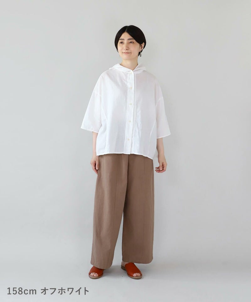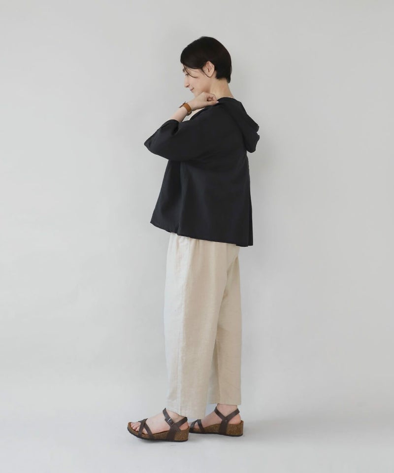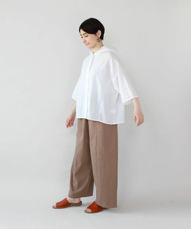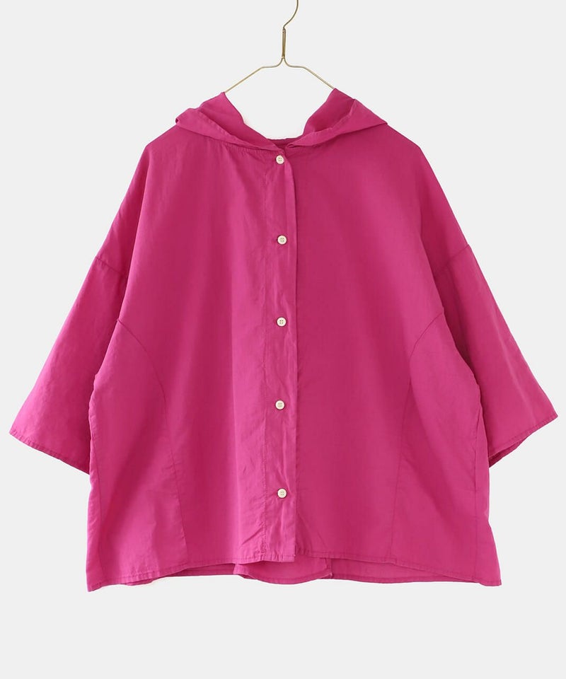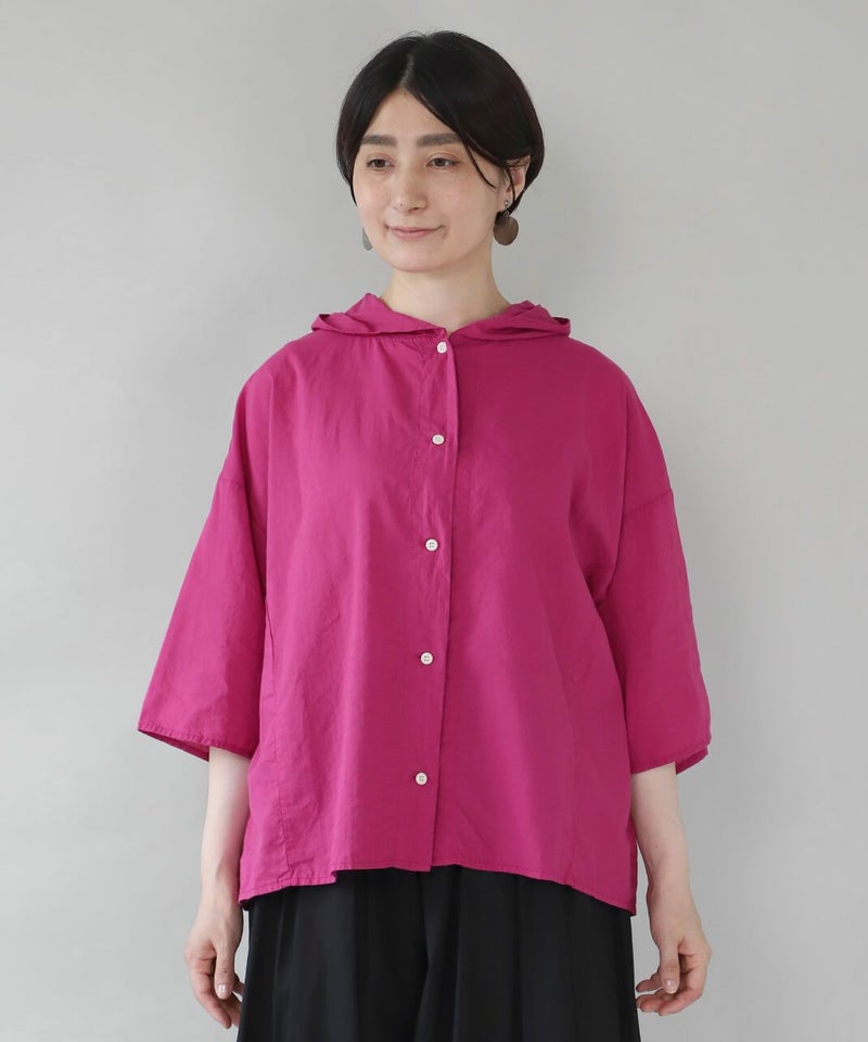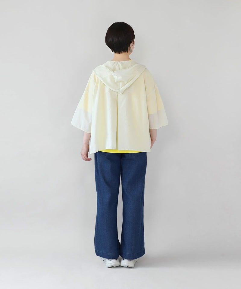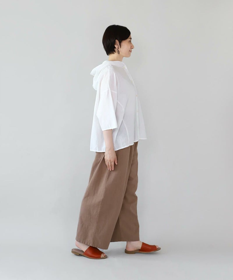 軽く柔らかな肌触りのコットンリネンローン生地を使用したフード付きのブラウスです。 薄手の生地とややAラインのシルエットがさらりとした印象を演出してくれます。さっと羽織れるフード付きのため日よけとしても活躍します。独特な風合いを出すための加工を施し、1枚ごとに違う雰囲気を楽しめます。
