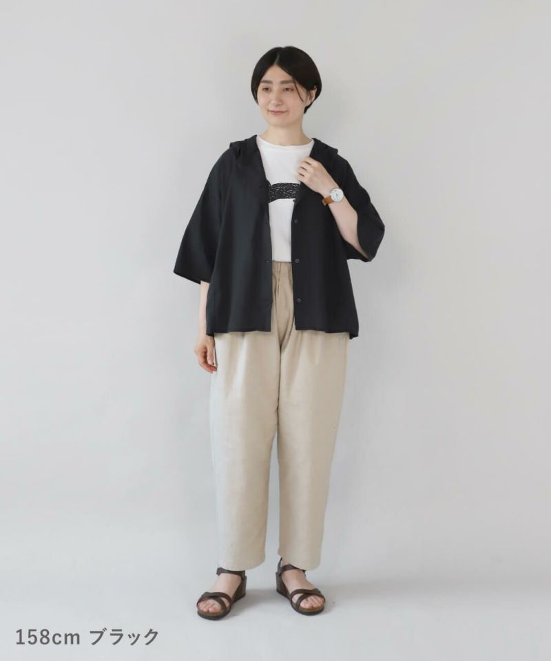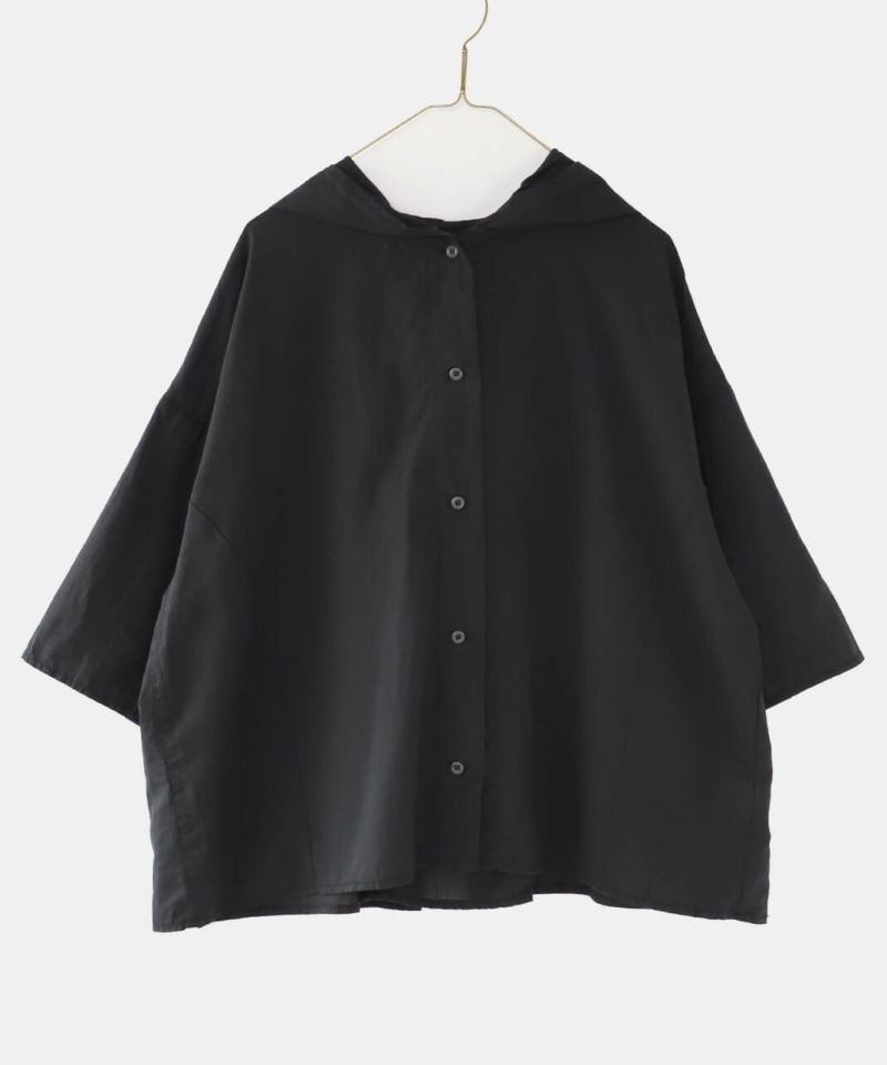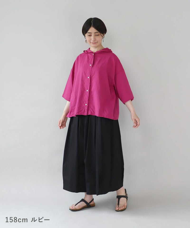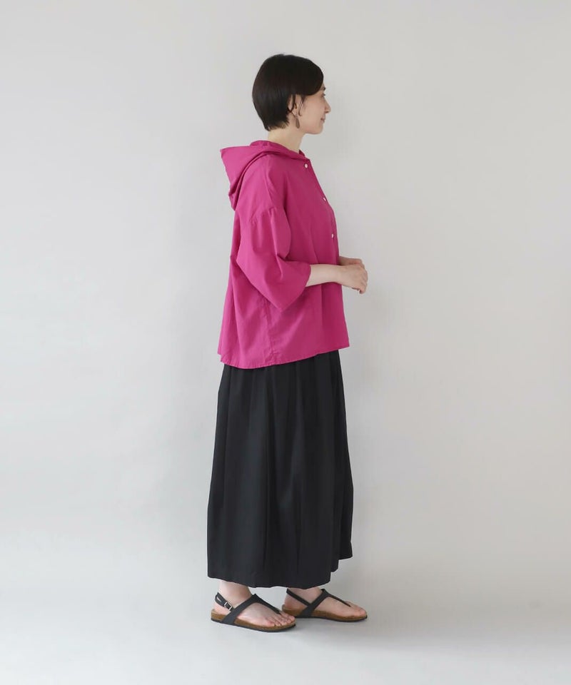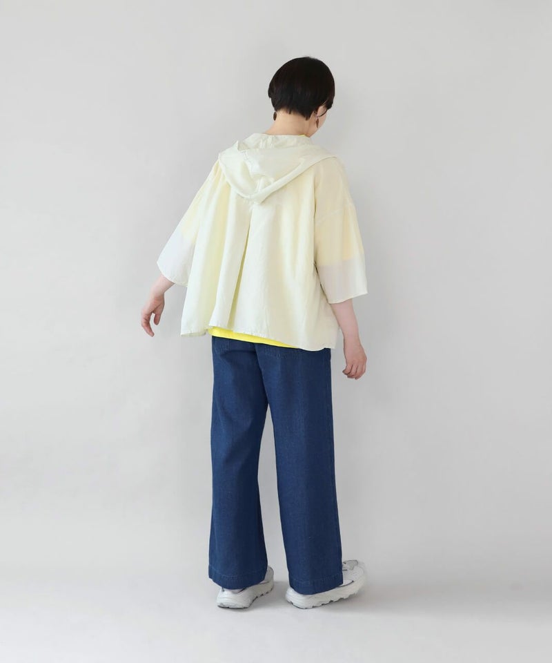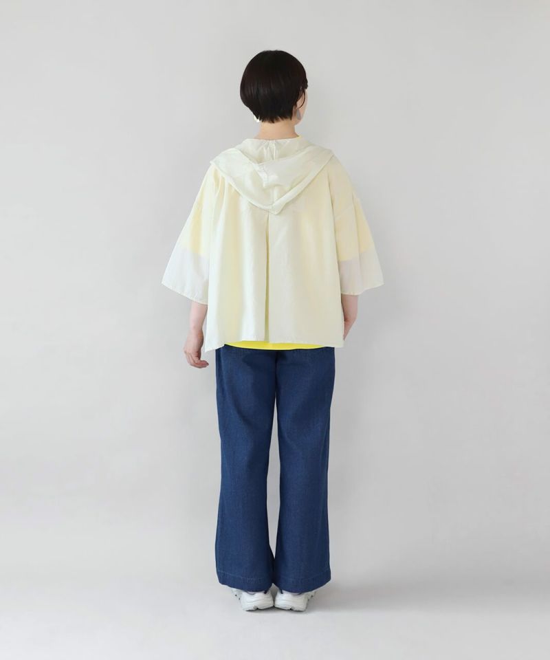 軽く柔らかな肌触りのコットンリネンローン生地を使用したフード付きのブラウスです。 薄手の生地とややAラインのシルエットがさらりとした印象を演出してくれます。さっと羽織れるフード付きのため日よけとしても活躍します。独特な風合いを出すための加工を施し、1枚ごとに違う雰囲気を楽しめます。