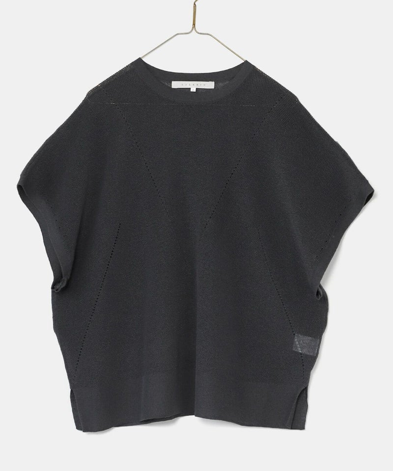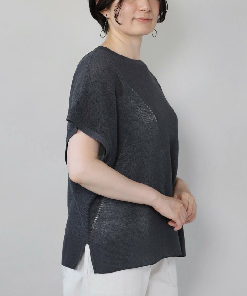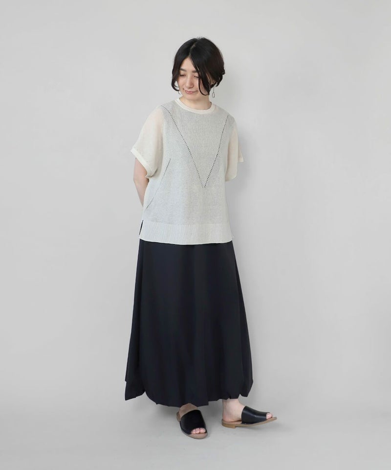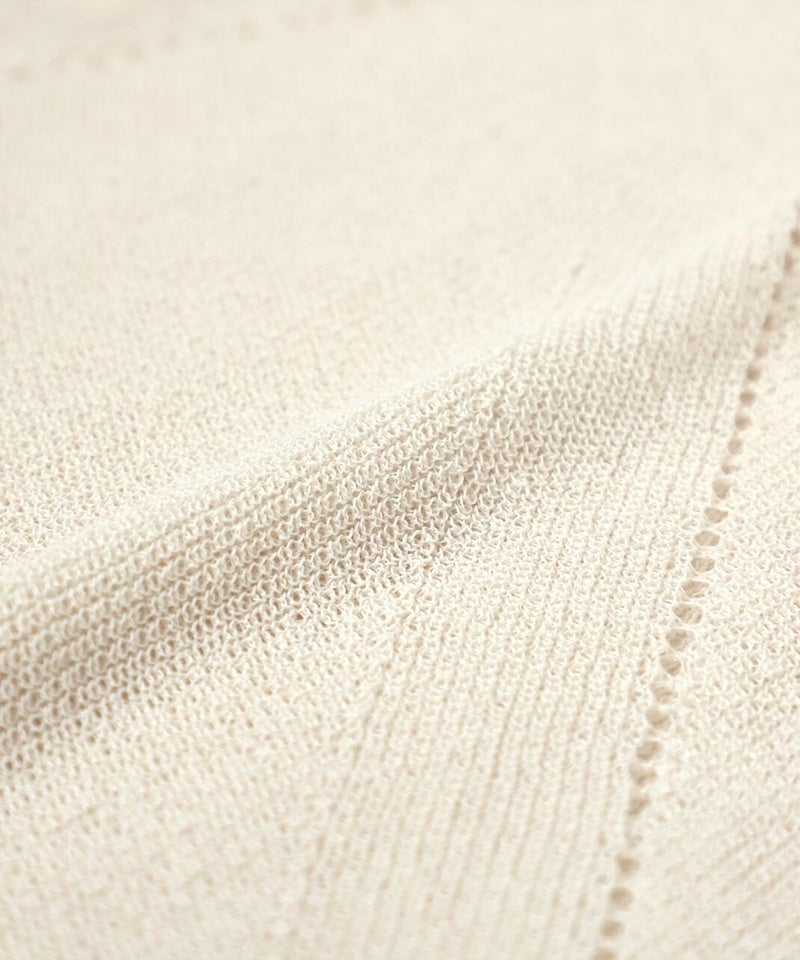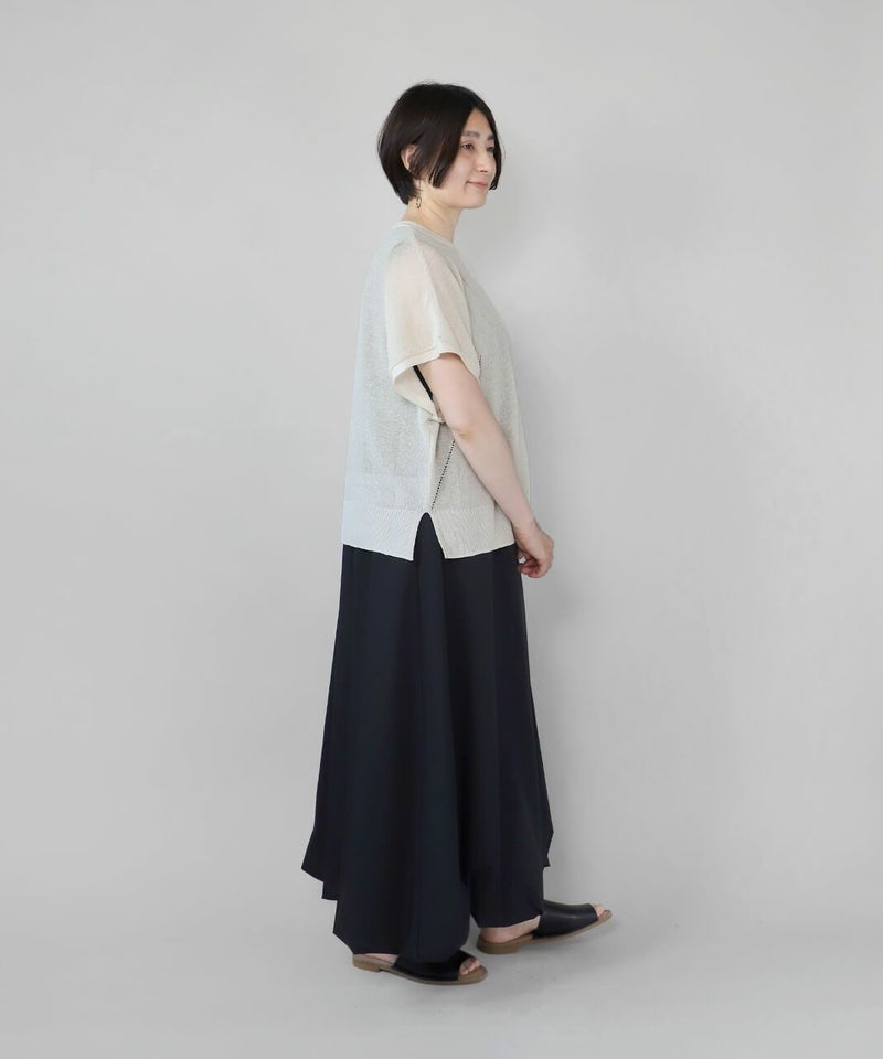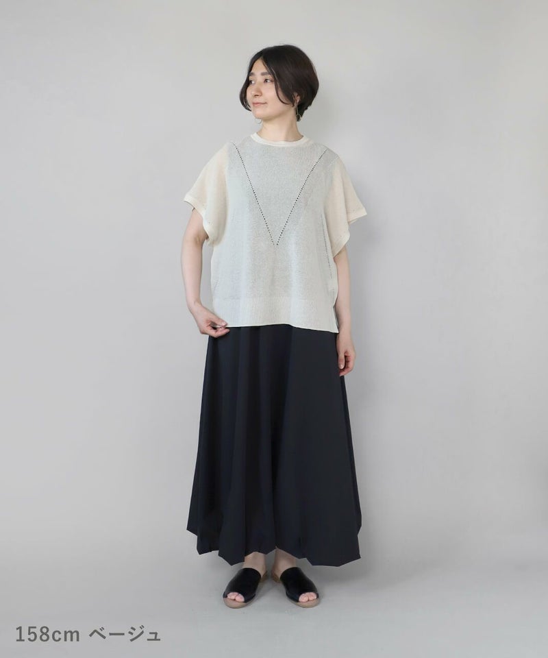麻とリサイクルポリエステルをブレンドした糸を使用し、ふくらみのある畦編みで仕立てたニットベストです。 凹凸のあるシャリ感のドライタッチな肌触りと伸縮性が着心地を良くしてくれます。アイレットでさり気なく模様を入れ、シンプルながらもデザインにもこだわりが。タンクトップやカットソーはもちろん、ワンピースに合わせても様になる1着です。 ニット製品ながらご自宅で洗濯が可能なのも嬉しいポイントです。