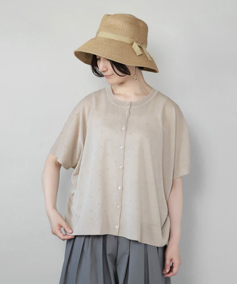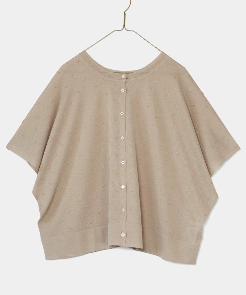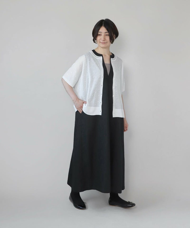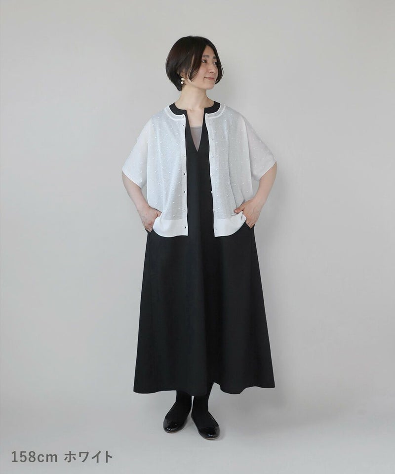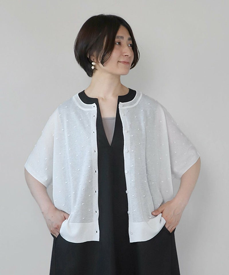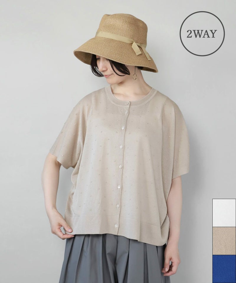 レーヨンとポリエステルのさらりとドライな質感の2WAYカーディガンです。 落ち感のある素材で肌に張り付かず、涼しく着用できます。前後着用可能なドット柄と無地の2WAY仕様で、まったく違うデザインが嬉しいポイント。カットソーやタンクトップ、ワンピースなど幅広いアイテムとも合わせやすく、コーディネートの幅が広がります。 夏の冷房対策にもおすすめです。