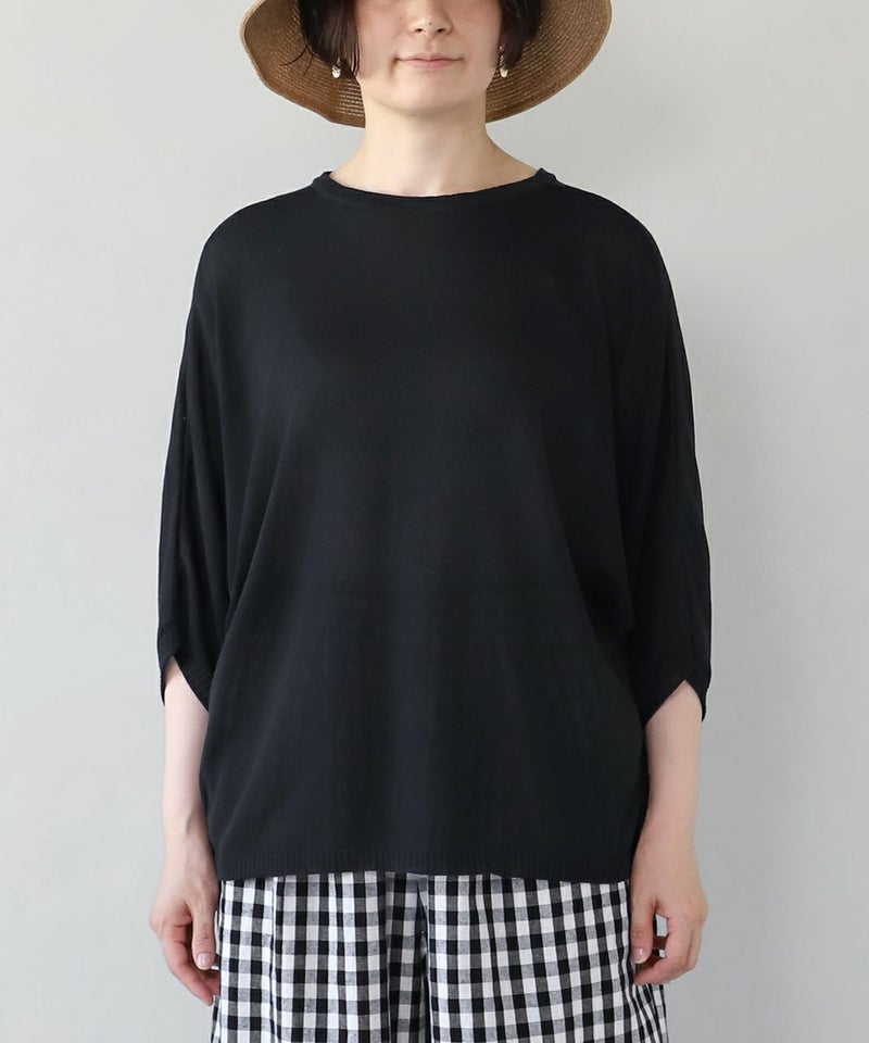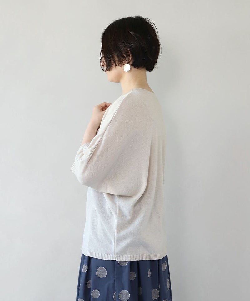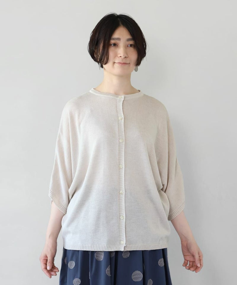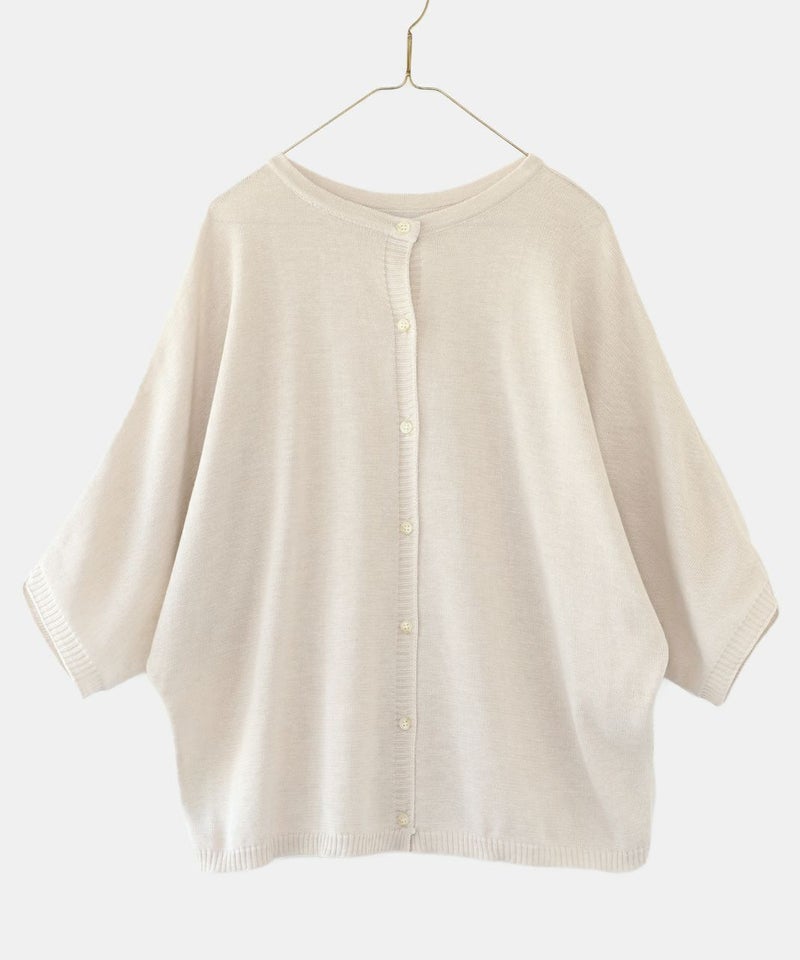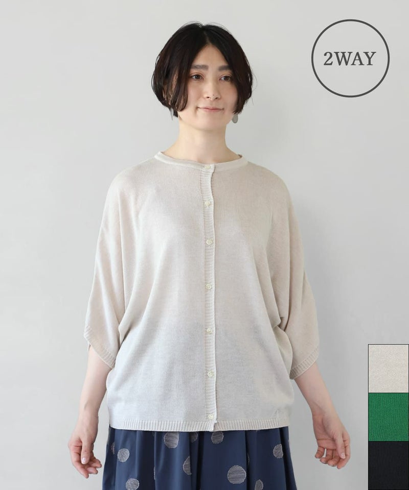しなやかな肌触りの薄手レーヨン混紡ニットで仕立てた2WAYのカーディガンです。 シンプルなクルーネックにドルマンスリーブでゆったりとした着心地。カーディガンとプルオーバーの前後2WAY仕様で、雰囲気を変えて着まわしを楽しめます。 5分袖は二の腕をカバーしながら、夏の日除けや冷房対策にも重宝します。季節の変わり目にも活躍します。 日本製なのも嬉しいポイントです。