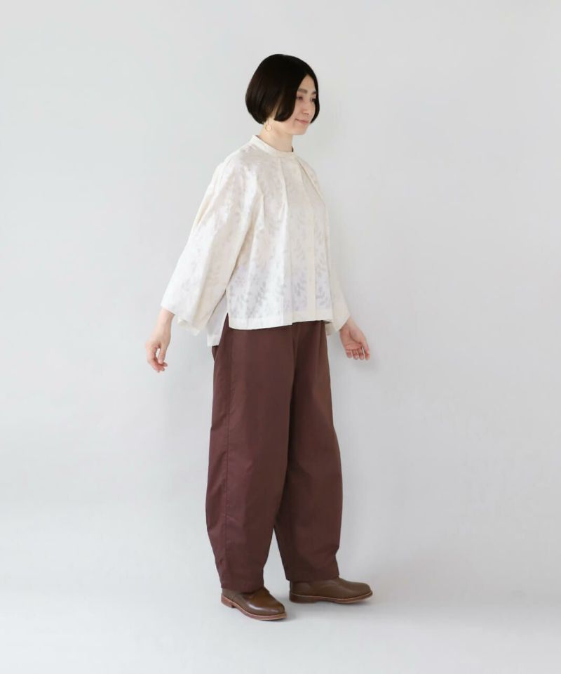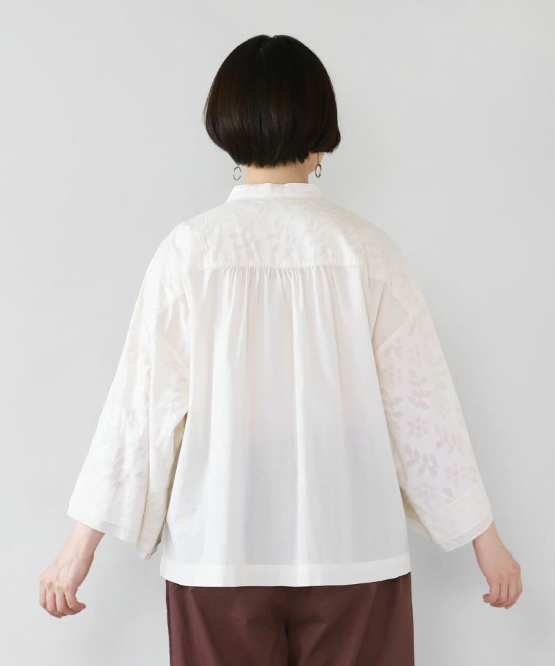 シアー感のあるジャガード柄を活かしたブロードコットン素材のブラウスです。 フレアシルエットにデザインされた袖が印象的な1着です。リンドウの花モチーフのジャガード柄がシックできちんとした印象を演出してくれます。すっきりとしたバンドカラーとワイドな身頃でゆったりとした着心地です。後ろは無地に切替え、すっきりとしています。ブラウスとしてはもちろん、ボタンを開けて羽織りとしての着用もおすすめです。