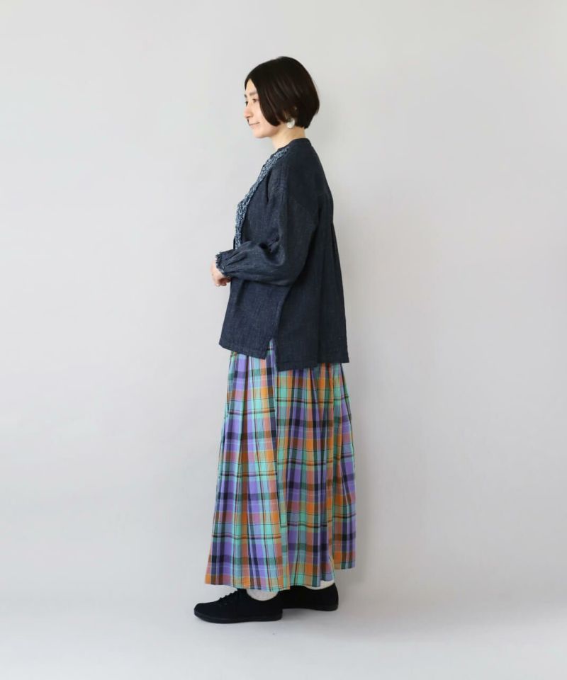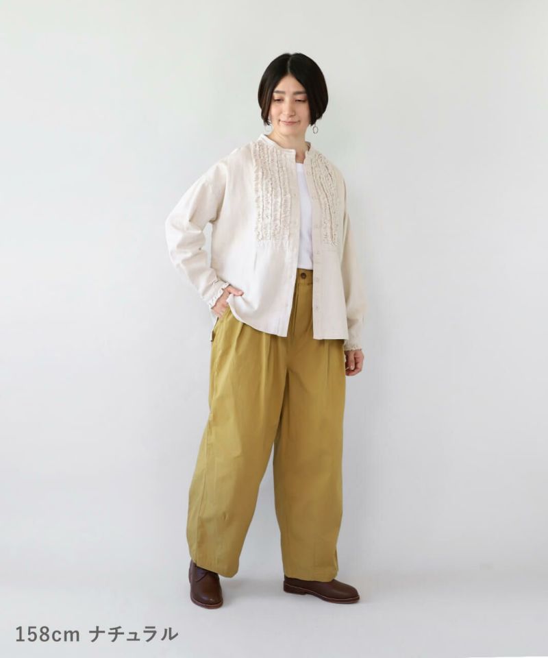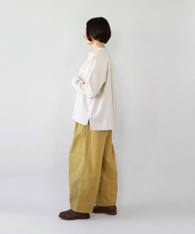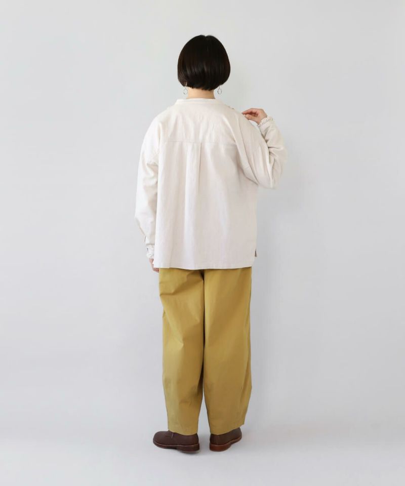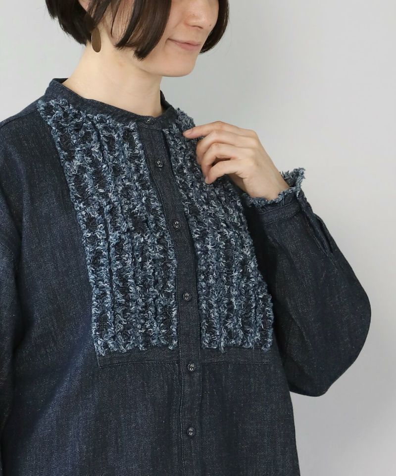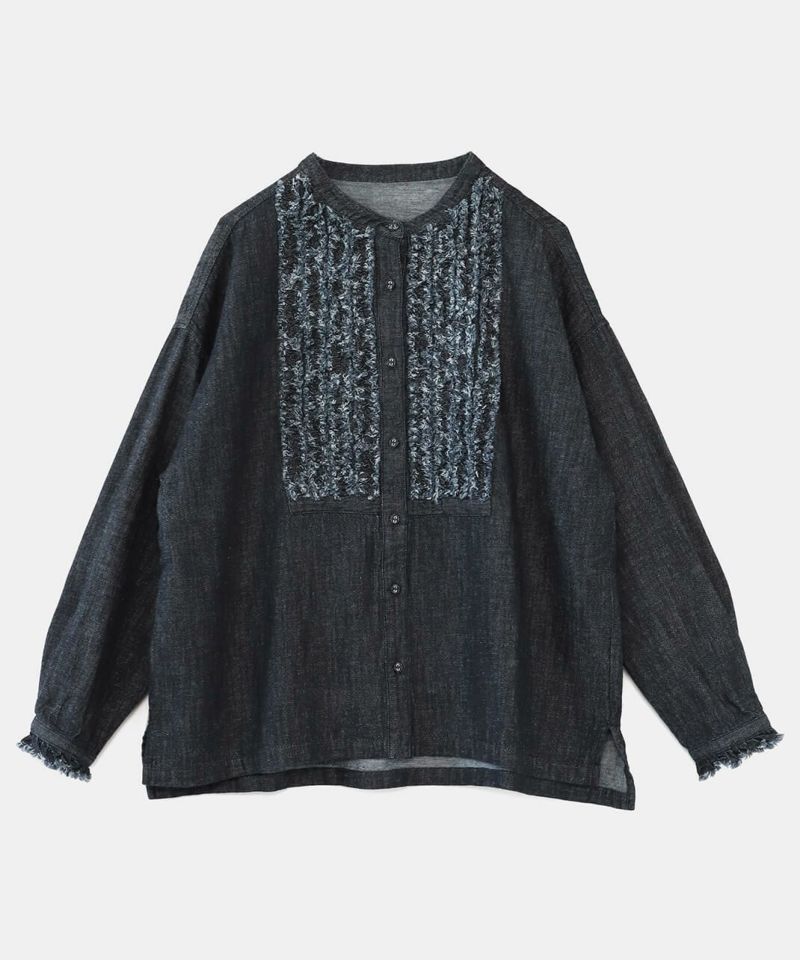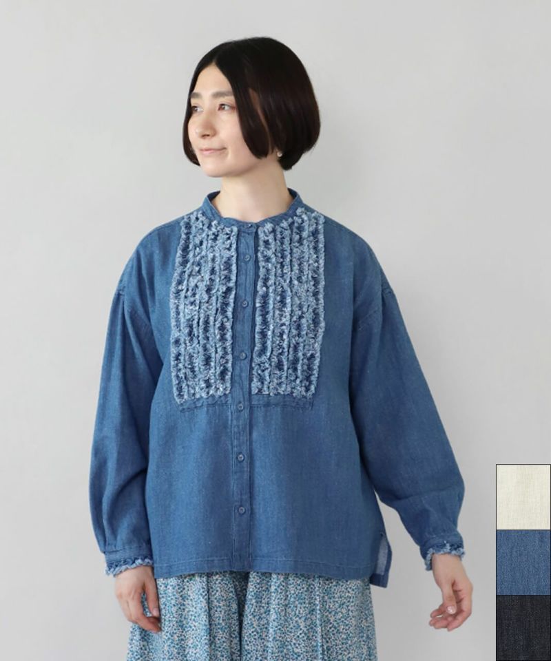 やわらかな肌触りのコットンリネンの甘撚りデニムを使用したブラウスです。 立体的なフリンジフリルのデザインが顔周りを華やかにしてくれます。シンプルなバンドカラーにほどよいゆとりの身幅でリラックスした着心地。前後差のついた少し長めの着丈とサイドスリットで抜け感のある着こなしに。ブラウスとしてはもちろん、ボタンを開けて軽い羽織りとしての着用もおすすめです。