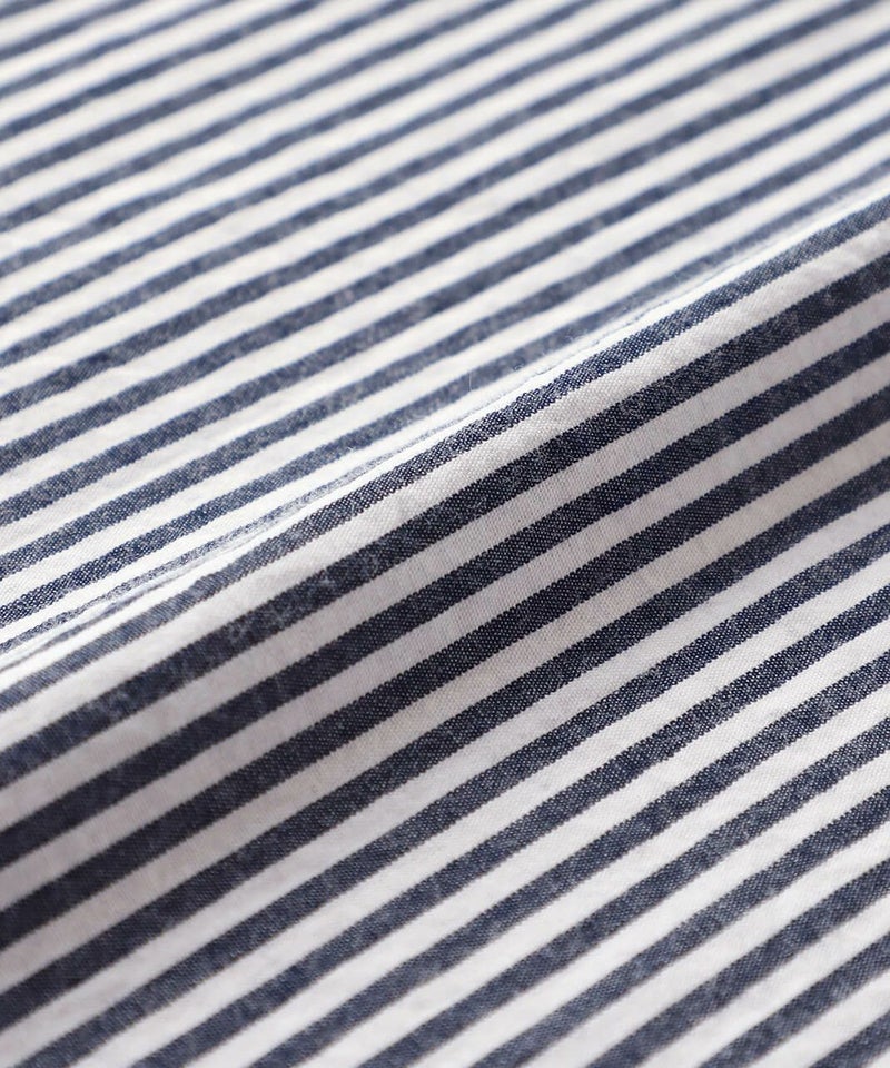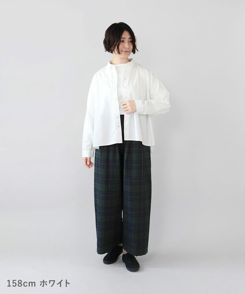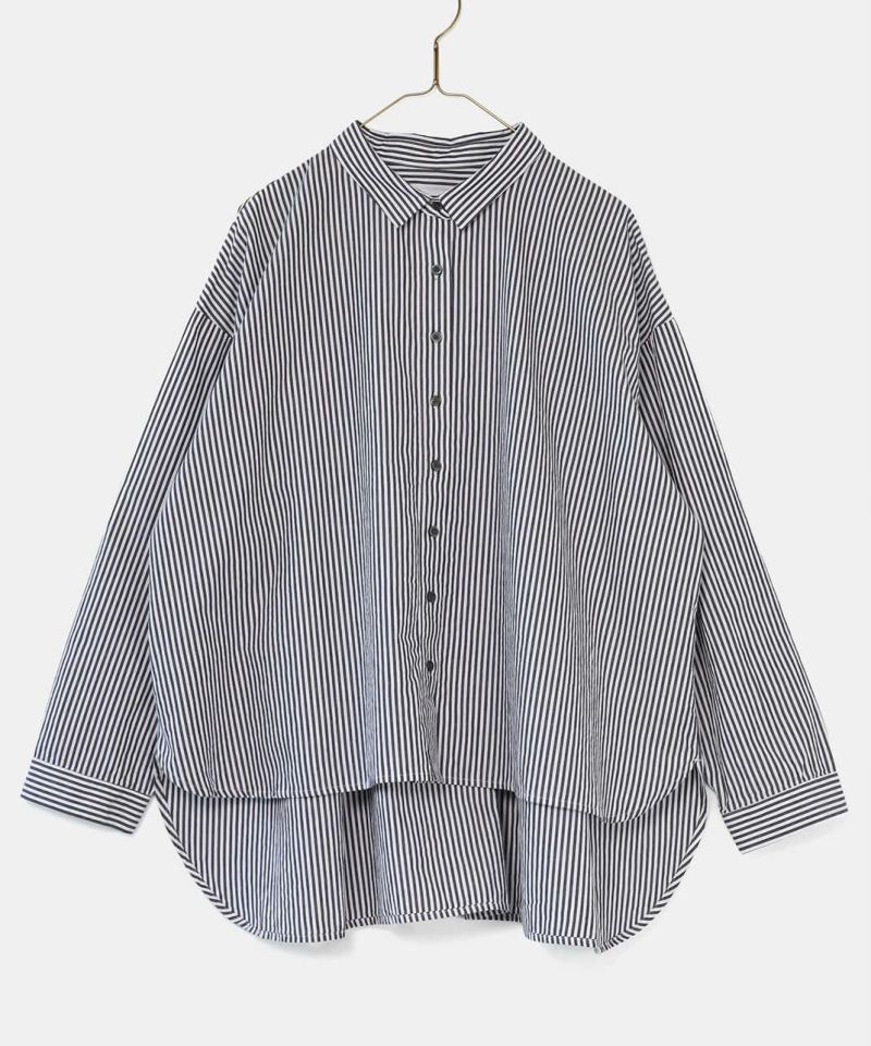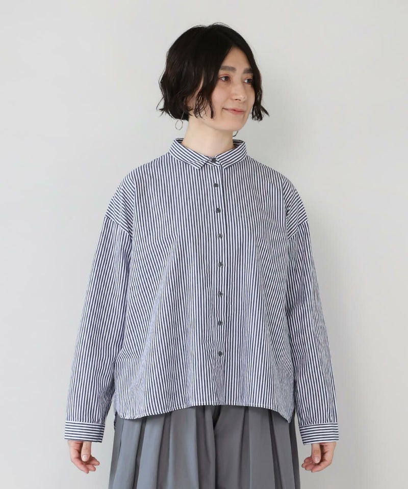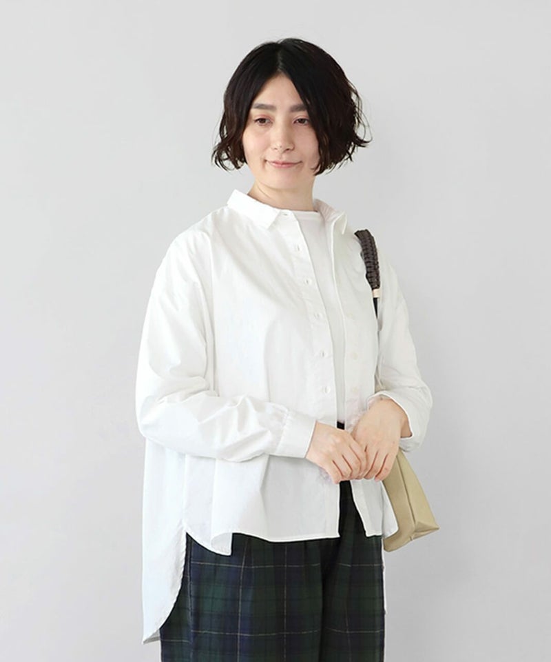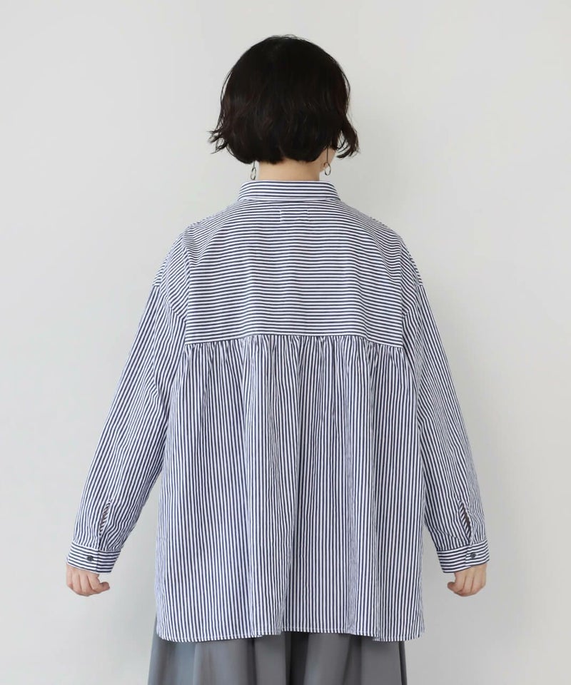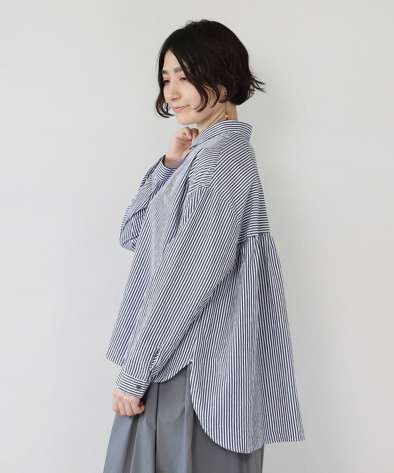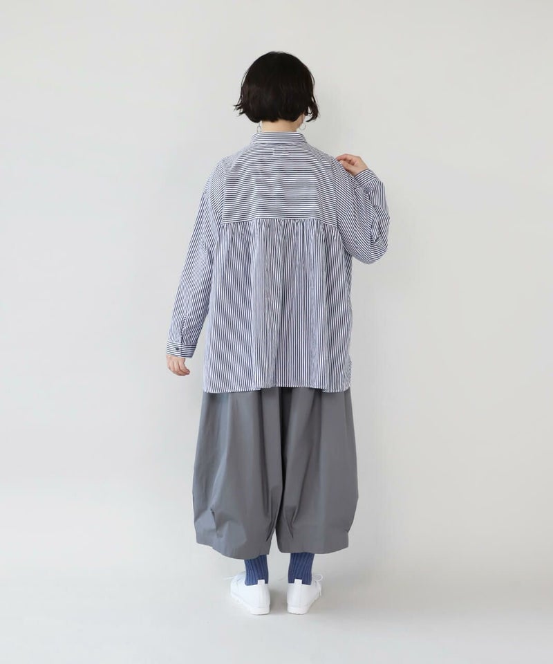 洗いざらしのようなナチュラルな風合いのコットン素材を使用したブラウスです。 前はシンプルな印象で、後ろはたっぷりと入ったギャザーがふんわりと広がるシルエット。小さめの襟がきちんと感を演出してくれます。裾はラウンドカットで前後差があり、気になる体型もカバーしてくれます。 どんなアイテムにも合わせやすい1着です。