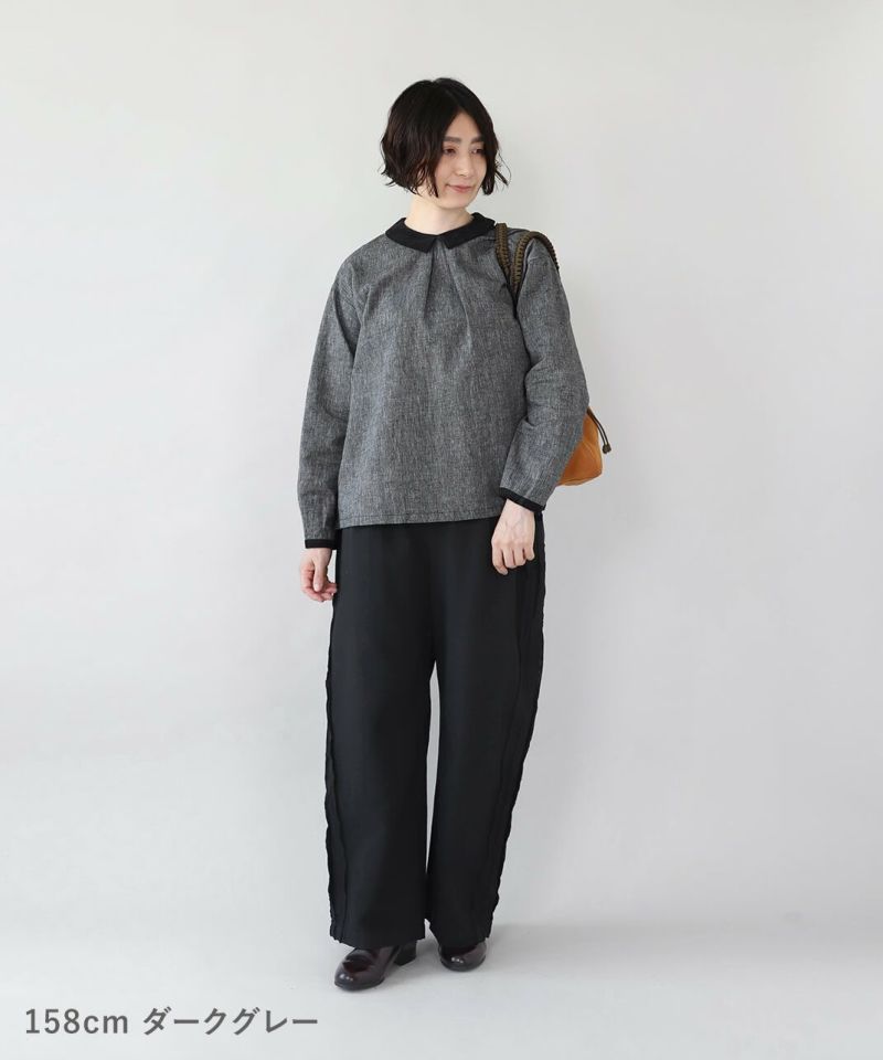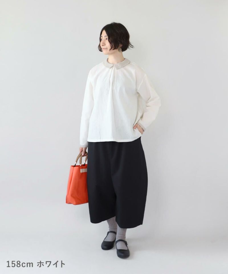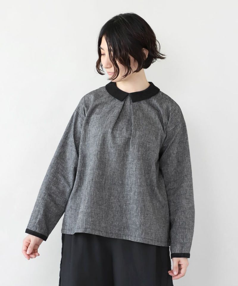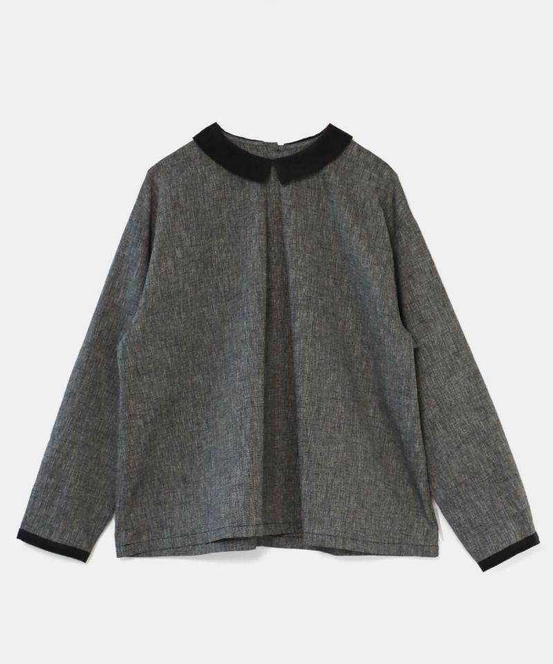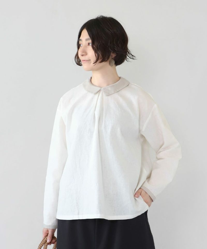 ナチュラルな風合いのコットンリネンのブラウスです。 襟と袖先がコーデュロイの配色でクラシカルに、さらにフロントのタックと後ろのくるみボタンがプラスして可愛らしい印象に。 ほどよいサイズ感でシンプルなコーディネートにおすすめです。
