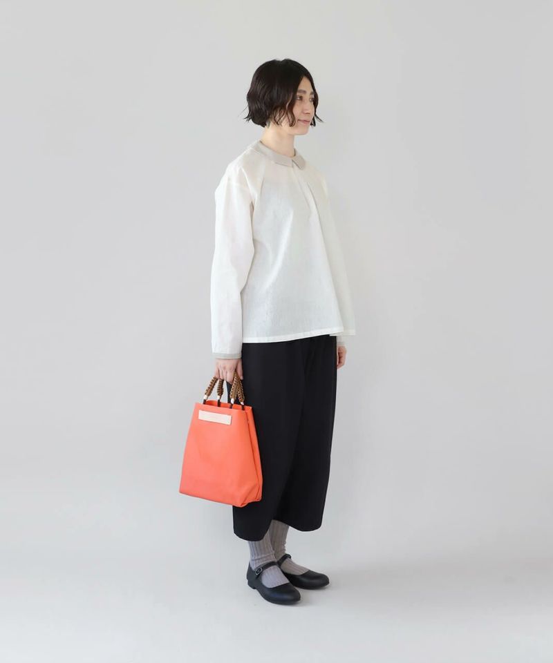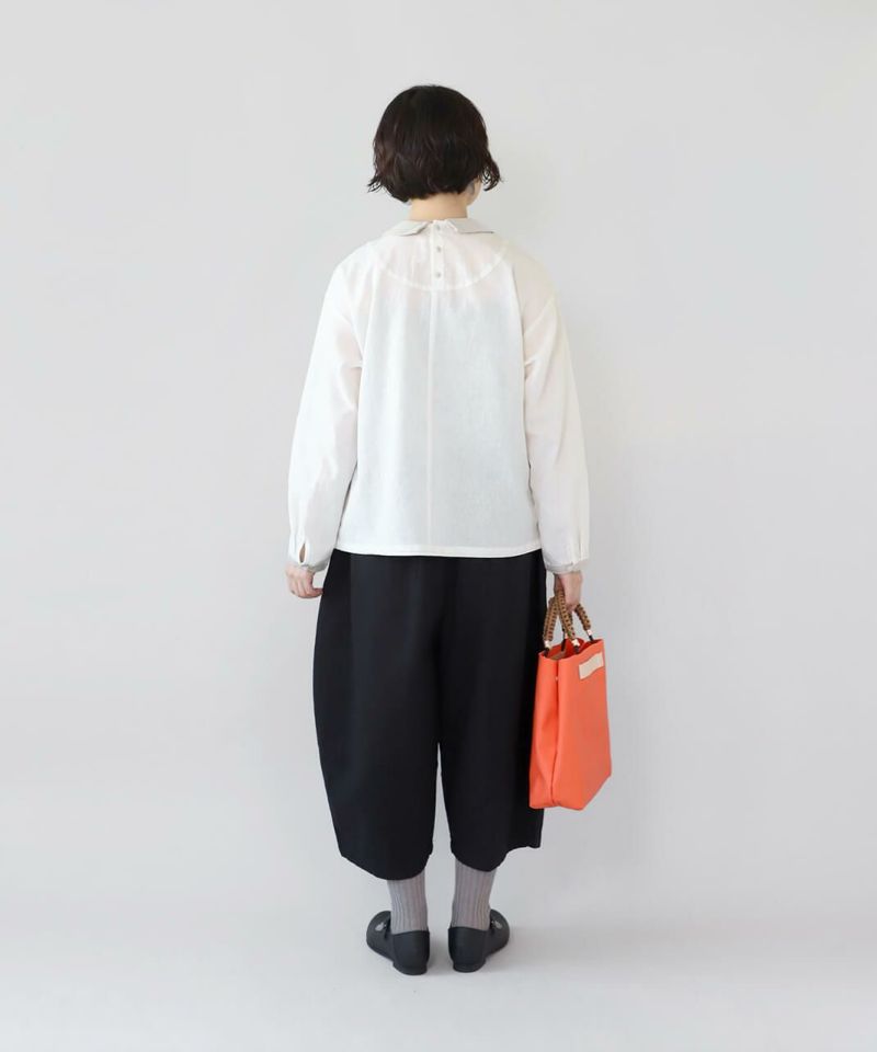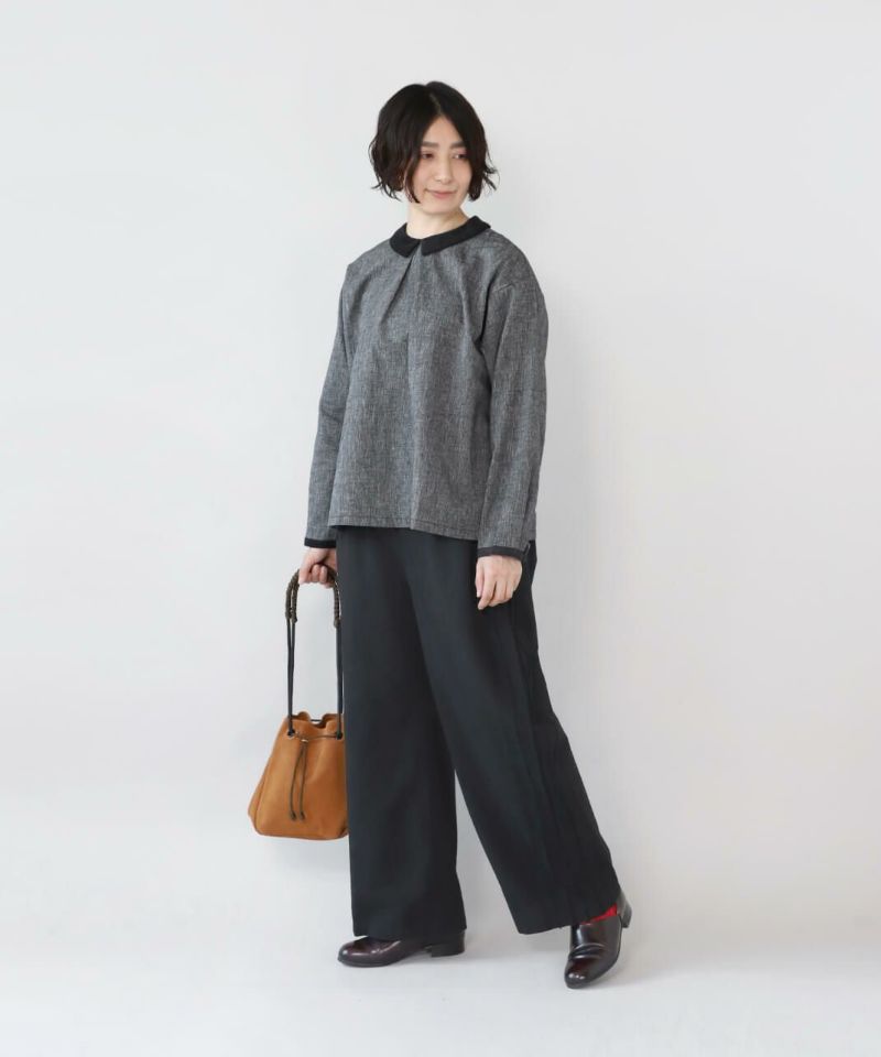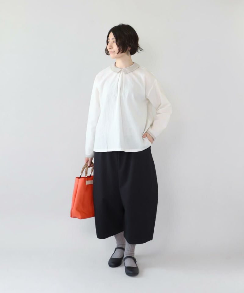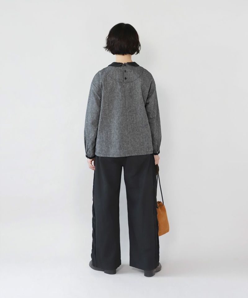 ナチュラルな風合いのコットンリネンのブラウスです。 襟と袖先がコーデュロイの配色でクラシカルに、さらにフロントのタックと後ろのくるみボタンがプラスして可愛らしい印象に。 ほどよいサイズ感でシンプルなコーディネートにおすすめです。