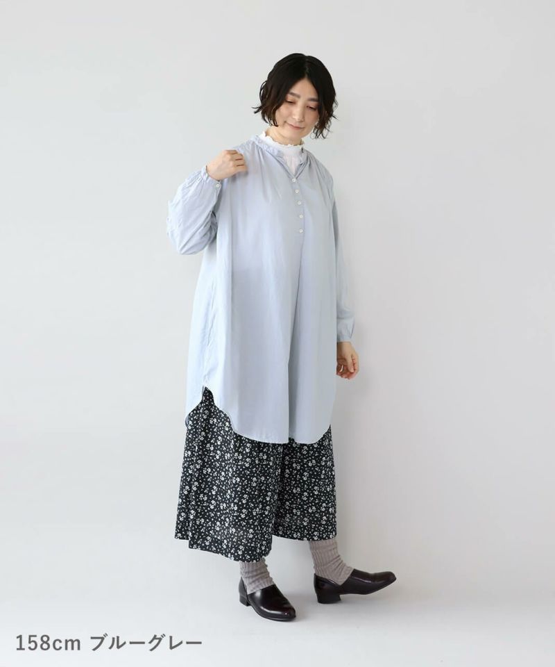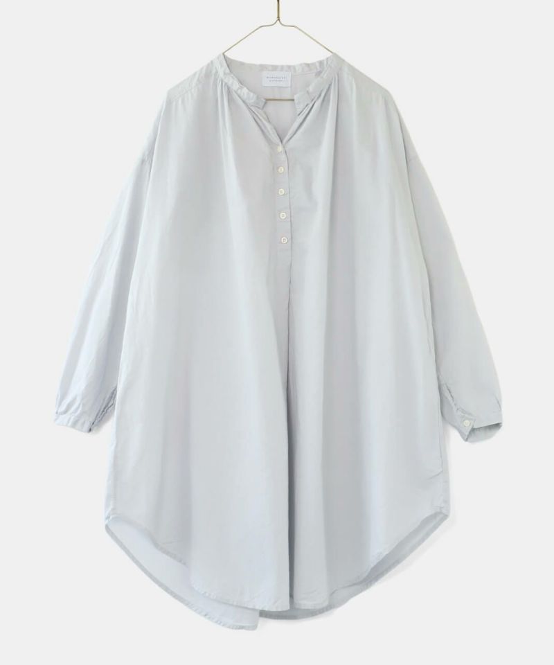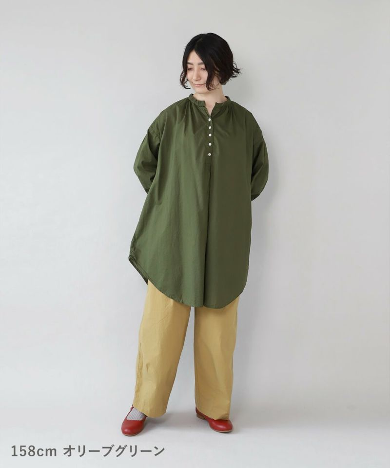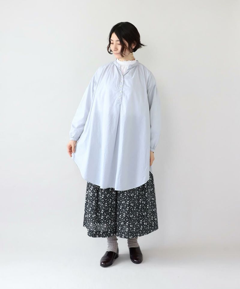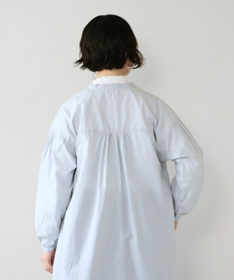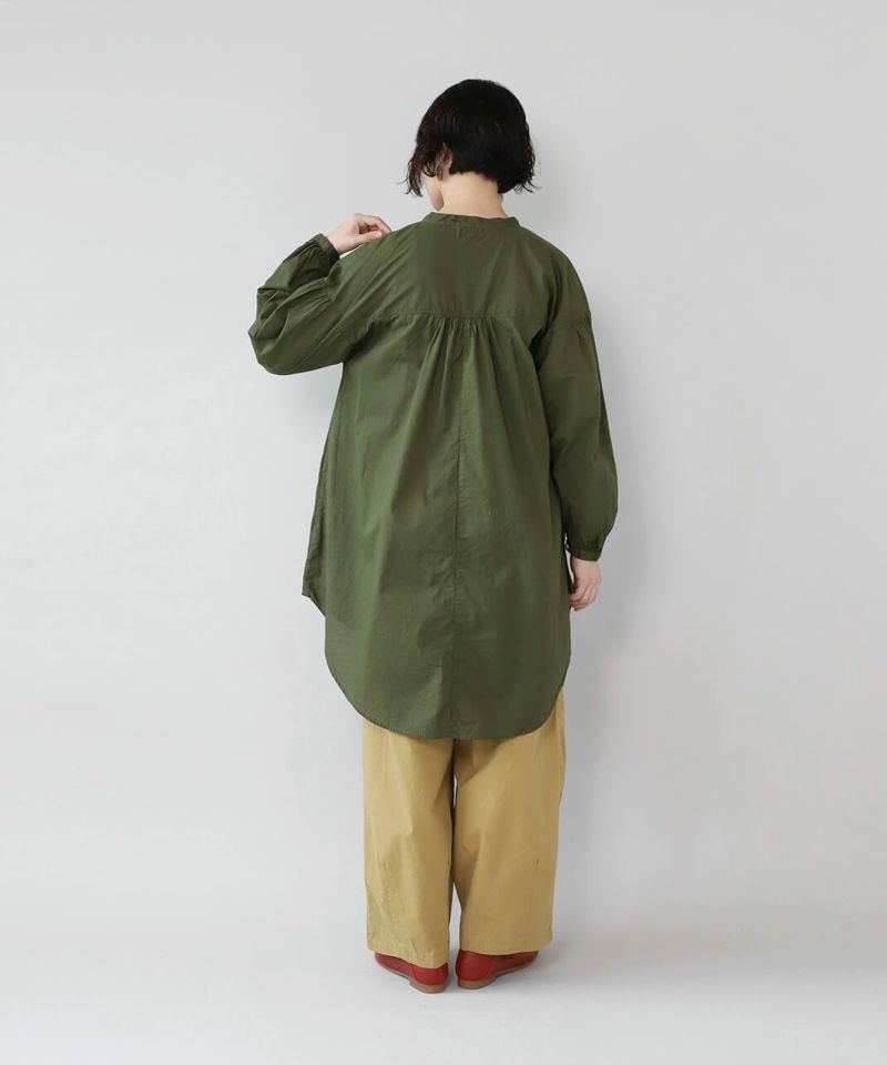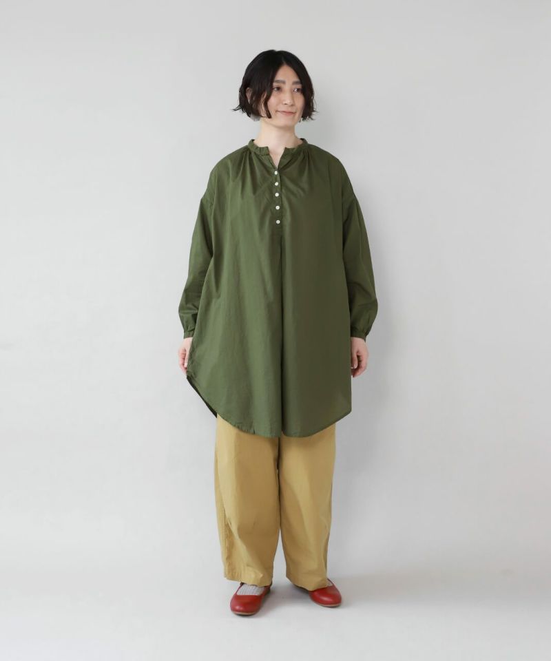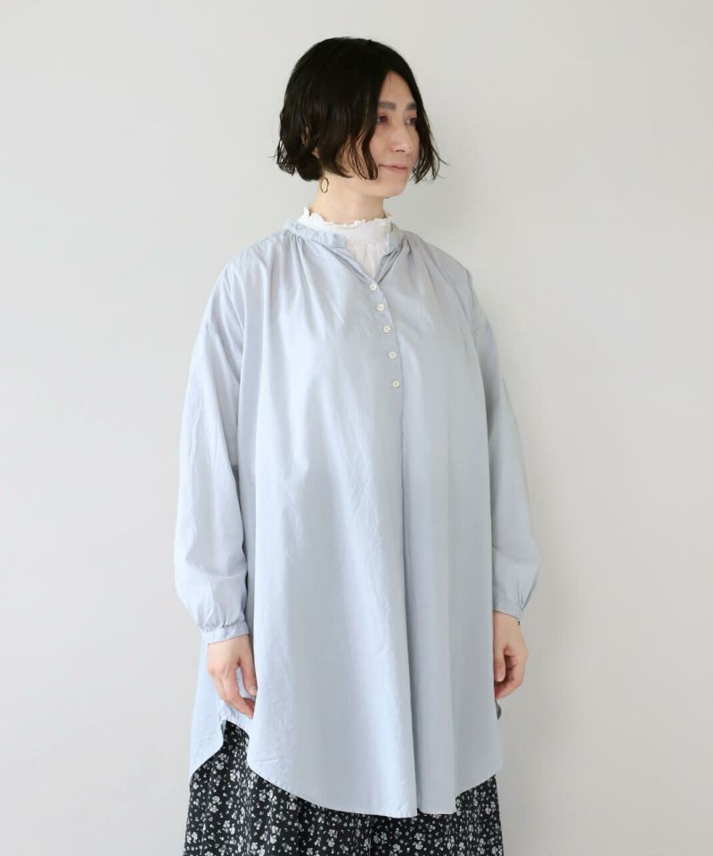 軽やかな肌触りと通気性の良いコットンローン素材を使用したチュニックです。 首元はキーネックで抜け感をつくり、ドロップショルダーとワイドな身頃でゆったりとした着心地に。後ろにギャザーを施し緩やかなAラインシルエットに仕上げました。気になる体型をさりげなくカバーしてくれるチュニック丈です。少しの透け感とふんわり揺れるラウンドヘムがシンプルで軽やかな印象に。ベストやカーディガンとの重ね着もかさばらず、コーディネートの幅を広げてくれます。