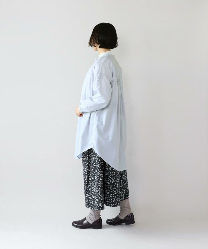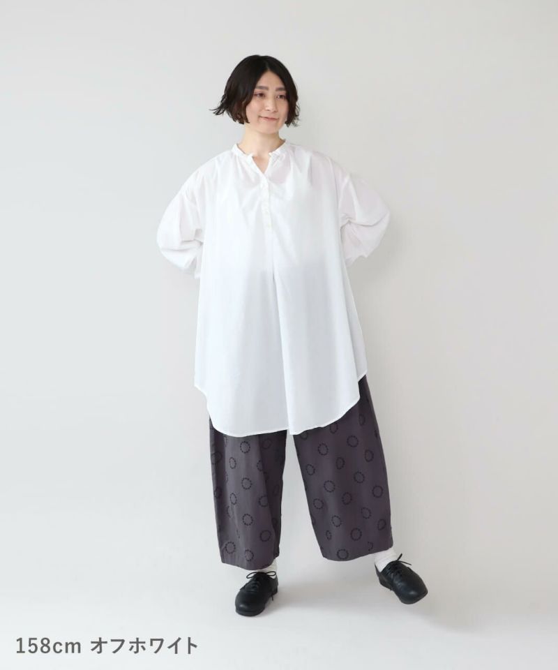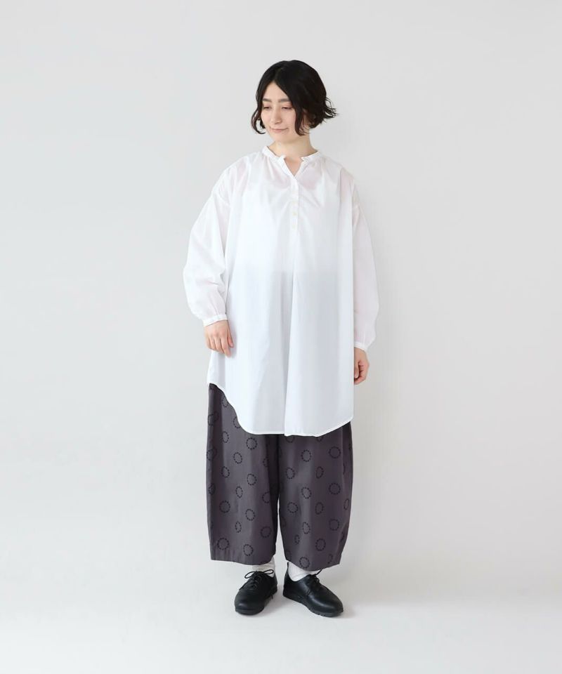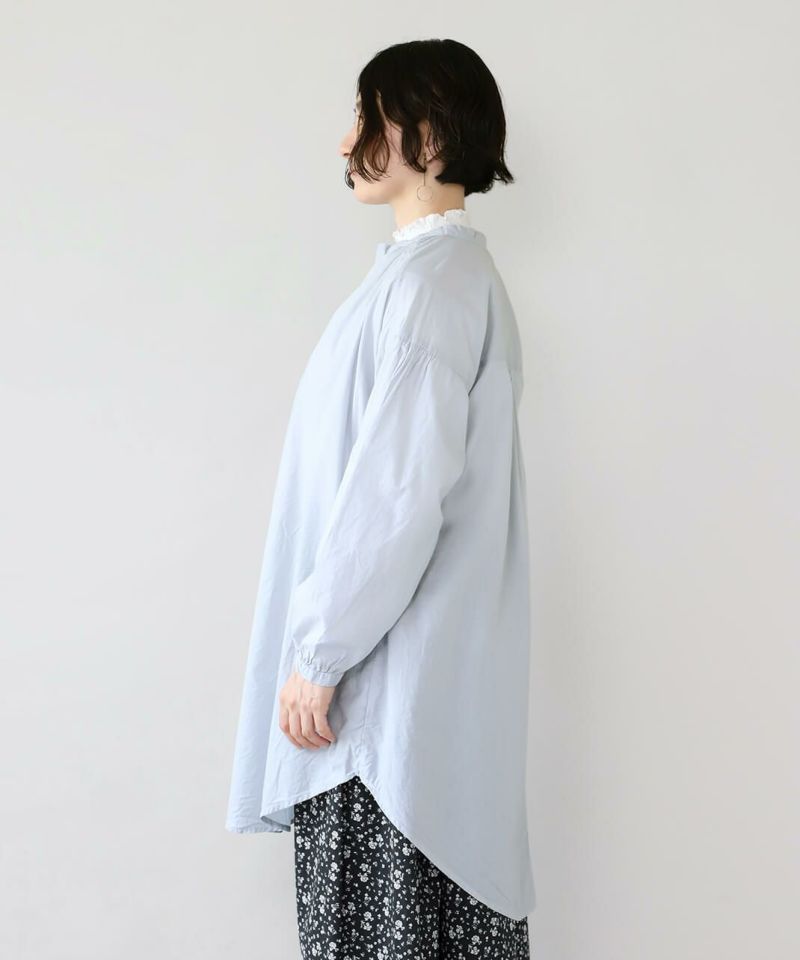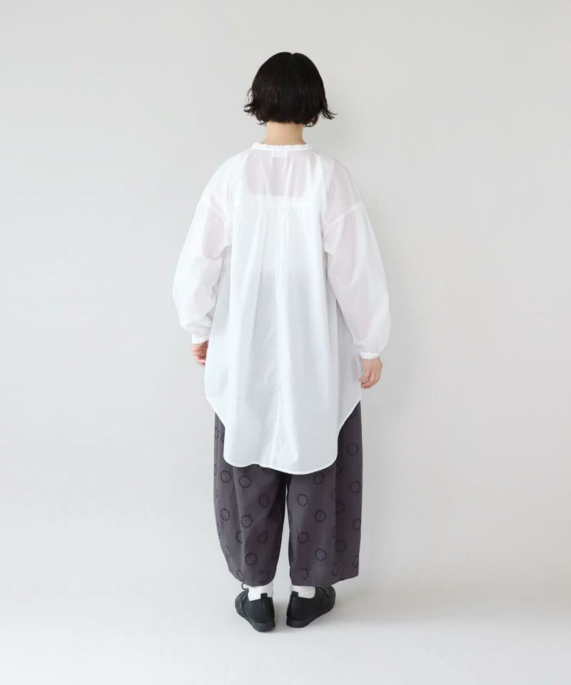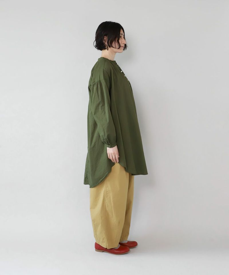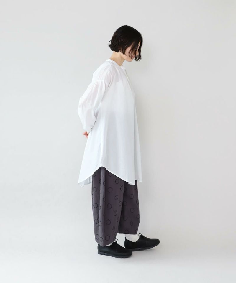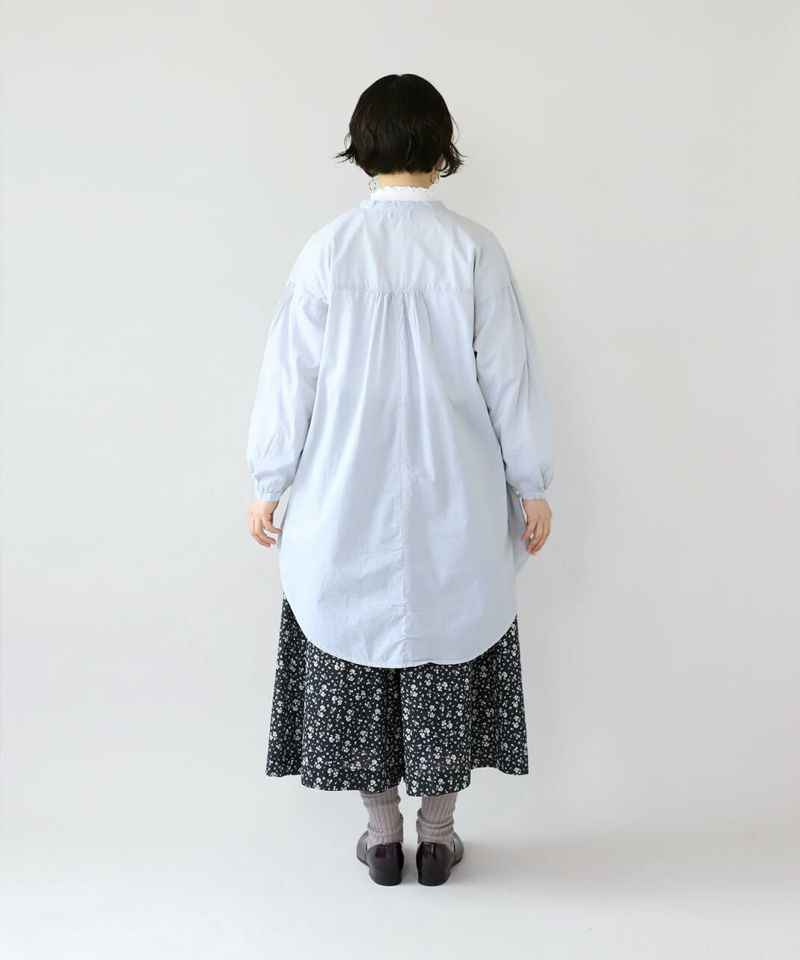 軽やかな肌触りと通気性の良いコットンローン素材を使用したチュニックです。 首元はキーネックで抜け感をつくり、ドロップショルダーとワイドな身頃でゆったりとした着心地に。後ろにギャザーを施し緩やかなAラインシルエットに仕上げました。気になる体型をさりげなくカバーしてくれるチュニック丈です。少しの透け感とふんわり揺れるラウンドヘムがシンプルで軽やかな印象に。ベストやカーディガンとの重ね着もかさばらず、コーディネートの幅を広げてくれます。