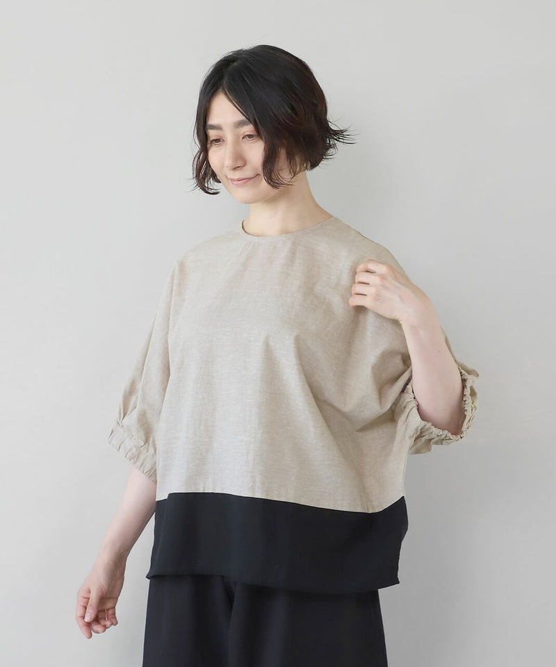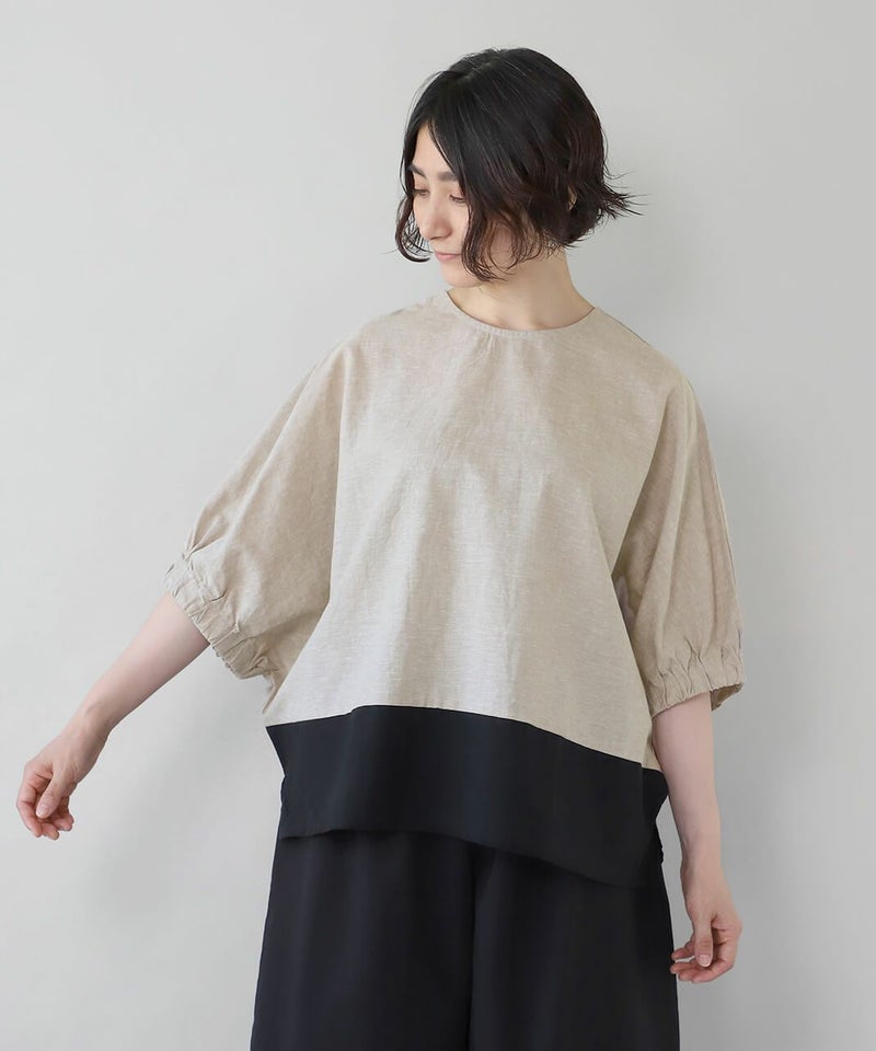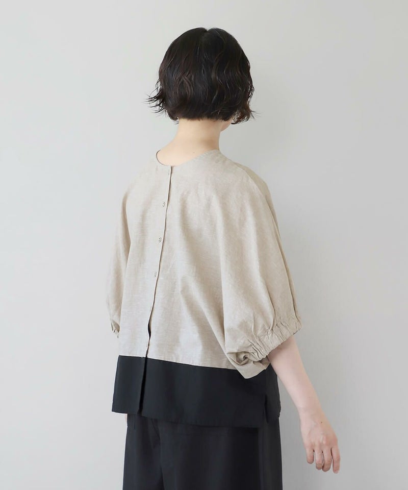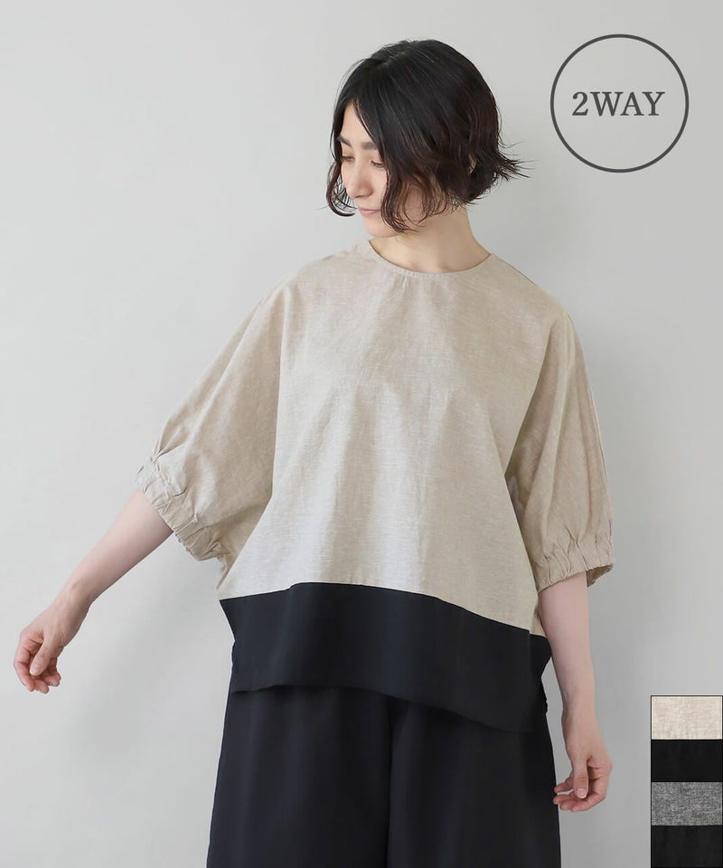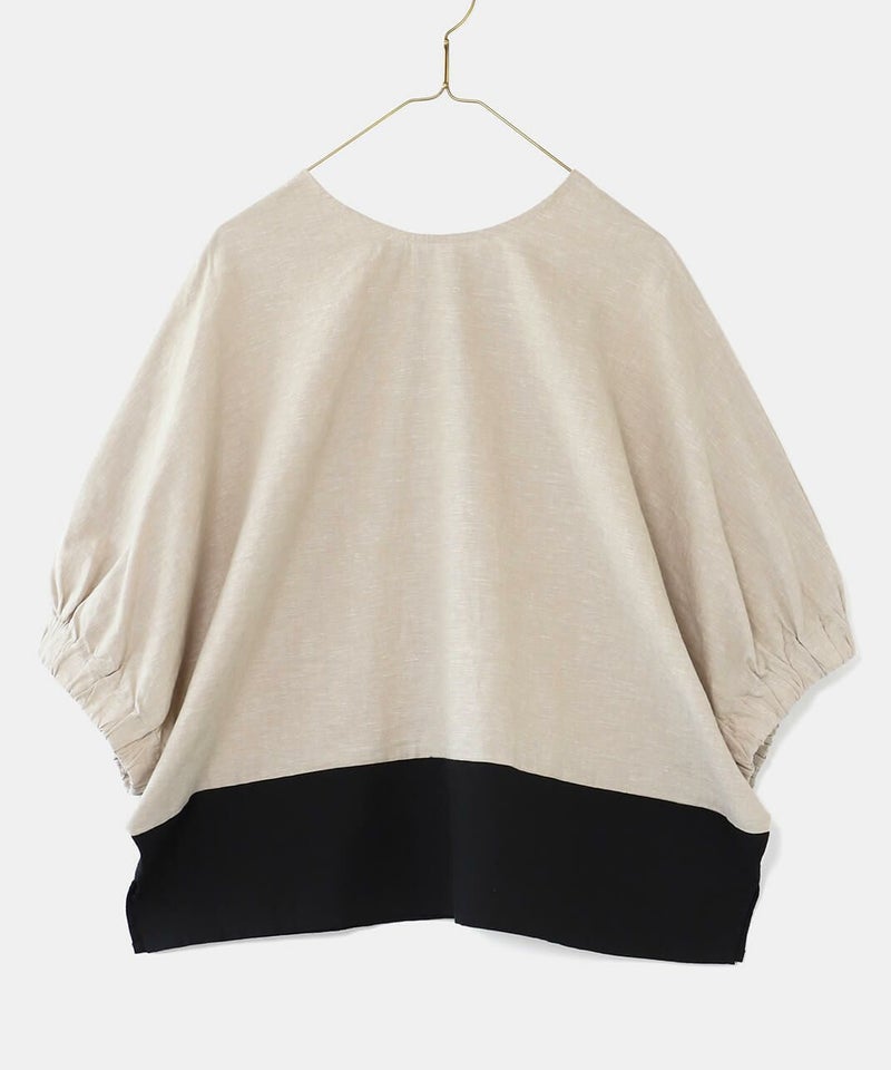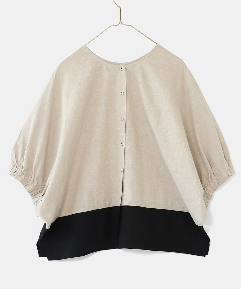 コットンリネン素材を使用した2WAYドルマンブラウスです。 クルーネックにワイドな身頃とドルマンショルダーでゆったりとした着心地。プルオーバーとしてはもちろん、ボタン付きのブラウスとしても着用可能な2WAY仕様です。裾の配色切替えが目を惹き、コーディネートのアクセントになります。インナーにカットソーやワンピースを合わせて軽い羽織りとして着こなすのもおすすめです。